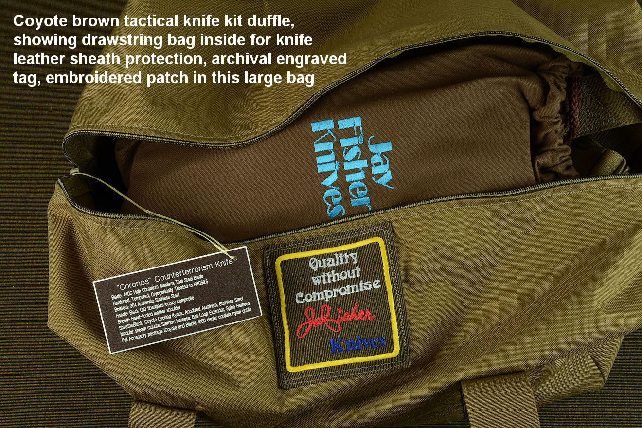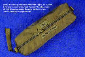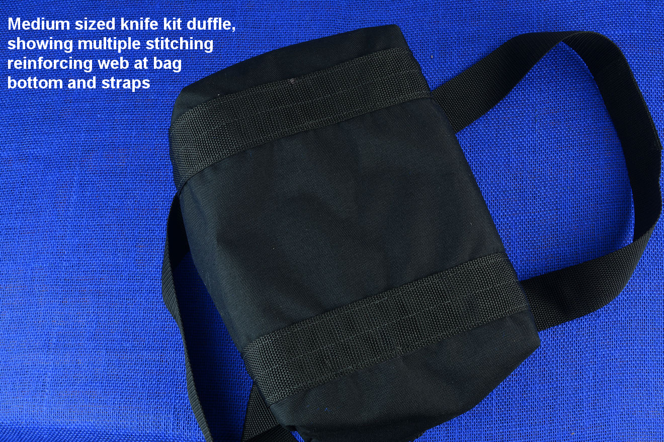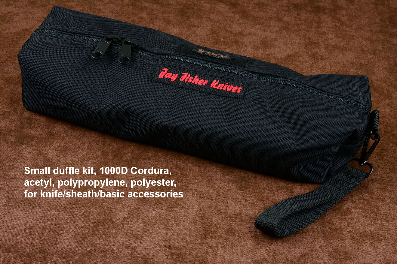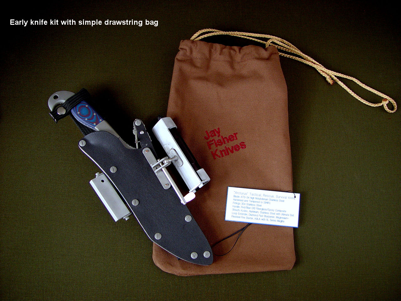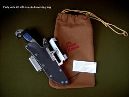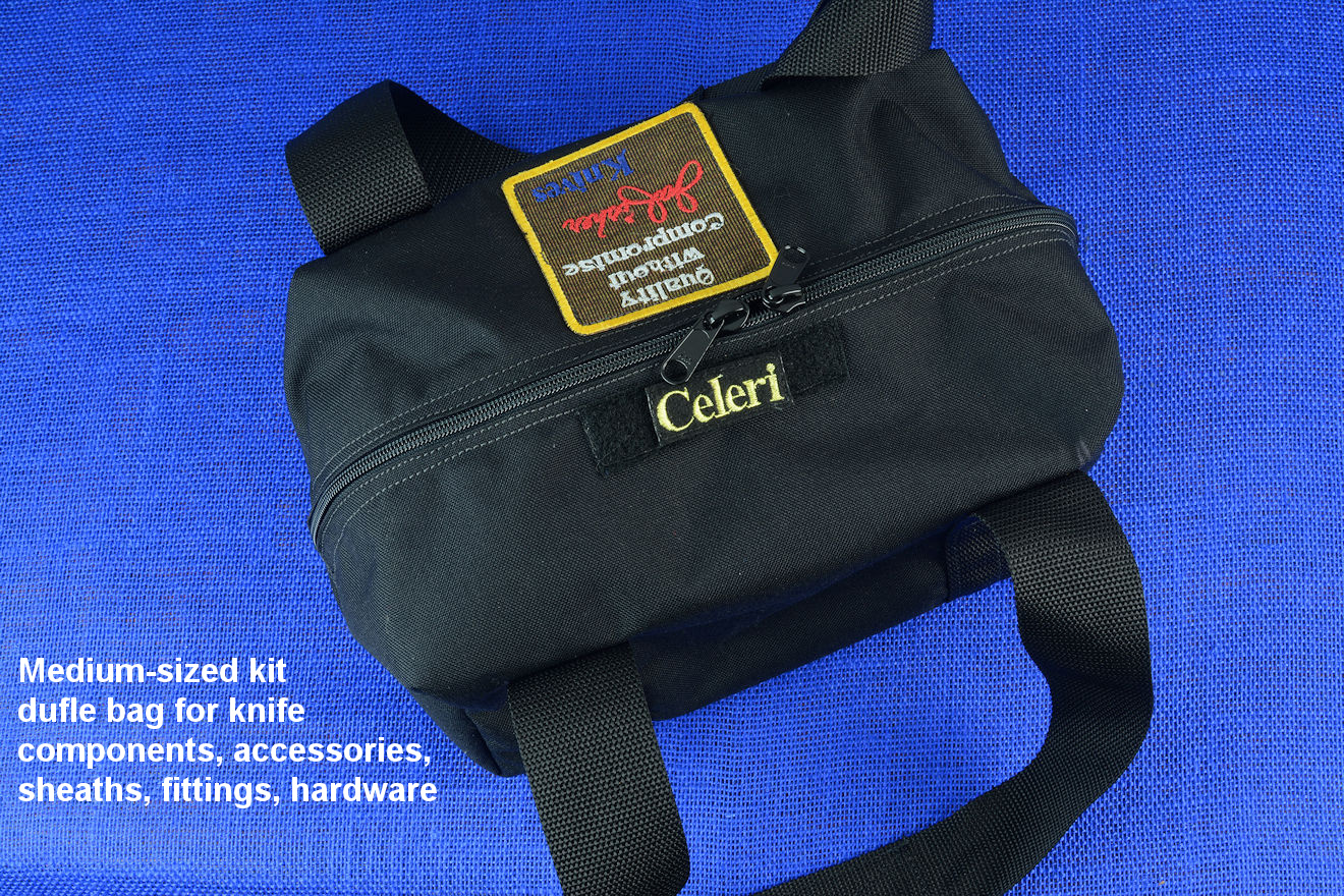 I still make the drawstring bags, constantly improving on even those. They are used for simple projects: knives with only a few components, or a knife and sheath only, or the most basic gear. The drawstring bags are also used inside the duffle kits to protect and house leather sheaths, because leather surfaces can be scratched by the metal components of the tactical kit. They also help "police-up" loose components in the kits.