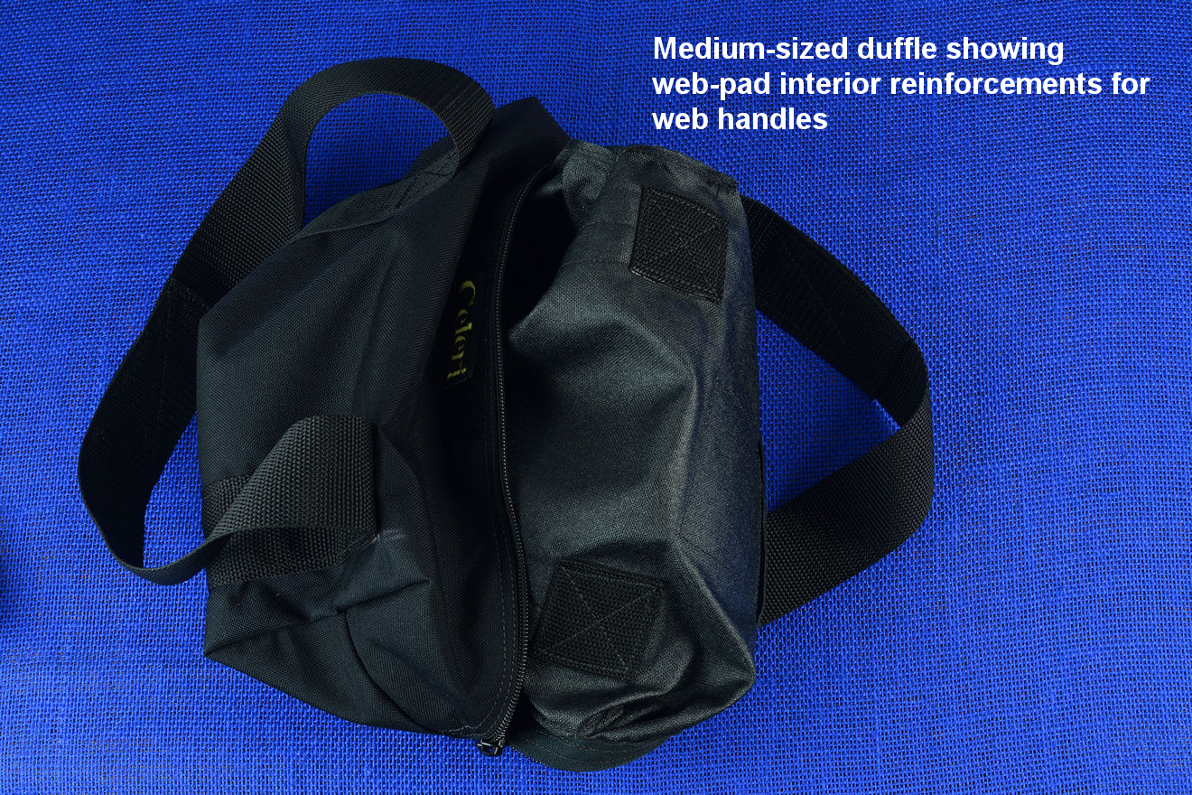 I began to use thicker material, more durable, and I employed larger machine-stitching. I moved to polypropylene webbing, or Mil-Spec nylon webbing, and to acetyl or steel fixtures. I started working in 600 Denier Cordura and now work with a lot of 1000 denier and even 1680 denier nylon in most of the bags and duffles, even the smallest. I stitch with T90, T138, T277, and even T346 thread: bonded polyester, high strength nylon, and even Teflon and Kevlar threads in extreme-use rigs. All webbing and material ends are melted and fused to prevent unraveling, all stitches are backstitch-locked at the terminal stitch points. A weak point on all bags is the zipper; I moved to #8 and #10 water-resistant zippers, with sewn-in webbing stops, dual pulls, and water-resistant designs. I used multiple stitch runs throughout, double and triple-stitching at all the seams. I added reinforced webbing handles that wrap completely around the duffles, and strengthen the Cordura with three to five-row stitching throughout. I reinforced the insides of the web handle terminations with interior web-patches so they will never pull out or tear. I added heavy acetyl or even steel D-rings at the zipper terminal ends for accessory or shoulder straps and zipper opposition, making the zippers easier to open. I used the same skills I use in making the web- and strap-based accessories like the UBLX, Sternum Harness, or Shoulder Harness. If you've seen those, you know that they are the best made in the world.