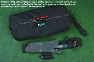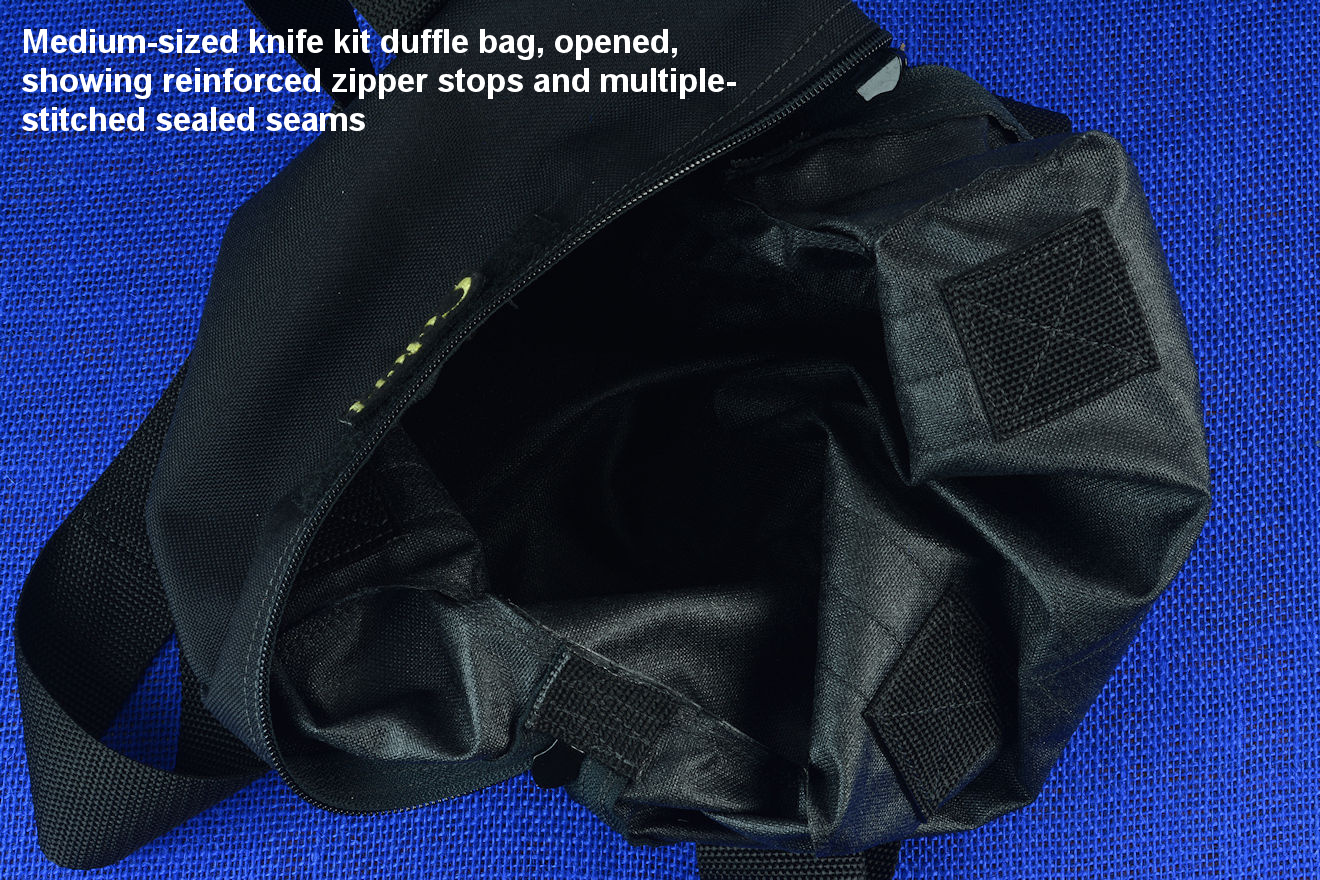 In my latest iterations, I've started lining my duffles with heavy polyester felt. This creates a greater thickness and durability, resisting tears by sharp corners or edges, and offering fantastic padding for the duffles and the gear inside. For the largest duffles, I've even added padded shoulder straps (removable, of course) for the long hauls, complete with stainless steel swivel snaps. The smallest duffles, only containing the knife, sheath, and a few basic belt loop accessories, have removable stitched web "hanger" handles.
