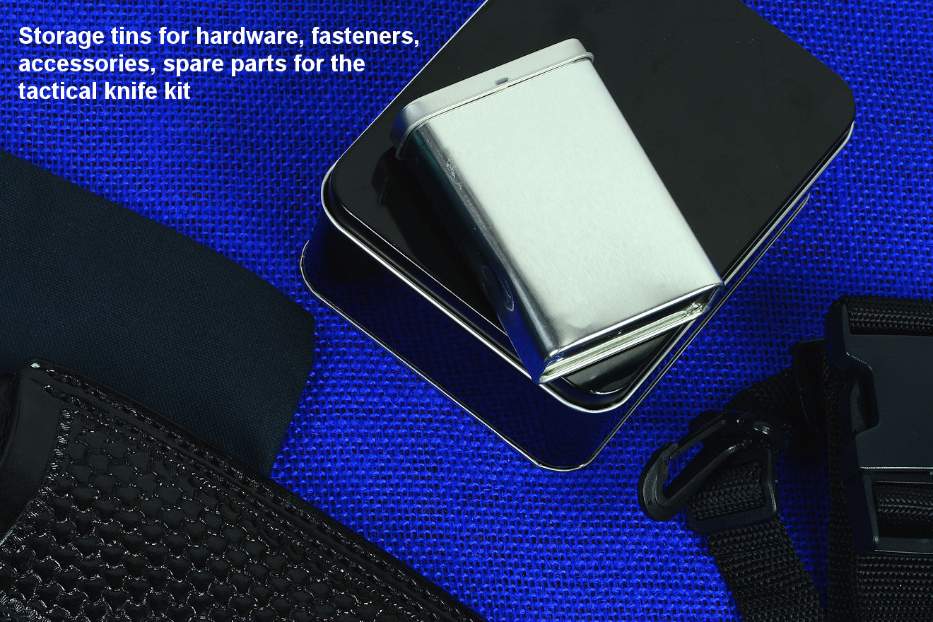 I started with plastic waterproof containers for the metal fasteners and hardware of the kits, and moved on to metal boxes or "tins." Some of these are screw-topped, some are hinged, some are tins that hold all of the smaller pieces for the kits. Most of these small parts are fasteners, machine screws, accessory belt clips that come with the flashlights, and spare bungee cords. Also nested in the tins are the different thicknesses of dog-leg titanium springs for the hybrid tension-lock sheaths. There is a can that is just right for the anodized aluminum horizontal belt loop plates, the additional sizes of die-formed aluminum belt loops, and for the horizontal and vertical flat clamping straps. These cans, on my latest models, are tough and durable, and held closed and together with wide elastic straps.