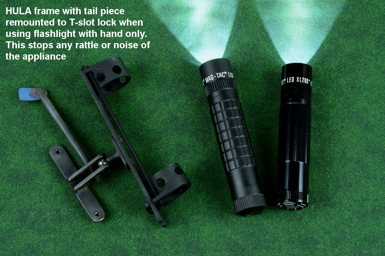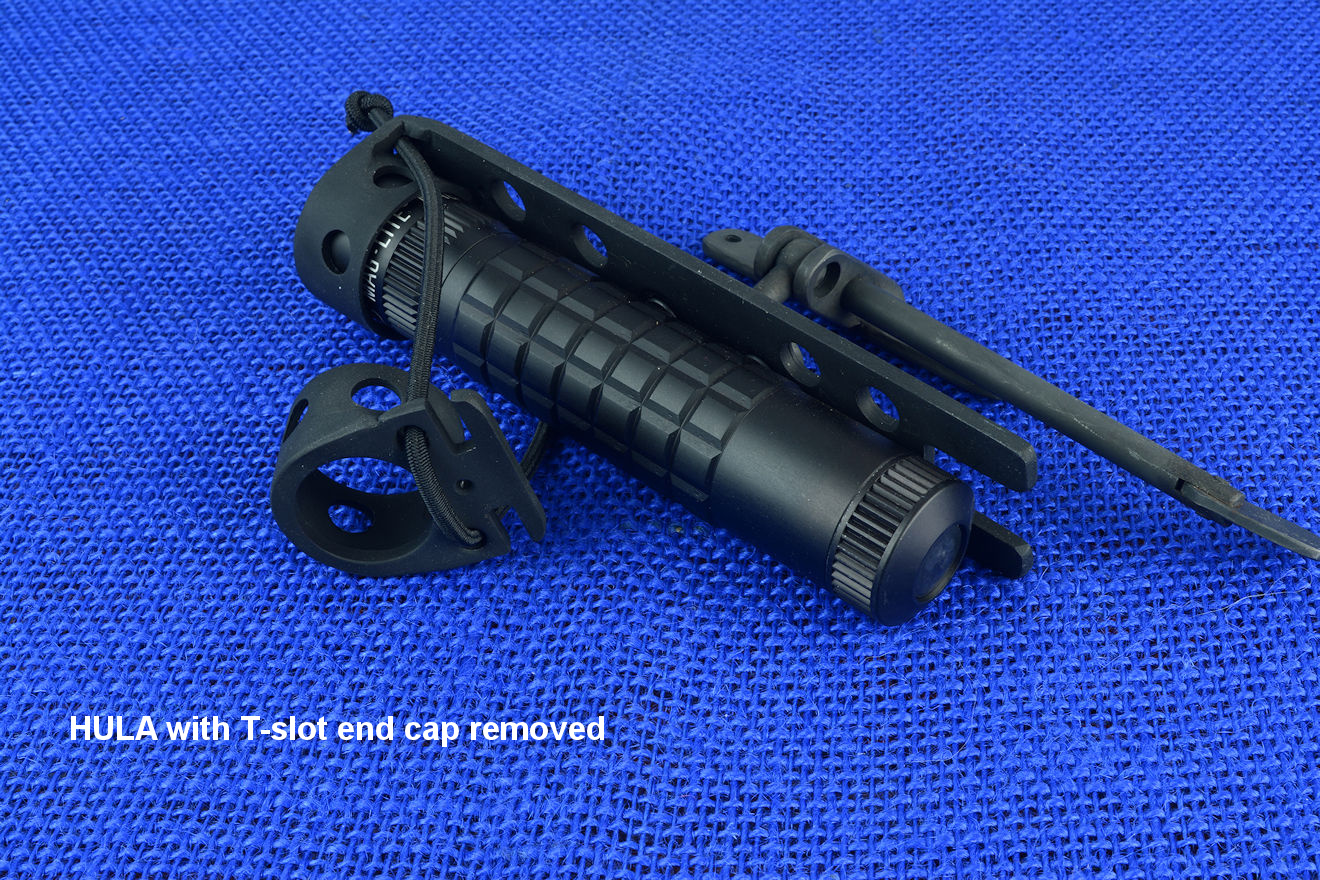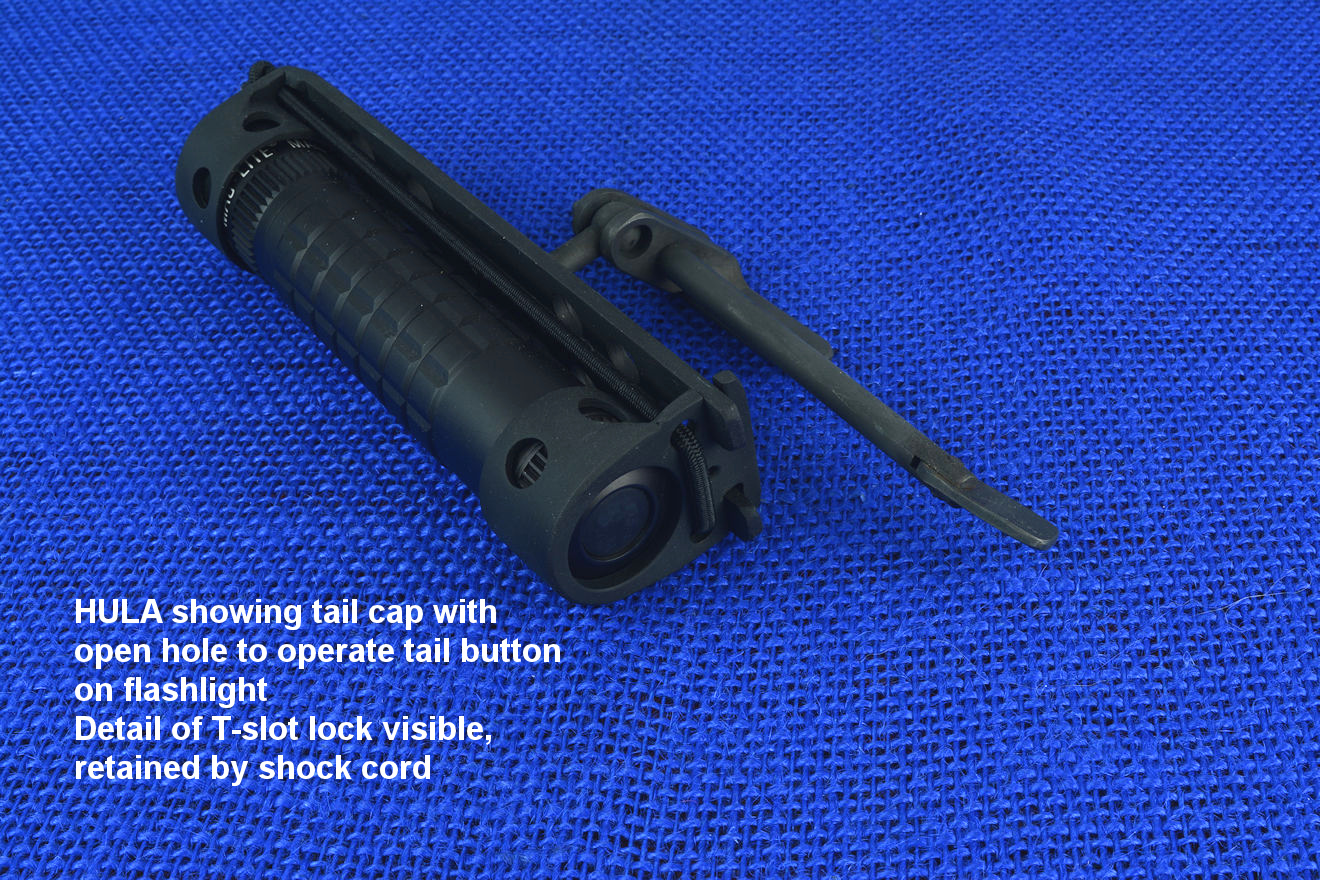 To take the flashlight out of the HULA is even simpler; I've made a "T-slot" lock that is easy to see in the photos. I made these big enough to be able to "feel" in the dark. I don't want my clients to have to struggle with the mechanism, so it's simple and can be felt with the fingertips alone, even in gloves. This way, a simple touch will assure you that the flashlight is in place, and the T-slot is secure.