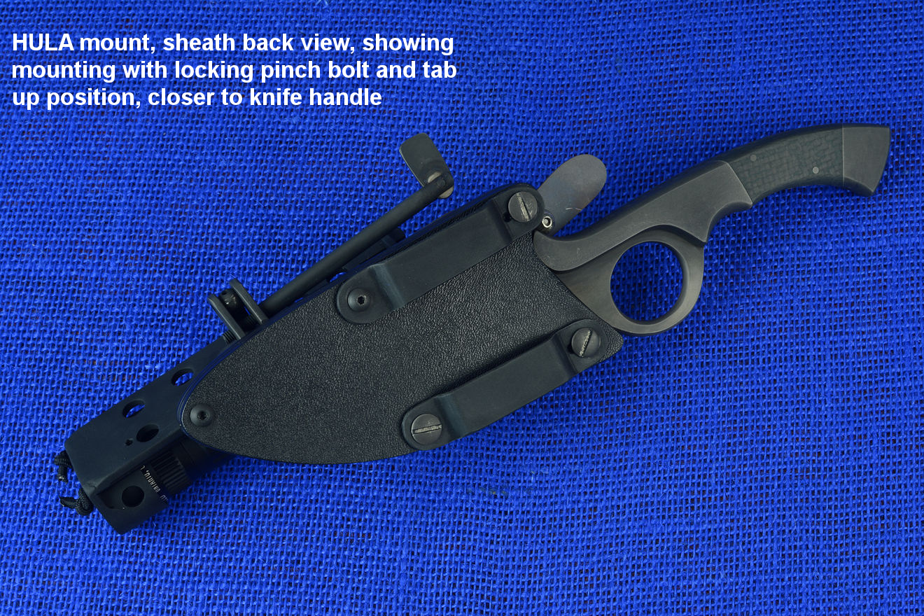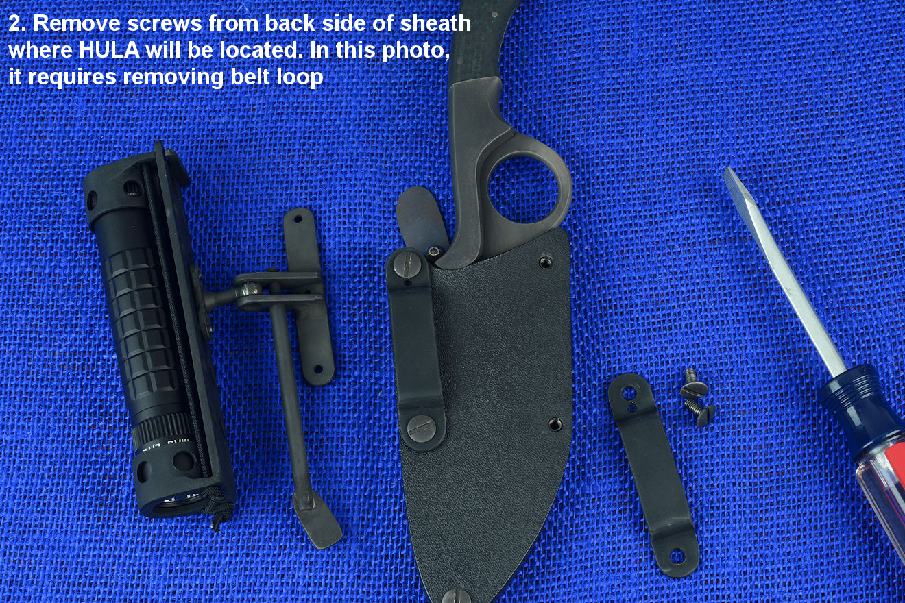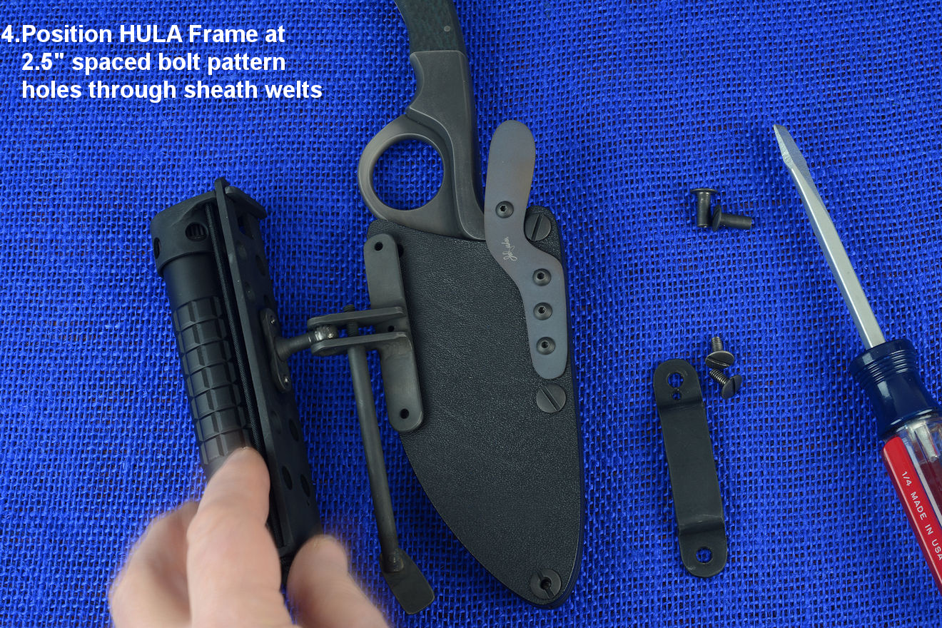 To mount the HULA in different positions, just figure out where on the sheath you want it. My sheaths all have a 2.5" machine screw center distance that is standard, and on most parts of the sheath, but not every hole, since the sheaths vary so much. Some of the sheaths may have shorter "mouth" screw spacing and shorter "tail" screw spacing depending on the pattern of knife. Be sure that the holes line up, and you're good to go. Start the screws by hand, with fingertips only, so you don't cross-thread the stainless. Stainless steel is very unforgiving about cross-threading, so be careful here and don't ever force a screw. once it's started, you're golden.