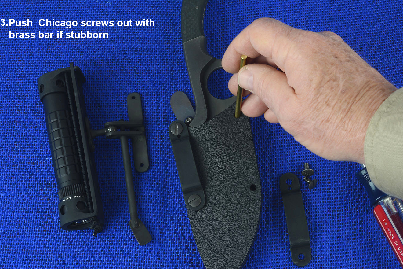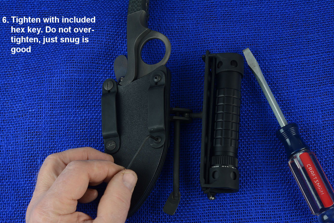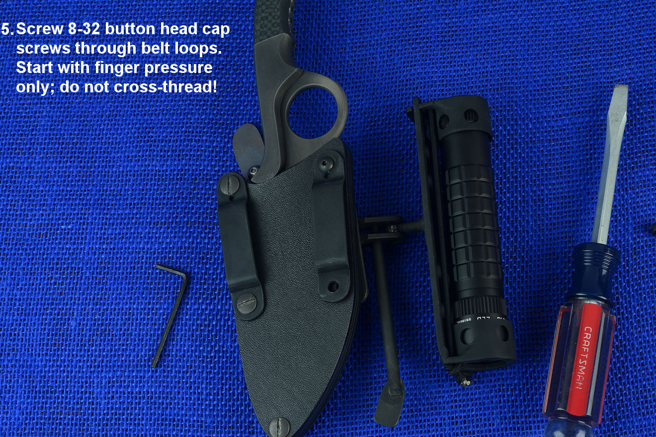 To mount the HULA in different positions, just figure out where on the sheath you want it. My sheaths all have a 2.5" machine screw center distance that is standard, and on most parts of the sheath, but not every hole, since the sheaths vary so much. Some of the sheaths may have shorter "mouth" screw spacing and shorter "tail" screw spacing depending on the pattern of knife. Be sure that the holes line up, and you're good to go. Start the screws by hand, with fingertips only, so you don't cross-thread the stainless. Stainless steel is very unforgiving about cross-threading, so be careful here and don't ever force a screw. once it's started, you're golden.