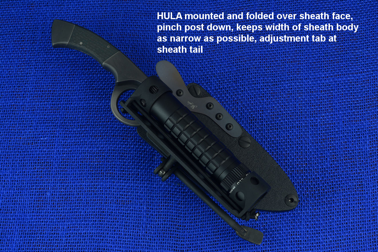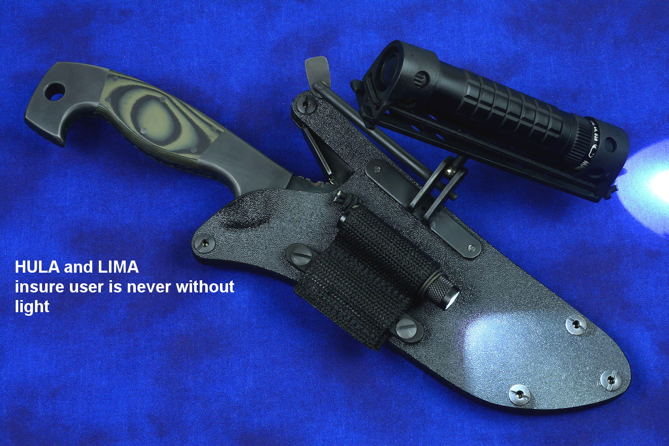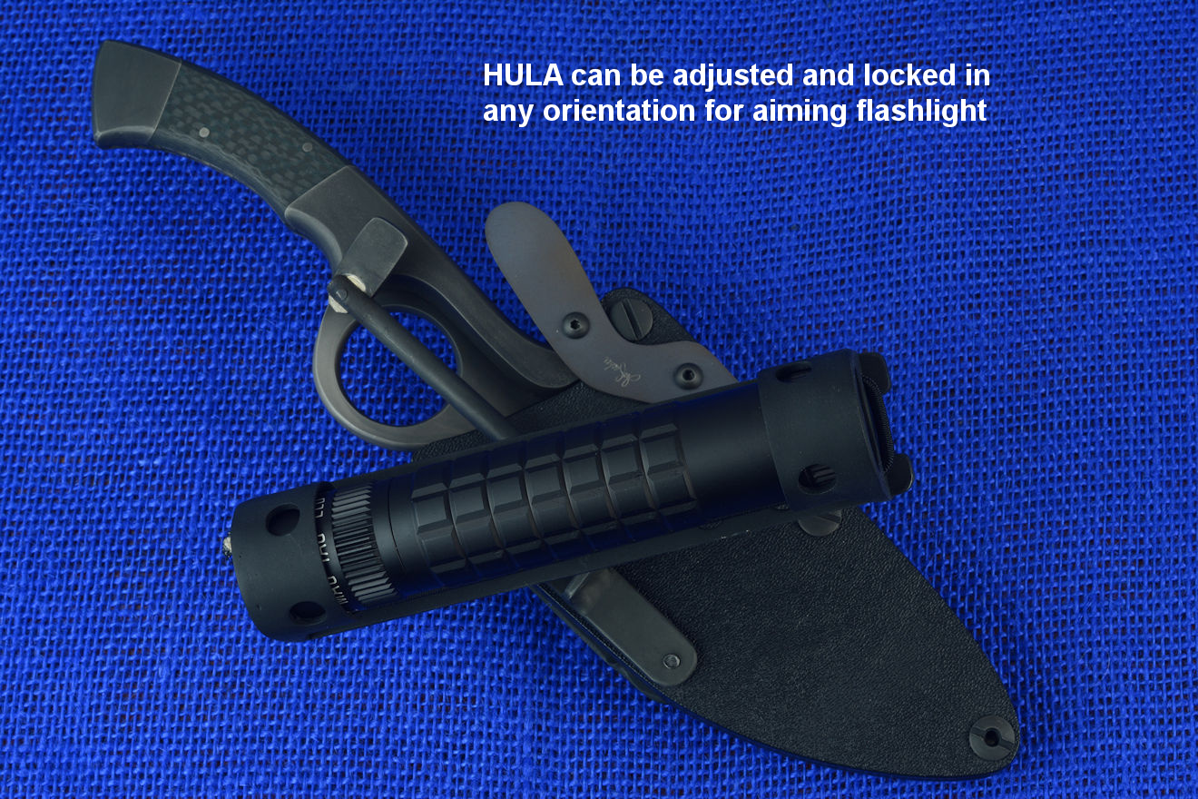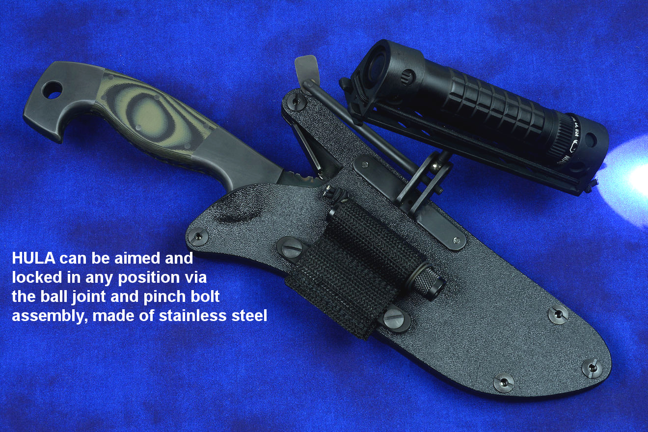 The HULA (Holder, Universal, Lamp, Articulating) is designed to mount on my tactical, counterterrorism, combat, rescue, and survival knife sheaths to store, hold, and aim a primary flashlight. It has an articulating and wide range of adjustment. It allows the user to aim the flashlight, and lock it in that position. It can be rigidly locked in that position, or lightly locked, allowing easy movement, or completely released, allowing free movement and aiming. It can be folded and moved to the side, front, or even rear of the sheath.