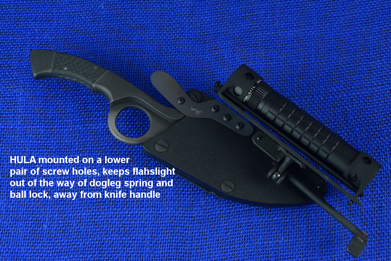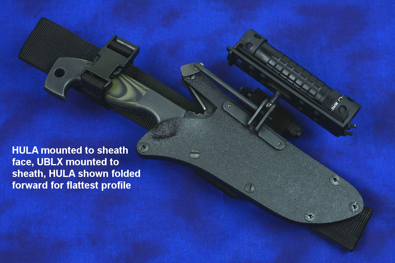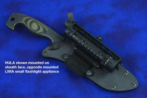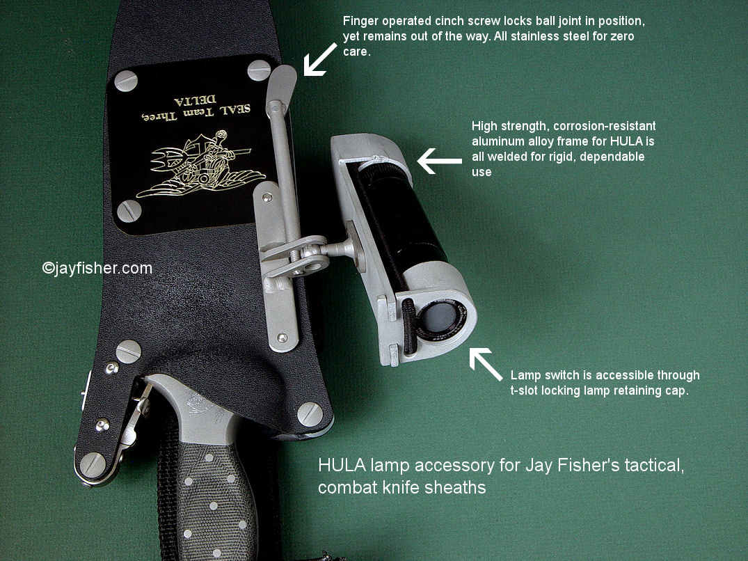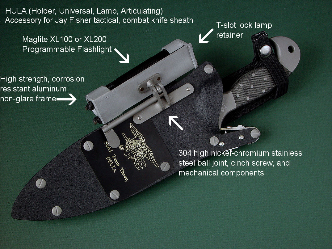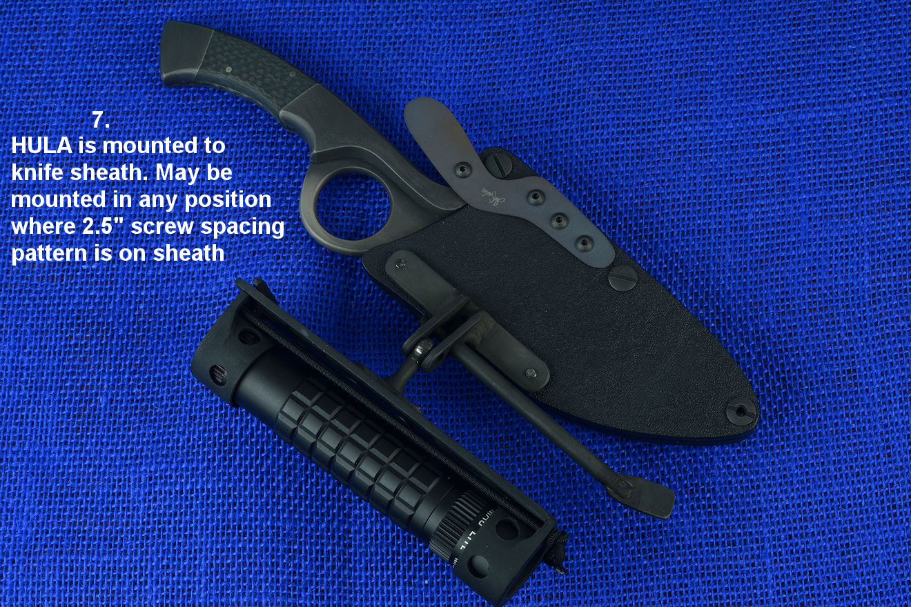 The HULA (Holder, Universal, Lamp, Articulating) is designed to mount on my tactical, counterterrorism, combat, rescue, and survival knife sheaths to store, hold, and aim a primary flashlight. It has an articulating and wide range of adjustment. It allows the user to aim the flashlight, and lock it in that position. It can be rigidly locked in that position, or lightly locked, allowing easy movement, or completely released, allowing free movement and aiming. It can be folded and moved to the side, front, or even rear of the sheath.