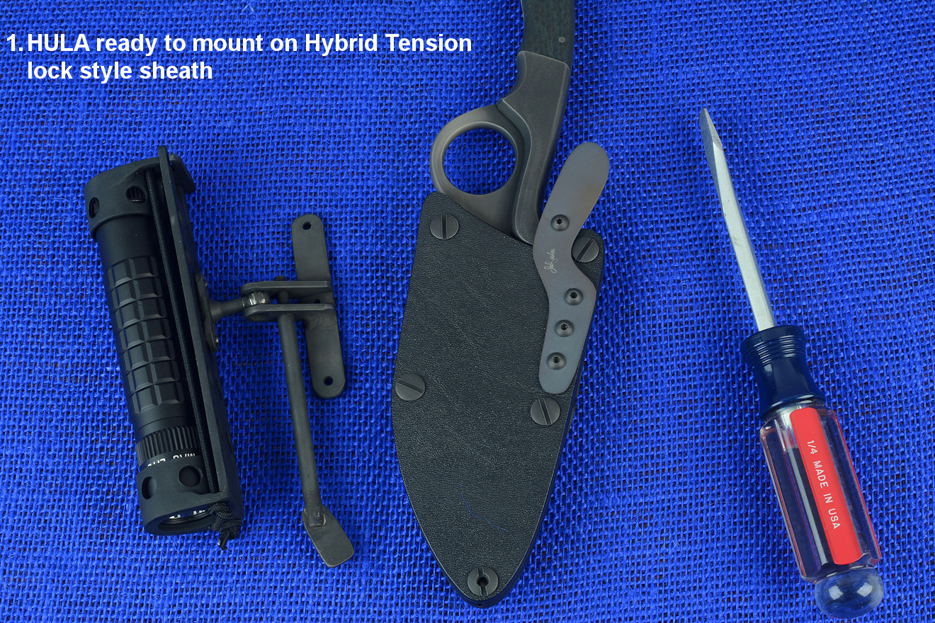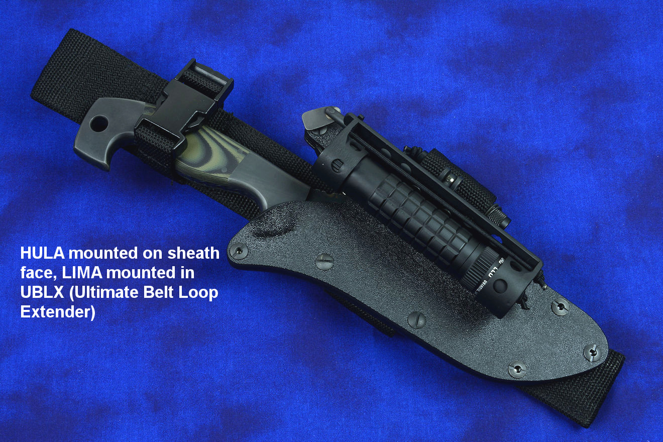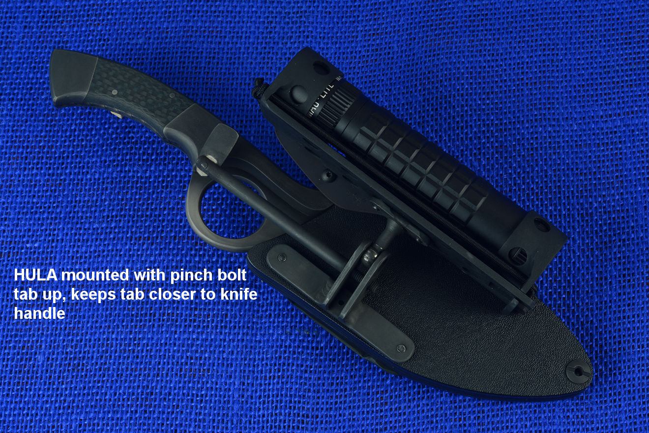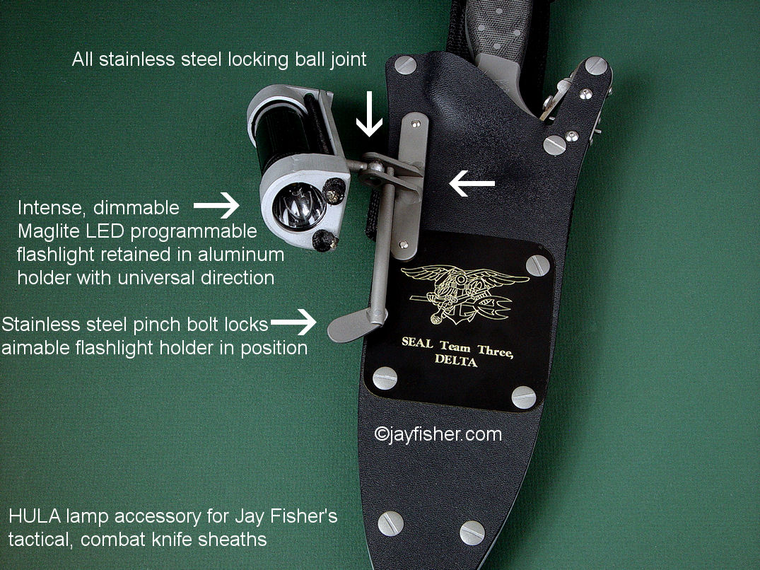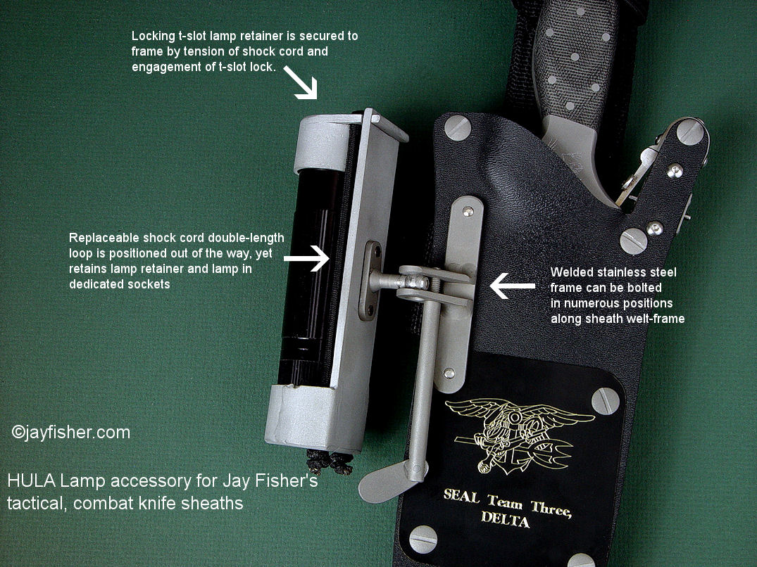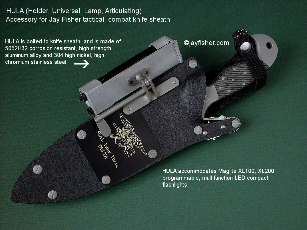 The HULA (Holder, Universal, Lamp, Articulating) is designed to mount on my tactical, counterterrorism, combat, rescue, and survival knife sheaths to store, hold, and aim a primary flashlight. It has an articulating and wide range of adjustment. It allows the user to aim the flashlight, and lock it in that position. It can be rigidly locked in that position, or lightly locked, allowing easy movement, or completely released, allowing free movement and aiming. It can be folded and moved to the side, front, or even rear of the sheath.