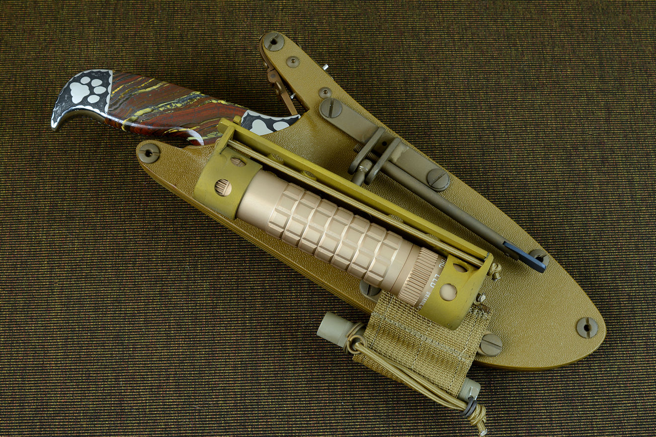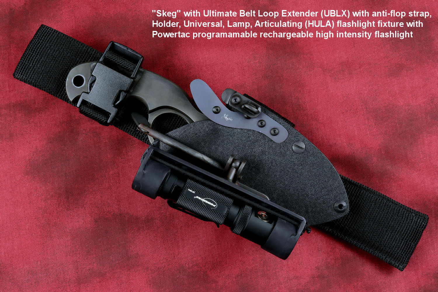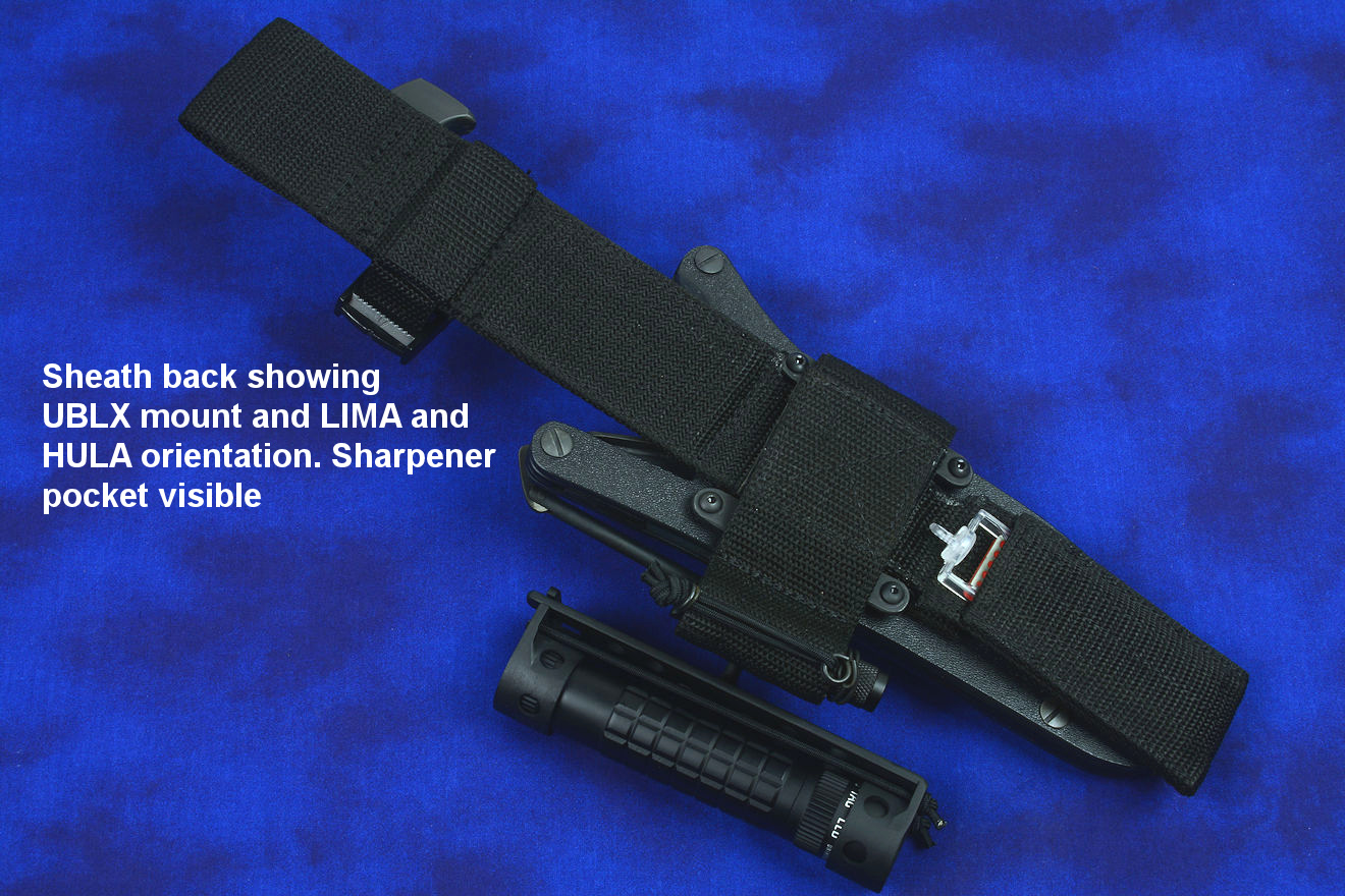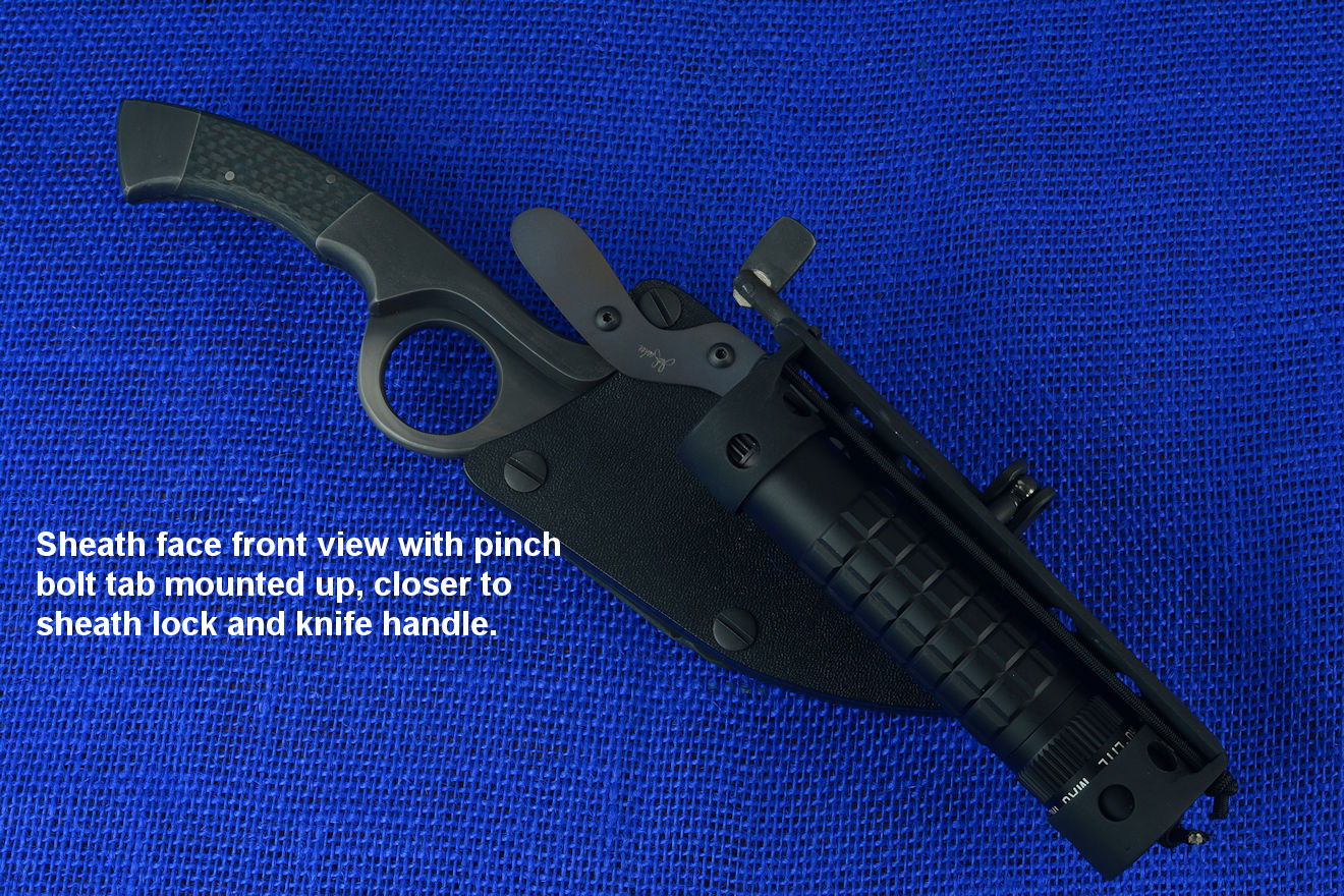 The HULA (Holder, Universal, Lamp, Articulating) is designed to mount on my tactical, counterterrorism, combat, rescue, and survival knife sheaths to store, hold, and aim a primary flashlight. It has an articulating and wide range of adjustment. It allows the user to aim the flashlight, and lock it in that position. It can be rigidly locked in that position, or lightly locked, allowing easy movement, or completely released, allowing free movement and aiming. It can be folded and moved to the side, front, or even rear of the sheath.