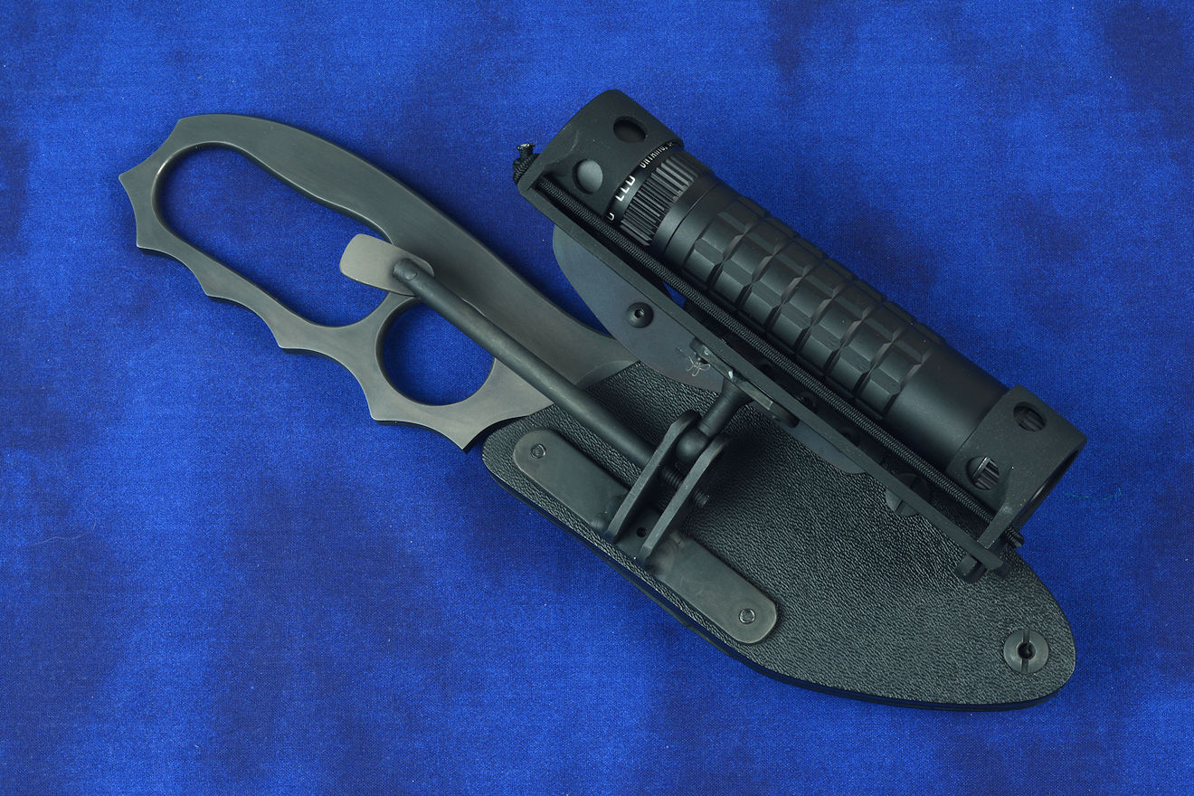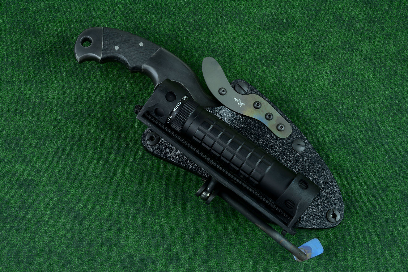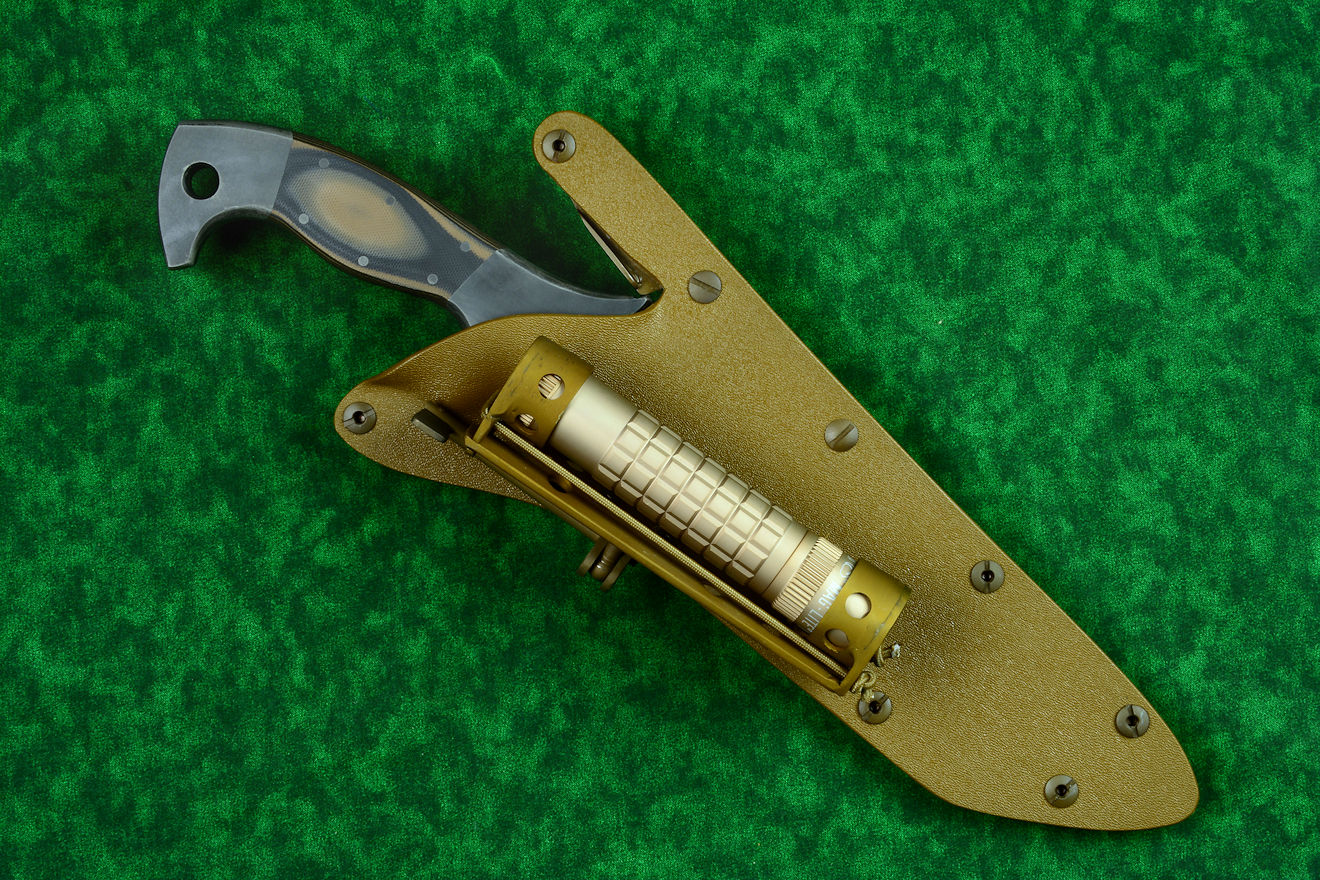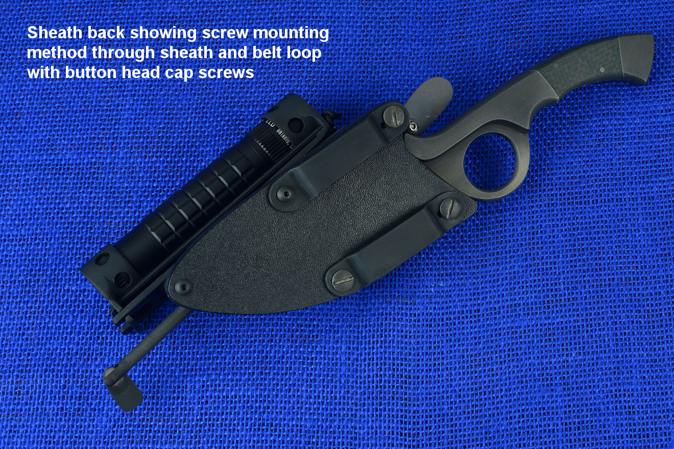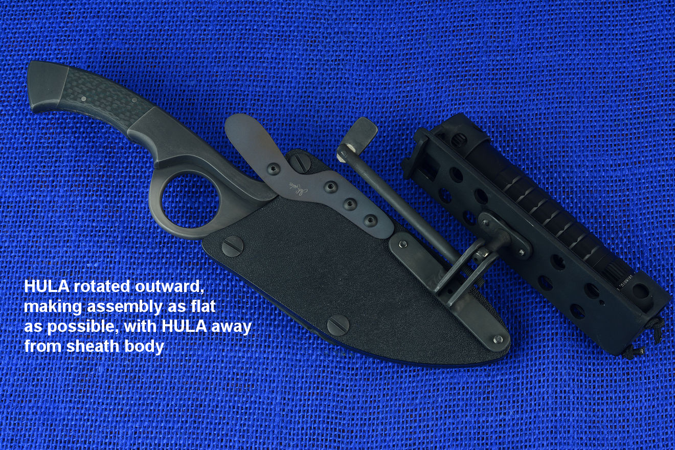 Humorously, one uneducated forum participant saw the photos of the HULA and thought it looked "weak," stating that if the wearer took a tumble, that it might bend or break. This shows the ignorance of people who base their opinions on plastic. If it was made of plastic, it might well bend or break, but the HULA is made of stainless steel and high strength aluminum alloy. The sheath welts would bend and the sheath kydex would fracture before the HULA would be damaged, and if the wearer suffers enough to do that, he will have other major trauma problems! The stainless steel won't bend, the aluminum won't break, and in the hundreds of these I've made over several decades, I've not had a report of a failure or even a problem of a single one, not one!