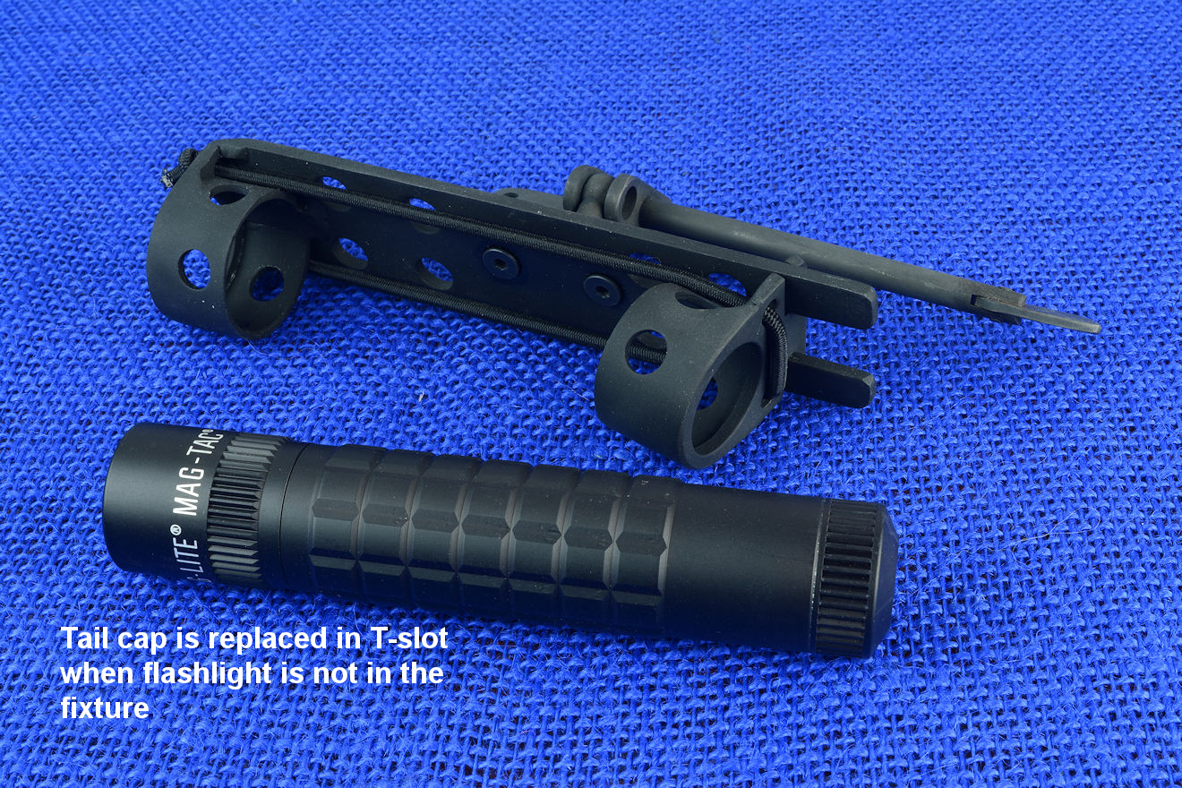 Once the flashlight is removed, I recommend re-mounting the cap lock in the T-slot. This will make sure that it won't hang on anything, won't rattle, and won't get in the way. After a client becomes familiar with the device, he can usually do all this with one hand, in the dark, by feel alone.