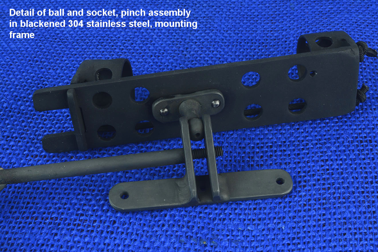 The ball, tabs, and shaft are all 304 stainless steel as well. This assures that wear of the ball is minimal, and the pinch bolt can squeeze the tabs together and solidly grip the ball, to lock the HULA where the user wants it. The pinch screw is also stainless steel, and may be topped with a tab-pad for the fingers that is either 304 stainless steel or 6AL4V titanium. None of this will corrode, rust, or degrade, ever.