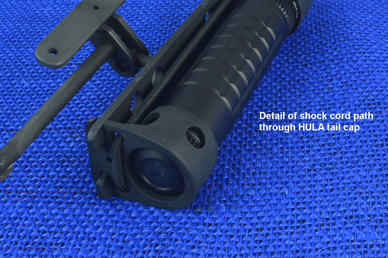 Like my LIMA accessory, there is only one component that can wear, so I made these as simple as possible. That component is the bungee cord, or shock cord that pulls the flashlight into the frame and secures the tail cap. I wanted my clients to be able to easily replace this as needed, to adjust the tension to their preference, and I wanted it to be commonly and easily acquired at any hardware store or internet source. This is why I chose simple 1/8" shock cord and a few overhand knots in the design. No rubber to oxidize and wear, no specialized shape or plastic cast forms, no clips or springs or Velcro® to wear out, make noise, or be a hassle to replace. Like the LIMA, when the owner starts to see wear and the white of the cord interior, it's time to replace it. If it loses its elasticity, it's time to replace it. Uncomplicated, inexpensive: fixed.