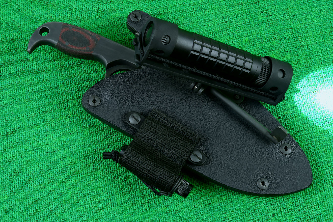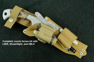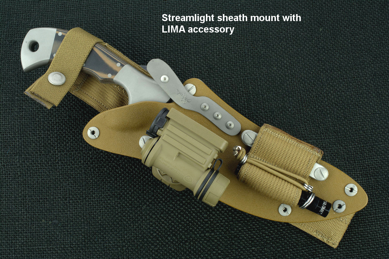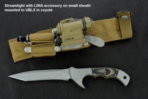 Many years ago, I saw the need for a small lamp to get the knife wearer home, to help add a bit of light to a dark area, to have a small flashlight to be able to look into a dark hole, retrieve something in a dimly lit place, or just to have an emergency source handy. This was the birth of the LIMA, the "Lamp, Independent Mount Assembly" that has accompanied most of my tactical knives since the early 2000s. You can read more about the LIMA on it's dedicated page.