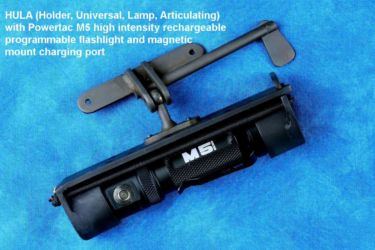 Rather than stick to a specific type and stagnant vendor of these flashlights, I currently make a variety of HULA accessories that use a variety of lights. For instance, I found that although Maglite makes some good, sturdy and simple lamps, they don't have the light output that some of my clients request. Or, they aren't programmable. Or rechargeable. Some of my clients don't want rechargeable lamps; some do. Some want a variety of battery choices, and the newer lamps offer this. Some stick to the theme of "American Made," even though Maglite hasn't been entirely American made for over 20 years. But I still offer Maglite flashlights on some models, because they are very sturdy.