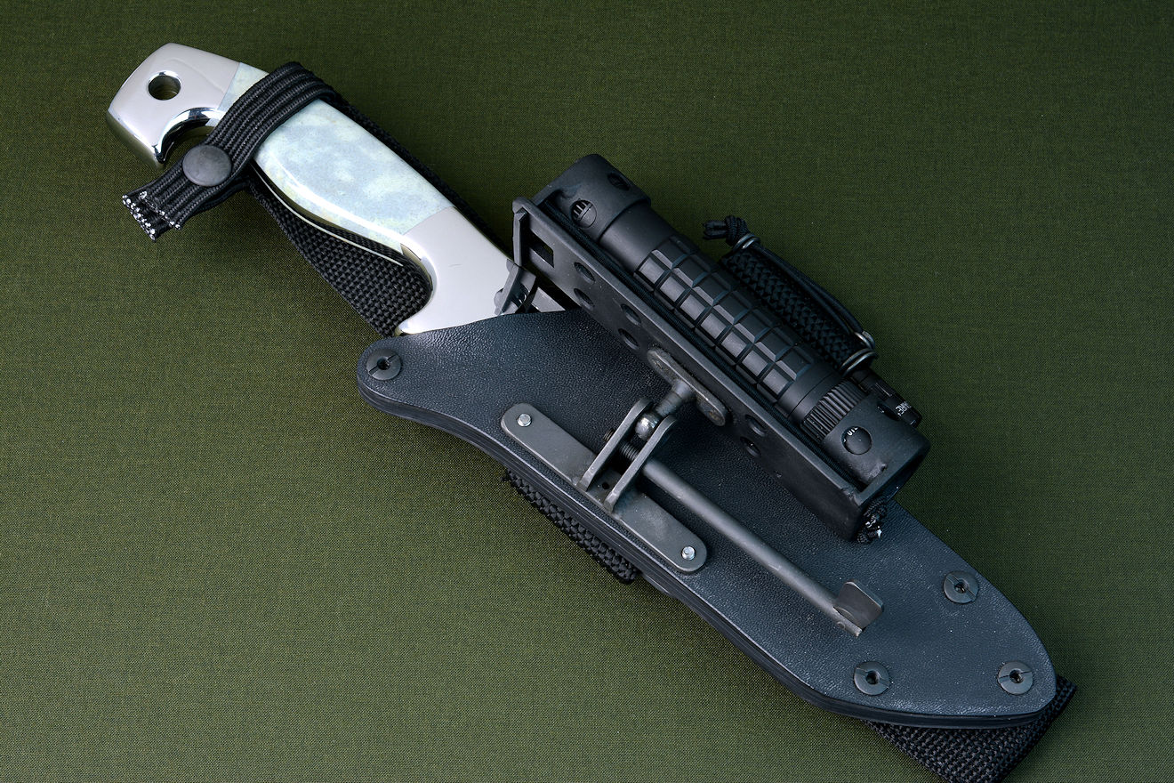 My HULA is a permanent device, made to fit a variety of flashlights. The flashlights it fits are metal-cased; they are all made of tubular aluminum alloy, anodized and knurled, textured, and often waterproof. If (and when) the flashlight is broken, or is lost, or fails, or just gets old, the aiming holder of the HULA will still accept a new flashlight, still aim, still work, and will absolutely outlast the owner of the knife! It's not going anywhere because, when used, it's attached to the knife sheath with solid stainless steel machine screws.