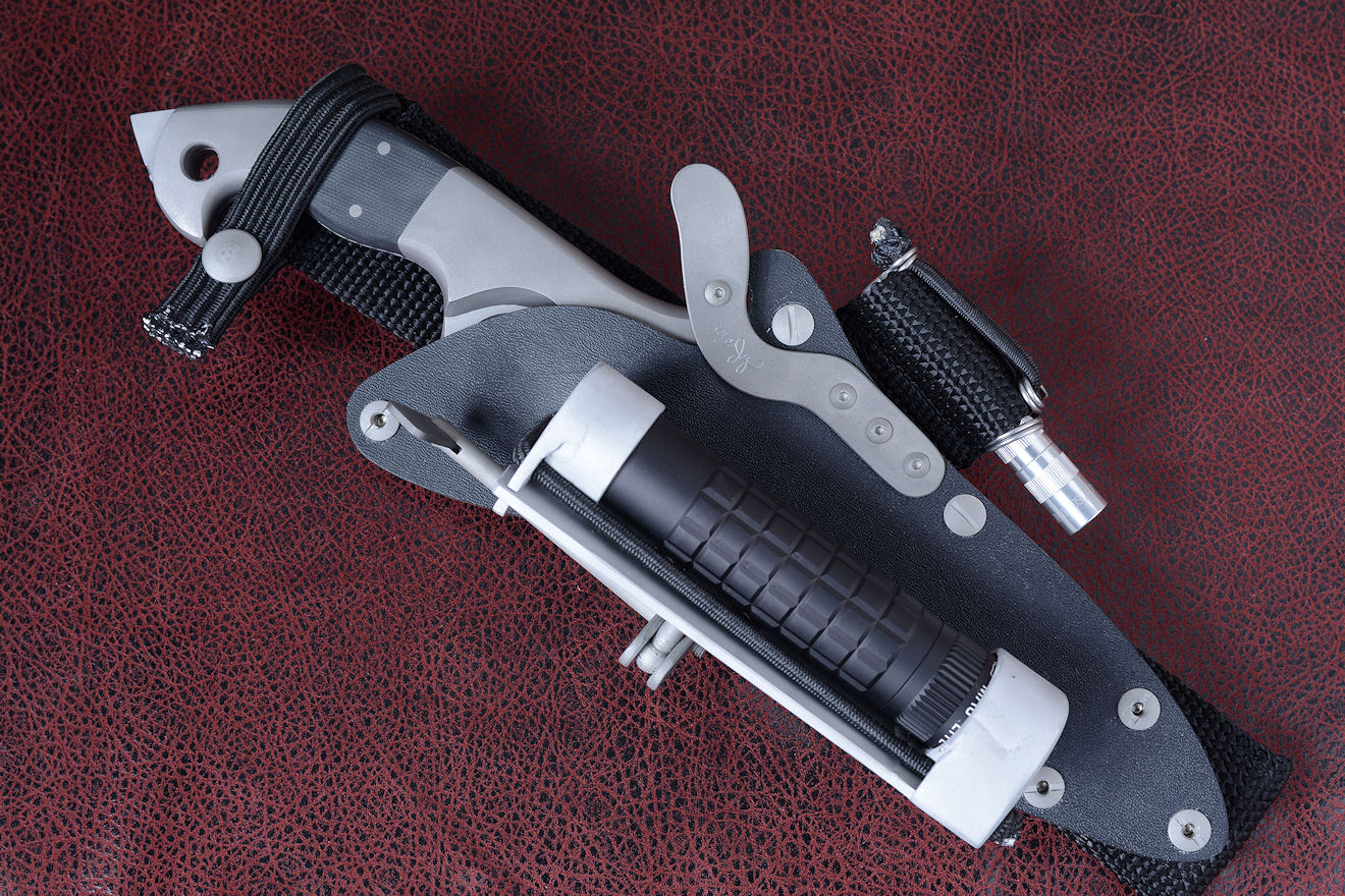 Some might think that two flashlights is overkill, that a flashlight has no place in the knife kit, but I (and my clients) think differently. In order to effectively use a knife in a tactical situation, you need to see what you are cutting. The knife is (or should be) a razor-keen edged tool and weapon in the right hands. Nowhere is illumination more important, since the blade point and edge can and should pierce and cut everything they touch. Using an aggressive tactical knife with precision is not something done blindly.
