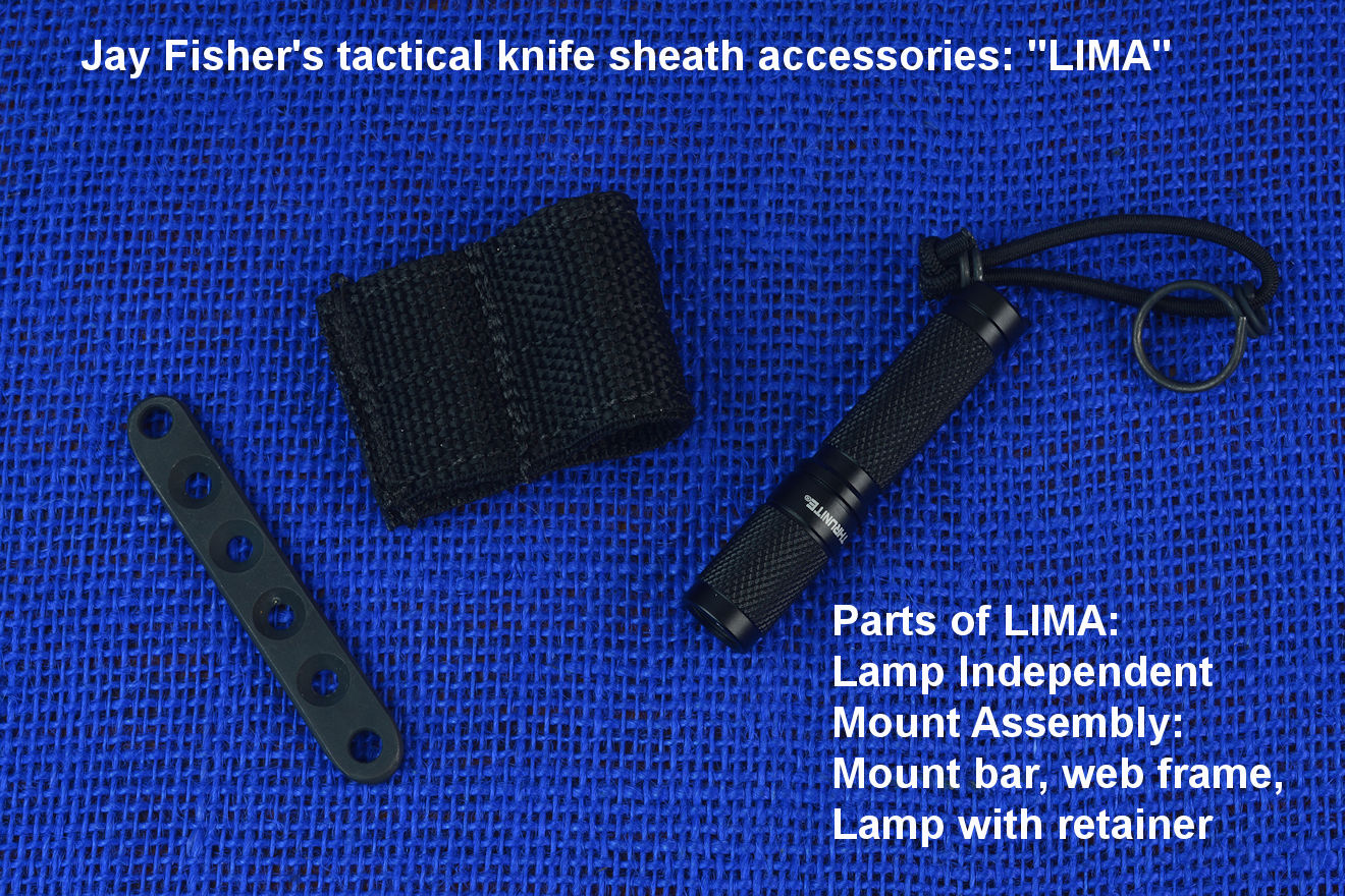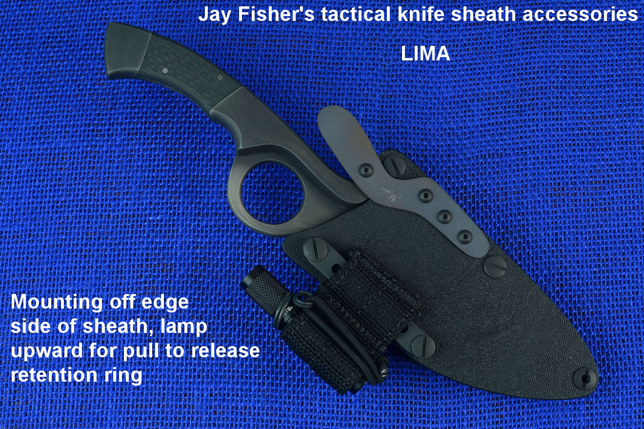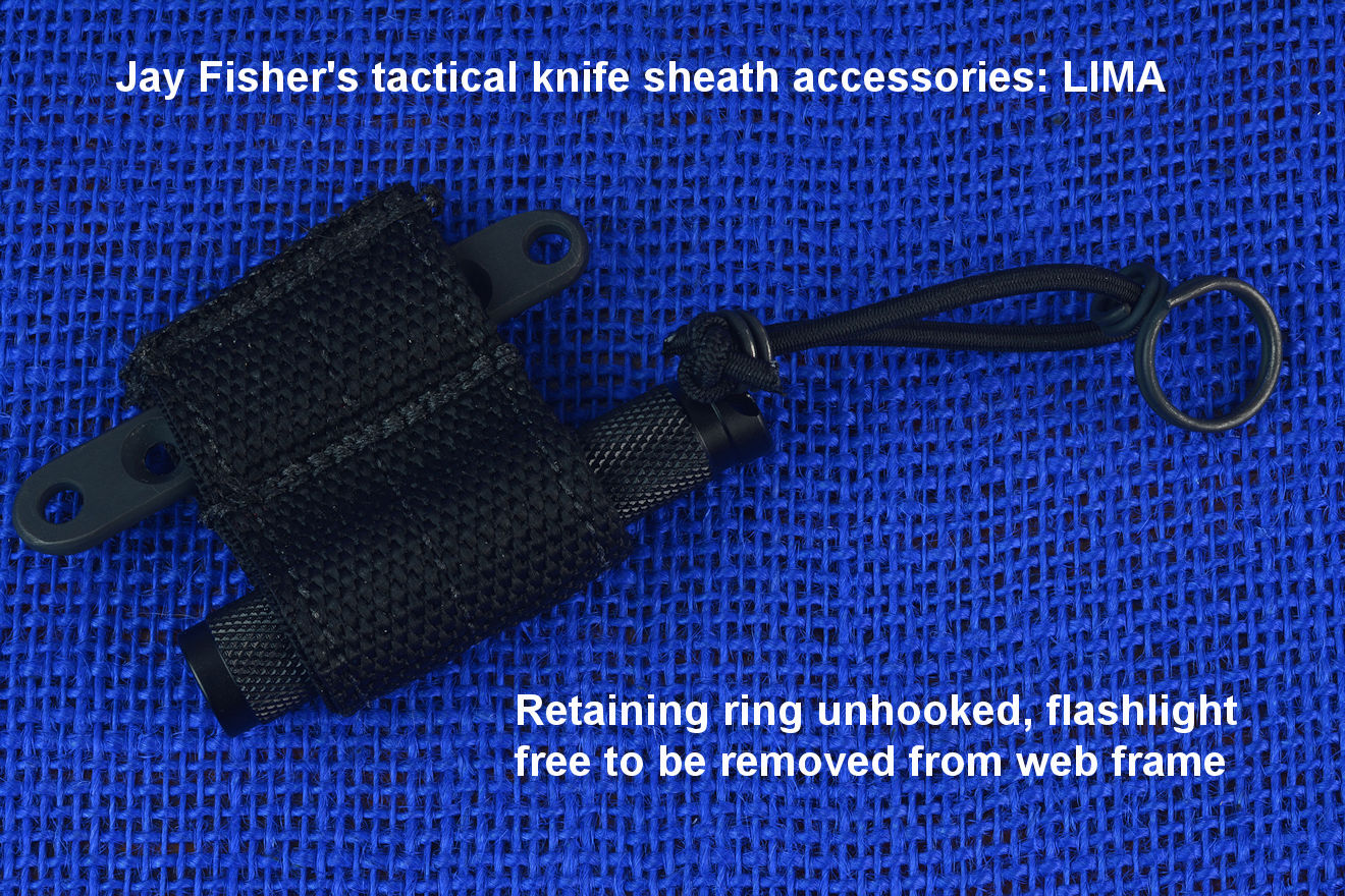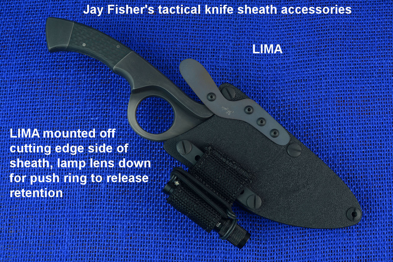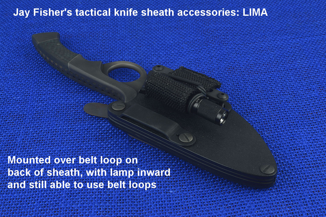 The acronym LIMA stands for "Lamp Independent Mount Assembly," and, like all of my tactical sheath components, it's my own invention. It's an extremely lightweight adjunct that can be used when your key light fails, or in the daytime when you aren't carrying your main flashlight, and need to look into a dark hole or enter an unlighted place. It is so innocuous that it's often forgotten on the sheath, but in critical times is immediately available. It is so tremendously popular that it's been demanded on all of my counterterrorism knife kits, because of the saying, "two flashlights are one flashlight, and one flashlight is no flashlights." If you are an active, outdoor person, you know exactly what I'm writing about, since being a mechanical and electrical device, failure will, sooner or later, visit you in the wilderness, and at the very worst time.