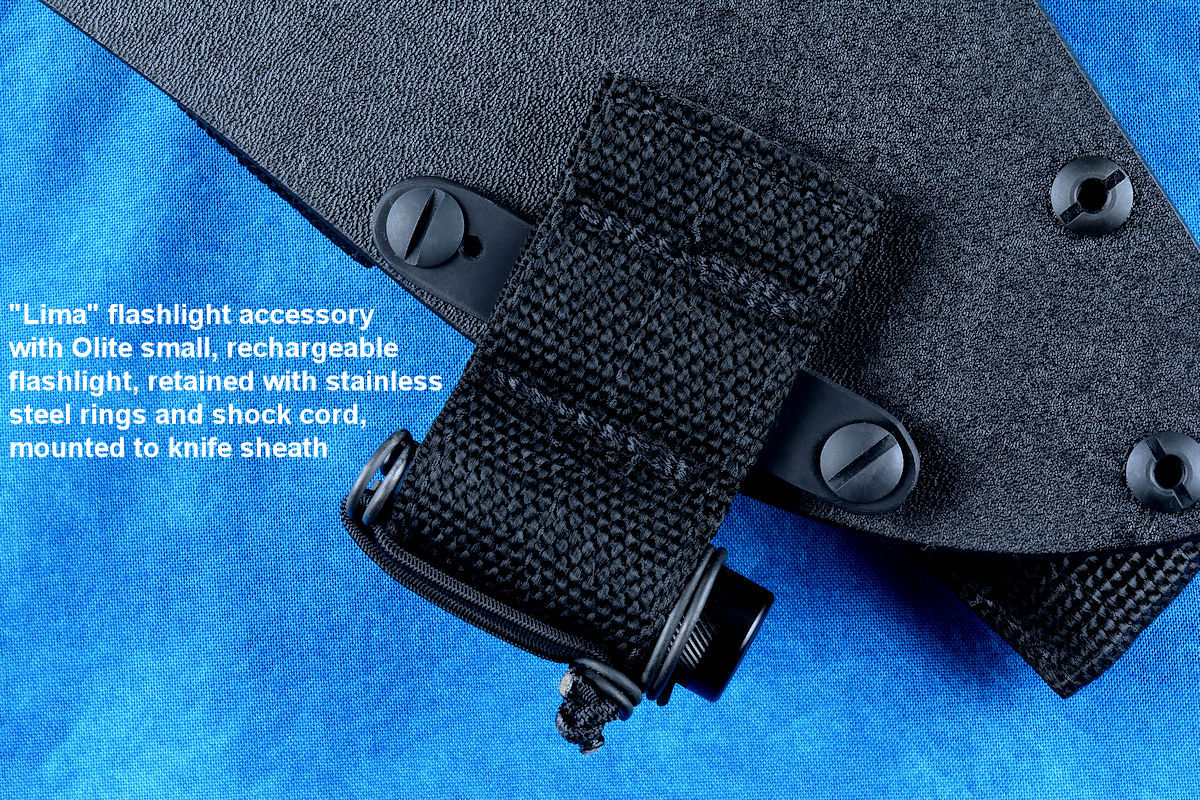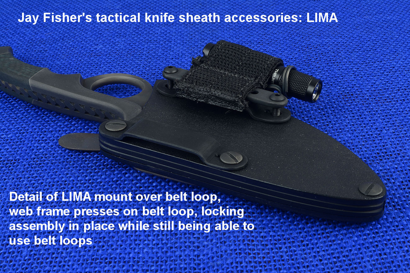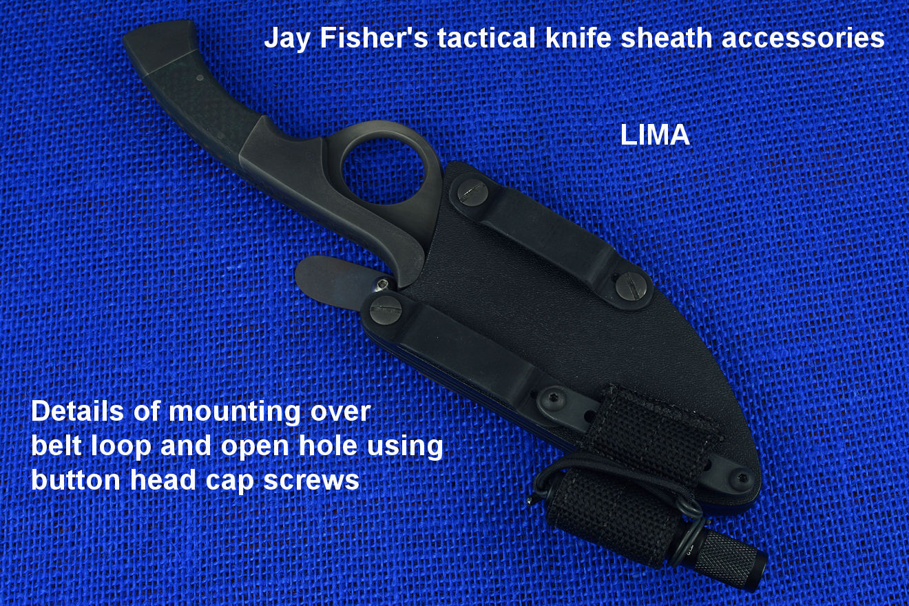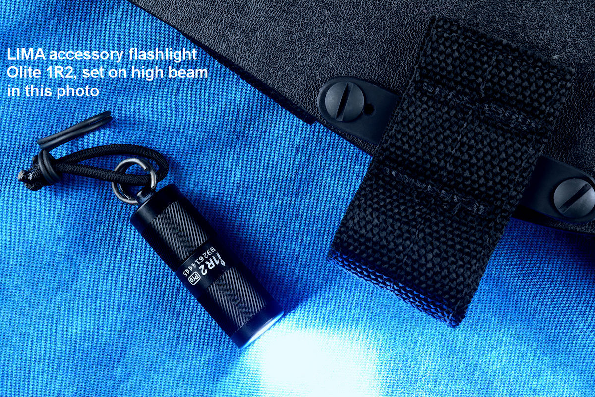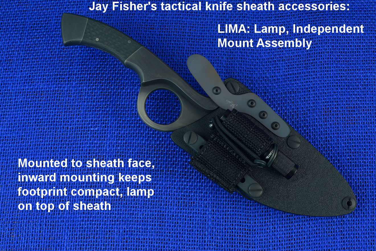 The acronym LIMA stands for "Lamp Independent Mount Assembly," and, like all of my tactical sheath components, it's my own invention. It's an extremely lightweight adjunct that can be used when your key light fails, or in the daytime when you aren't carrying your main flashlight, and need to look into a dark hole or enter an unlighted place. It is so innocuous that it's often forgotten on the sheath, but in critical times is immediately available. It is so tremendously popular that it's been demanded on all of my counterterrorism knife kits, because of the saying, "two flashlights are one flashlight, and one flashlight is no flashlights." If you are an active, outdoor person, you know exactly what I'm writing about, since being a mechanical and electrical device, failure will, sooner or later, visit you in the wilderness, and at the very worst time.