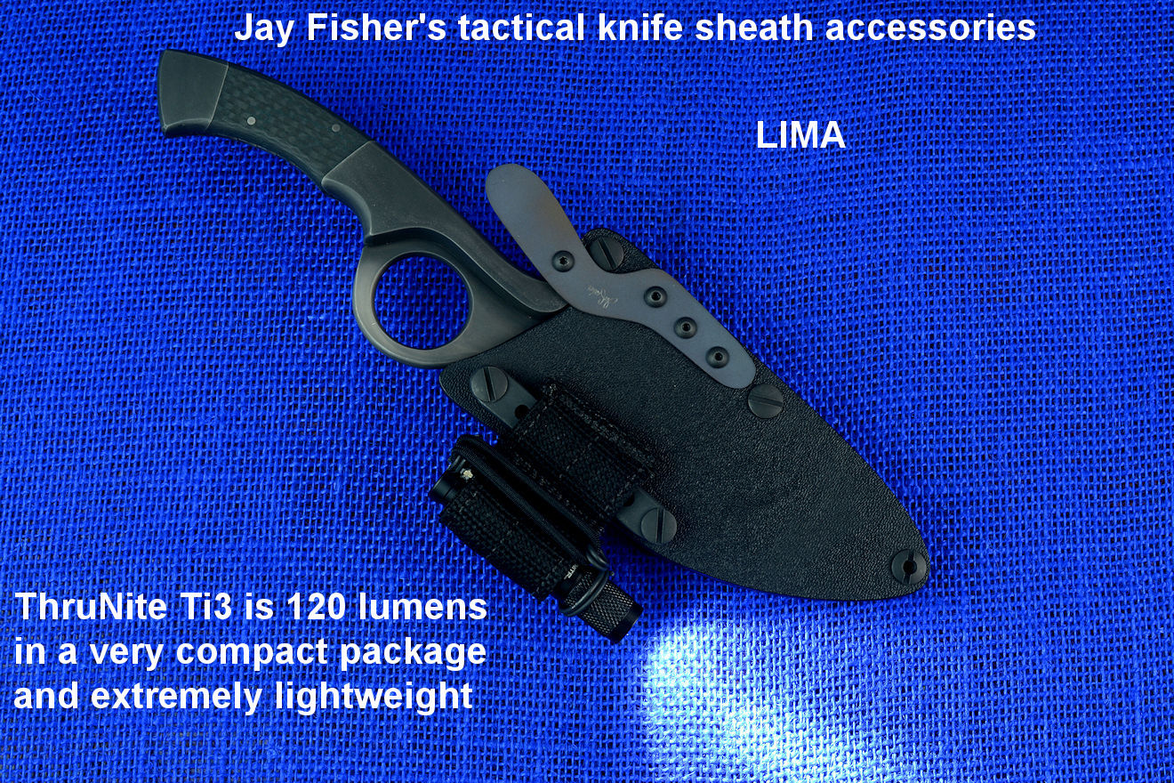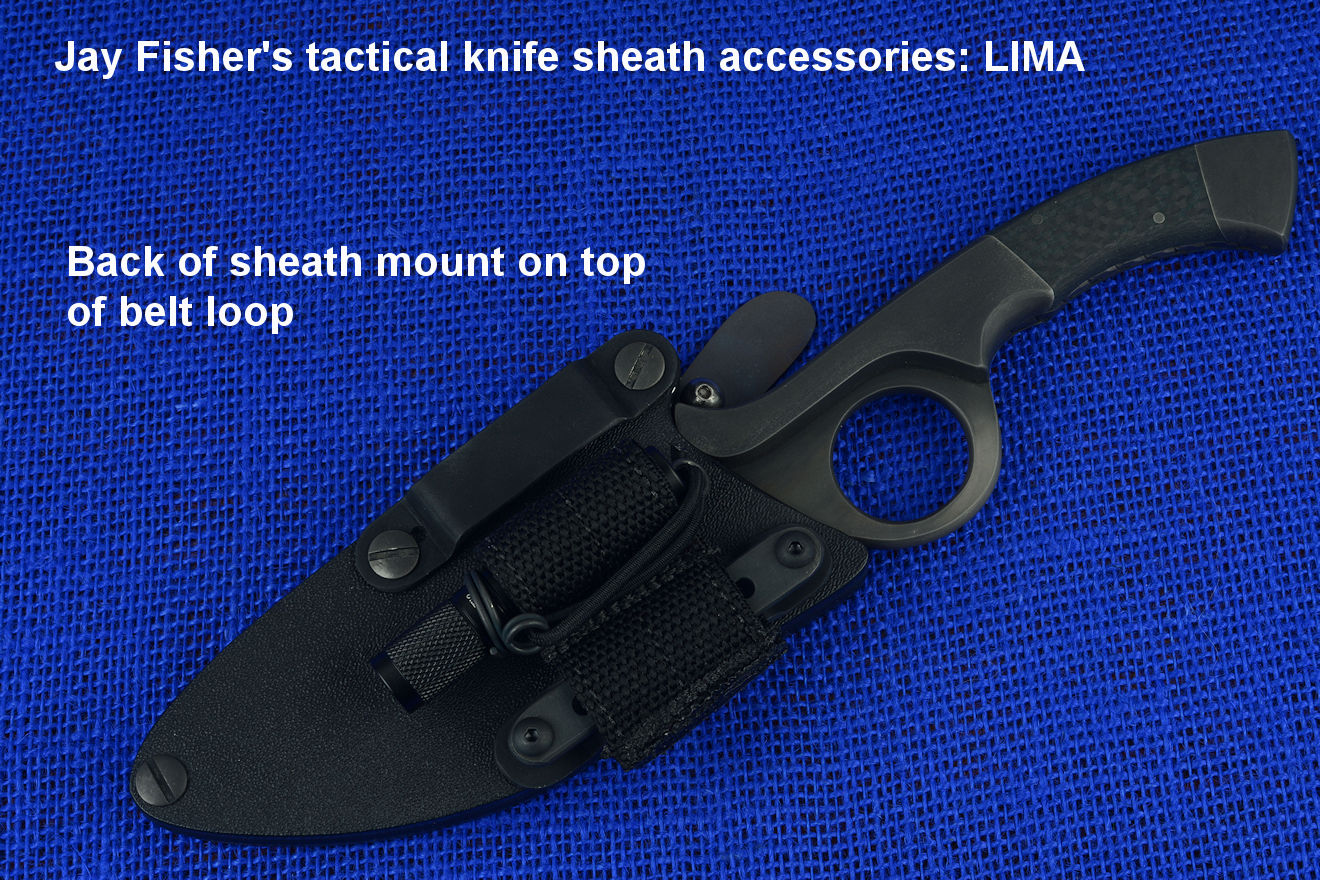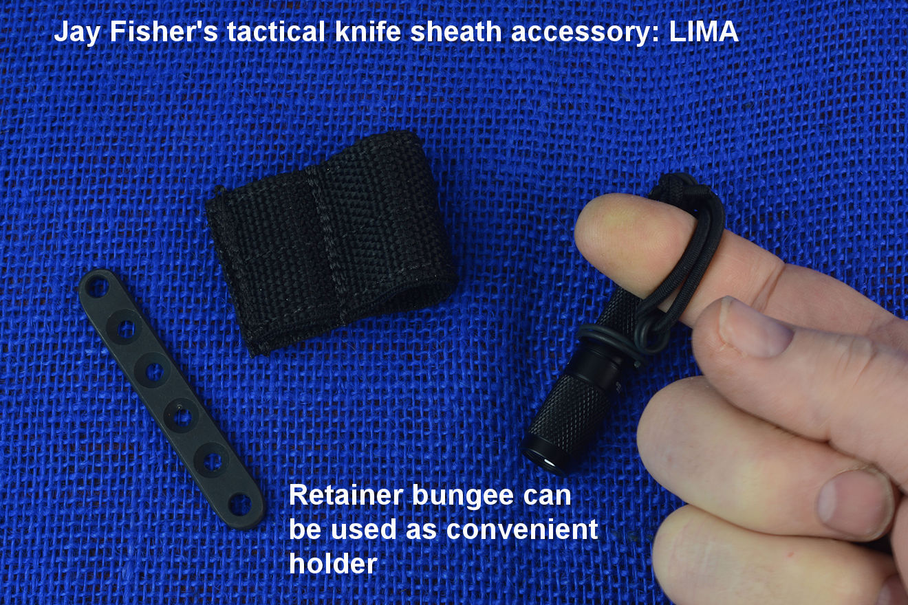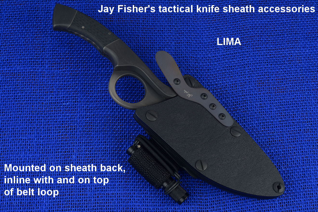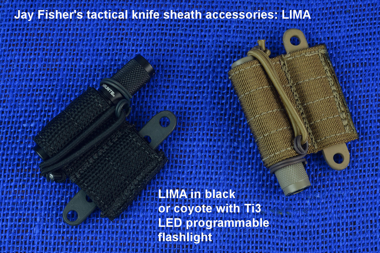 The acronym LIMA stands for "Lamp Independent Mount Assembly," and, like all of my tactical sheath components, it's my own invention. It's an extremely lightweight adjunct that can be used when your key light fails, or in the daytime when you aren't carrying your main flashlight, and need to look into a dark hole or enter an unlighted place. It is so innocuous that it's often forgotten on the sheath, but in critical times is immediately available. It is so tremendously popular that it's been demanded on all of my counterterrorism knife kits, because of the saying, "two flashlights are one flashlight, and one flashlight is no flashlights." If you are an active, outdoor person, you know exactly what I'm writing about, since being a mechanical and electrical device, failure will, sooner or later, visit you in the wilderness, and at the very worst time.