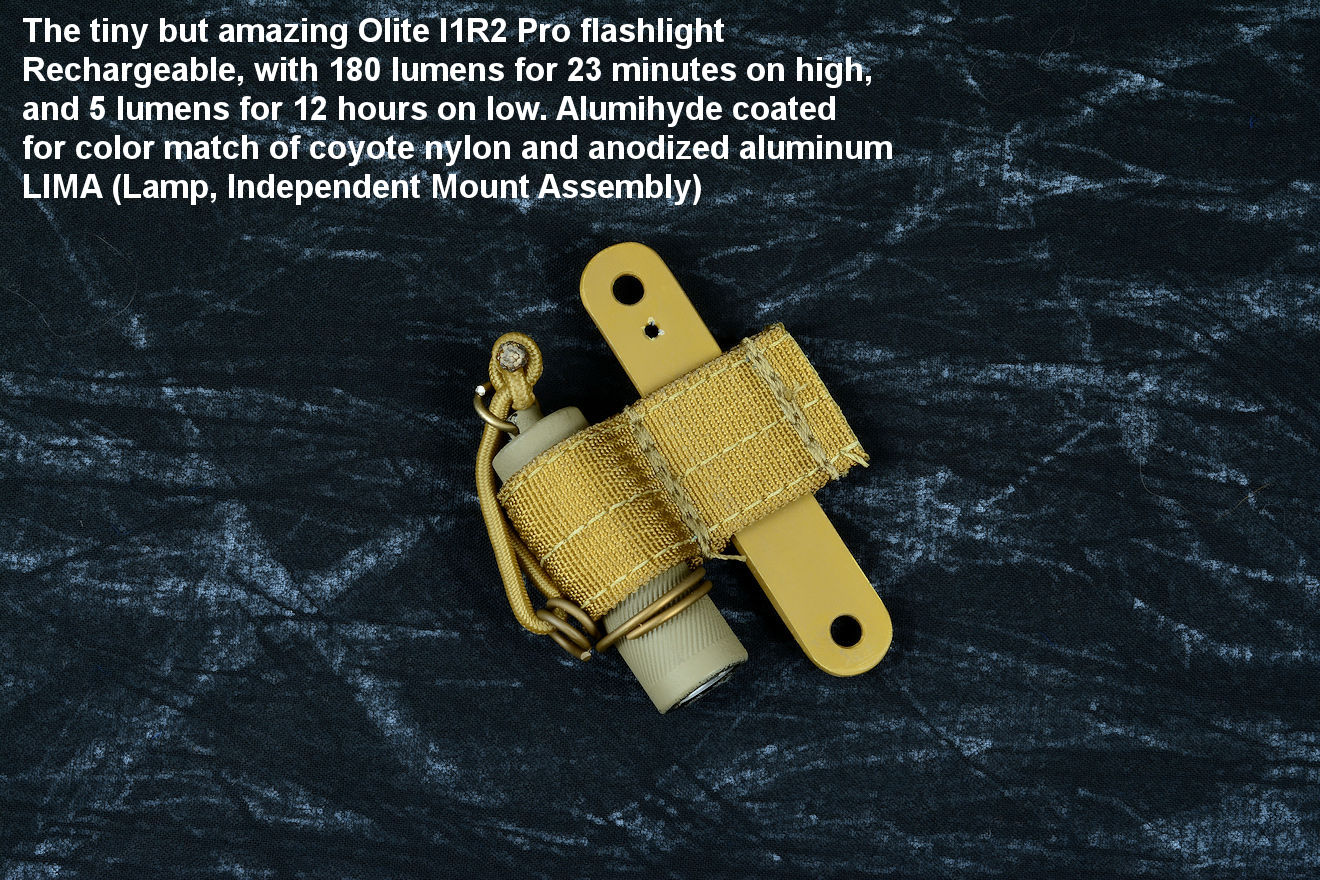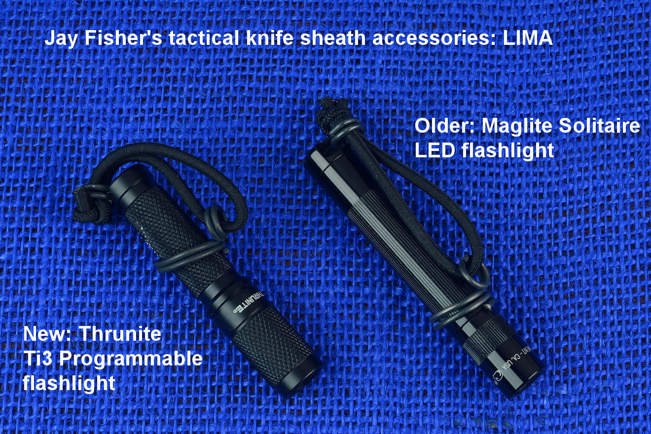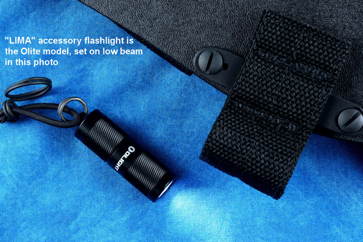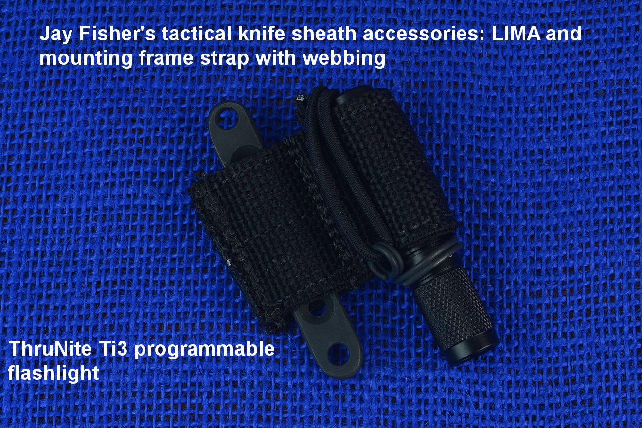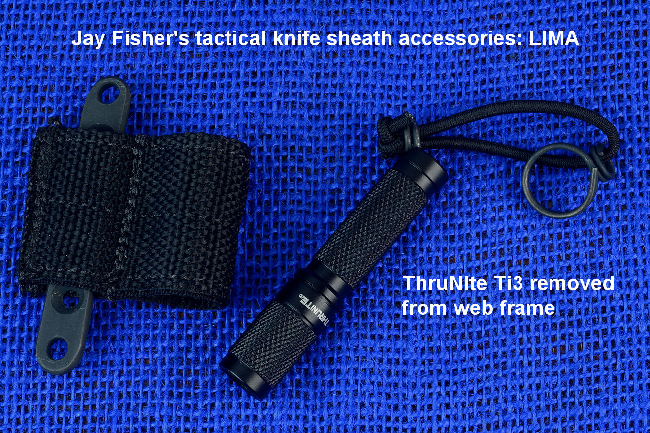 The acronym LIMA stands for "Lamp Independent Mount Assembly," and, like all of my tactical sheath components, it's my own invention. It's an extremely lightweight adjunct that can be used when your key light fails, or in the daytime when you aren't carrying your main flashlight, and need to look into a dark hole or enter an unlighted place. It is so innocuous that it's often forgotten on the sheath, but in critical times is immediately available. It is so tremendously popular that it's been demanded on all of my counterterrorism knife kits, because of the saying, "two flashlights are one flashlight, and one flashlight is no flashlights." If you are an active, outdoor person, you know exactly what I'm writing about, since being a mechanical and electrical device, failure will, sooner or later, visit you in the wilderness, and at the very worst time.