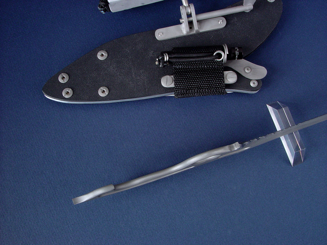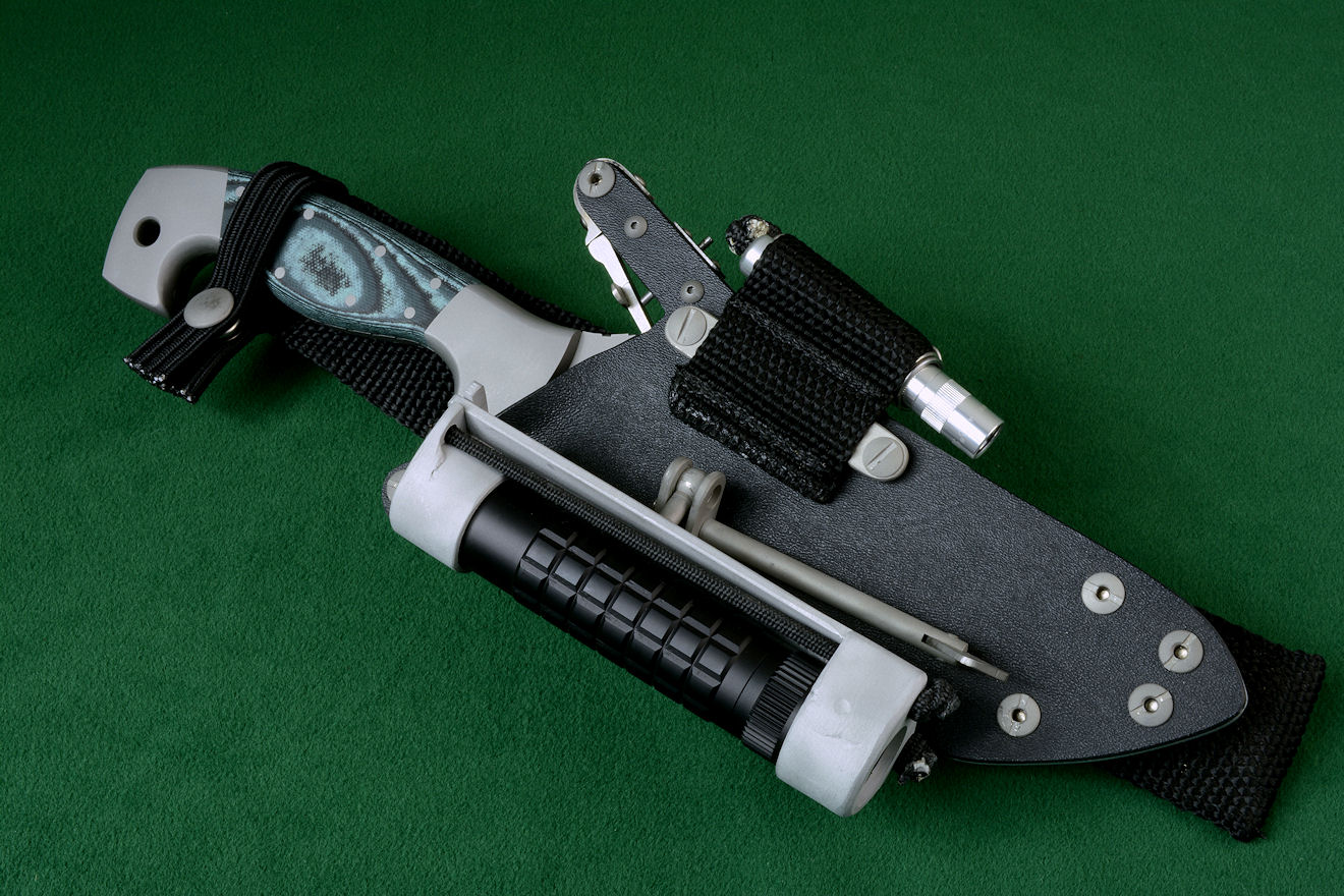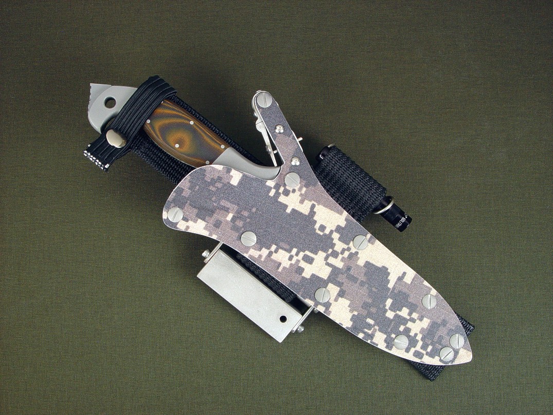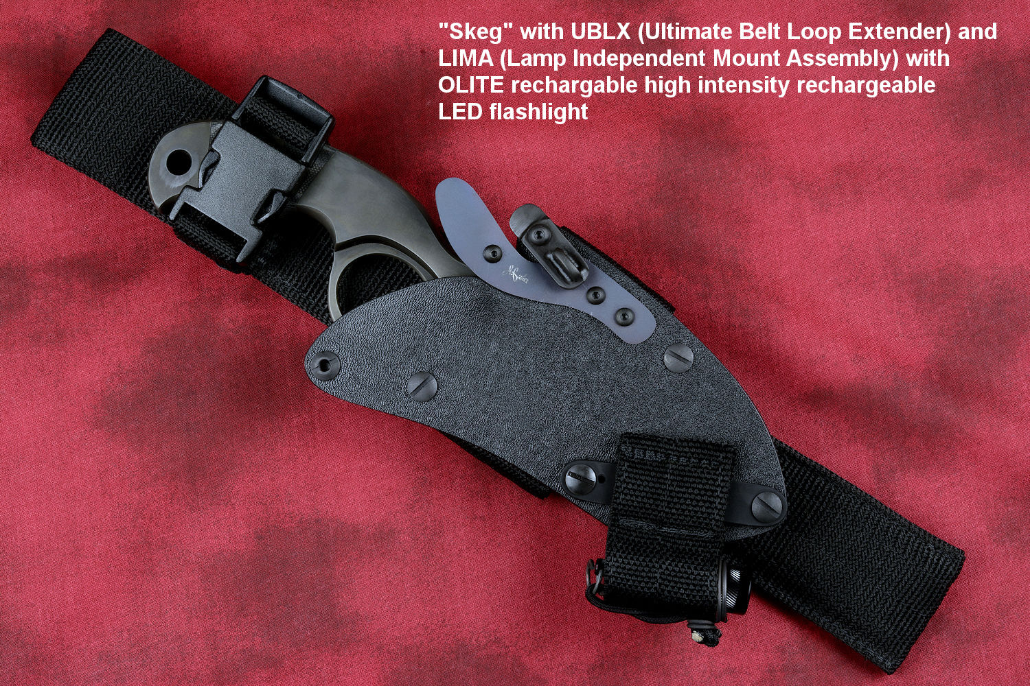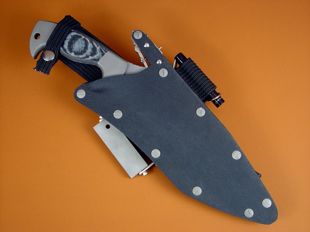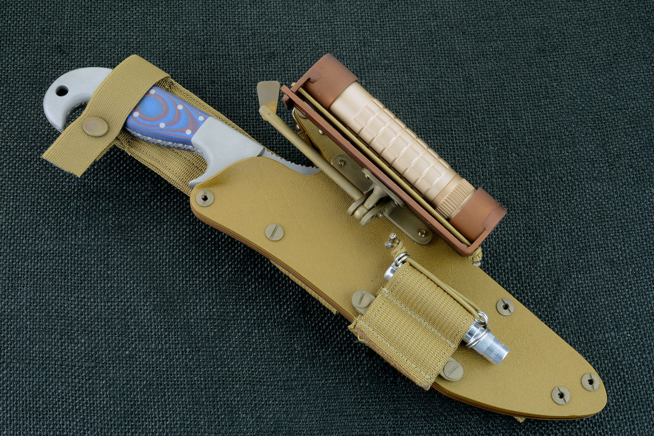 The acronym LIMA stands for "Lamp Independent Mount Assembly," and, like all of my tactical sheath components, it's my own invention. It's an extremely lightweight adjunct that can be used when your key light fails, or in the daytime when you aren't carrying your main flashlight, and need to look into a dark hole or enter an unlighted place. It is so innocuous that it's often forgotten on the sheath, but in critical times is immediately available. It is so tremendously popular that it's been demanded on all of my counterterrorism knife kits, because of the saying, "two flashlights are one flashlight, and one flashlight is no flashlights." If you are an active, outdoor person, you know exactly what I'm writing about, since being a mechanical and electrical device, failure will, sooner or later, visit you in the wilderness, and at the very worst time.