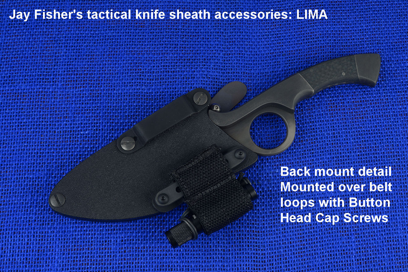 The LIMA can even be mounted on the back side, over the top of the belt loops, if the wearing allows it in the client's arrangement. This can allow wearing of web that traps the knife sheath (over the top of the sheath instead of the sheath on top of the web). If there is enough room, the LIMA can even be worn completely hidden in the back of the sheath. If mounted over the belt loops, the web presses down on the aluminum belt loop, holding it in place, and the included button head cap screws hold the entire assembly together. There is also the option of an offset mounting, where one end of the LIMA mount frame is on top of the belt loop and the other end is screwed through an open sheath hole.