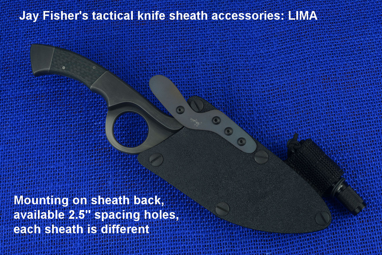 The only thing to remember is that there must be a 2.5" spacing between the sheath holes. If the spacing is not there, or is not 2.5", the screws can't be forced; they will cross-thread and be ruined! Every sheath is different, since every knife is a different size, but this photo set below should give you a good idea of the mounting potential of the LIMA.