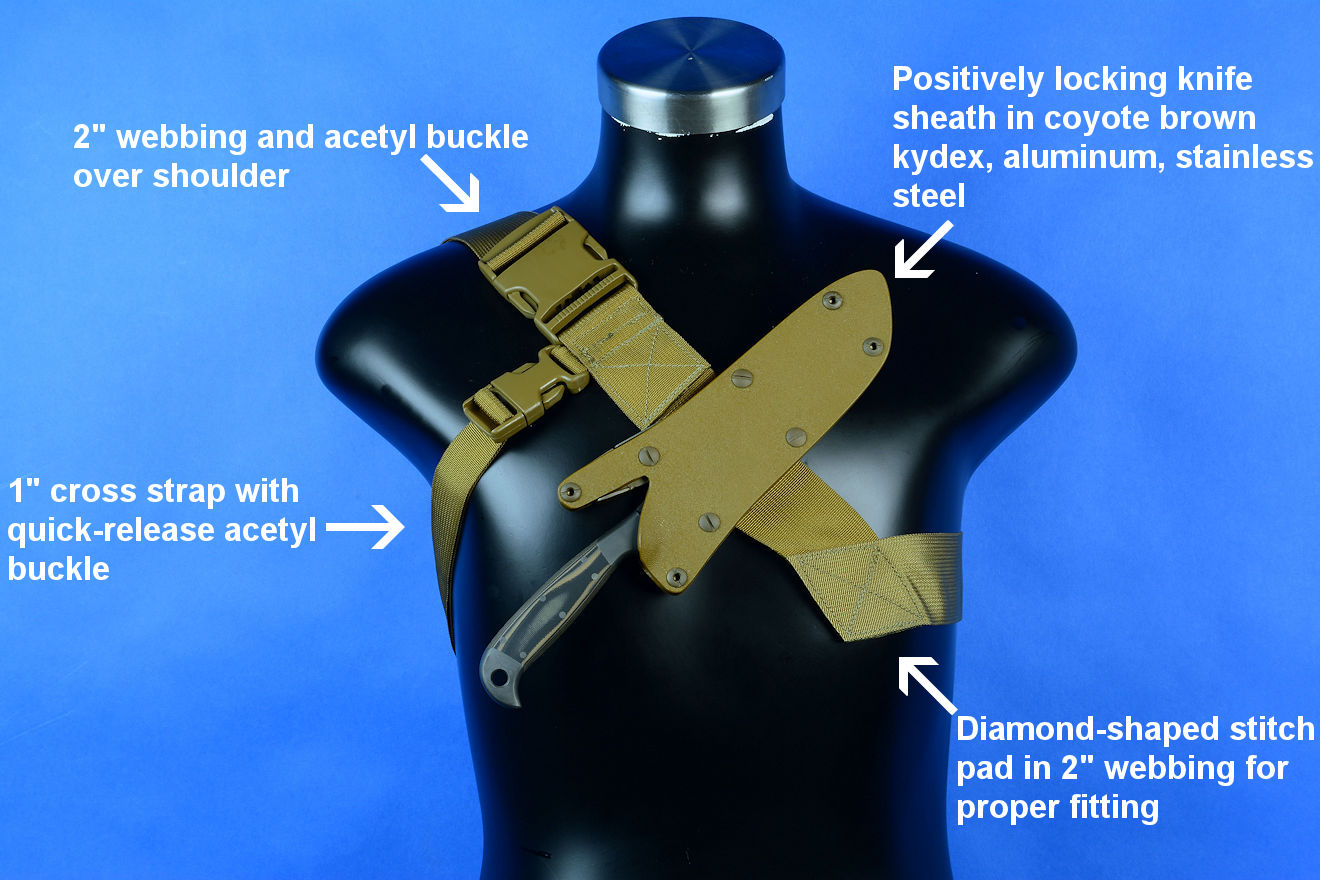 The release buckles make it easy to don, as well as doff. Usually, just releasing the 1" buckle is all it takes, and the rig, with knife sheath attached, can be lifted over the head and left arm. To don the rig, simply position the knife at the sternum, and put the left arm through the 2" webbing loop. Reach behind the back, grab the 1" web, and snap the buckle in place. Once it's properly adjusted, it takes seconds to do this.