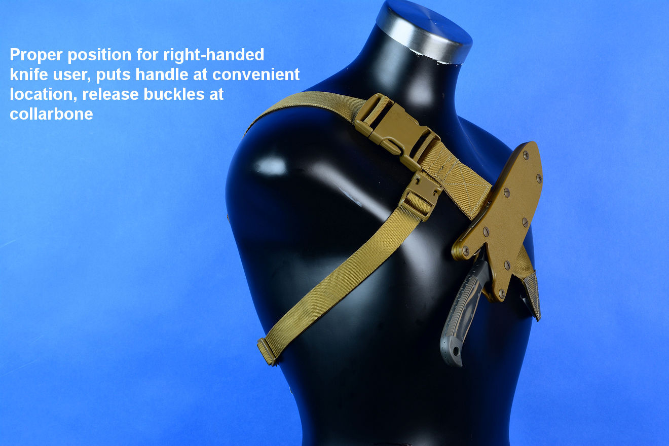 The knife sheath is attached just below the 2" release buckle, which is just at the wearer's right collarbone. The knife sheath is clamped to the webbing with the included 304 stainless steel vertical clamping straps or the vertical flat aluminum clamping straps, and the orientation of the knife handle is down. Because these are locking sheaths, the knife won't fall out. The knife handle is at the perfect place, just below the sternum, available to the right hand in an instant.