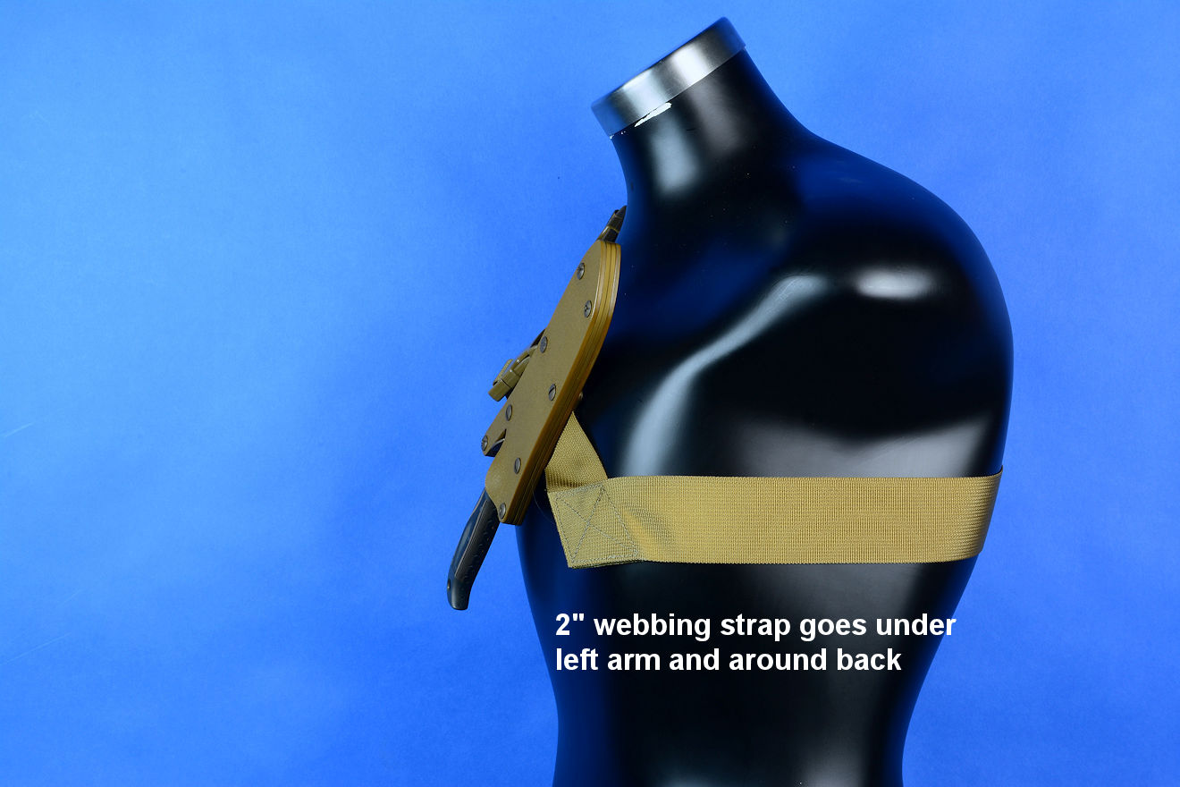 For the right handed user, the design is such that a 2" wide strap goes over the right shoulder, bearing most of the weight of the knife and sheath, and lays over the back. It's path from the back is under the left armpit just at the lower rib cage, and then is angled to lay against the user's front. This forms a ring of webbing. This is not a straight web run; there are some critical angles to understand and incorporate into the piece, so it's constructed of several pieces heavily stitched at angles to each other. The main stitch apex is in the shape of a "diamond," easy to reference in the photos and during mounting of the knife sheath.