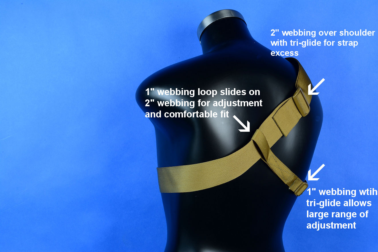 To hold the webbing fast and prevent bouncing, my latest versions of the sternum harness plus have a 1" wide web that is permanently attached with a release buckle snap to the 2" web buckle point, very close to the knife sheath mount. The 1" webbing path is under the right arm, around to the user's back, where it has a moving loop of webbing around the 2" strap. This allows a wide range of adjustment of the harness for different users, sizes, and wear to clear and accommodate gear. Also, the loop allows some limited movement since the wearer will be very active in missions and combat, or even if he's hiking through a forest.