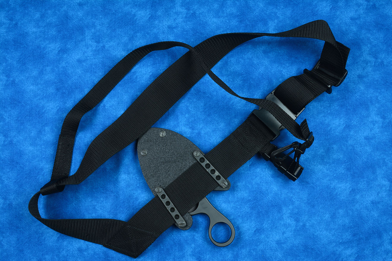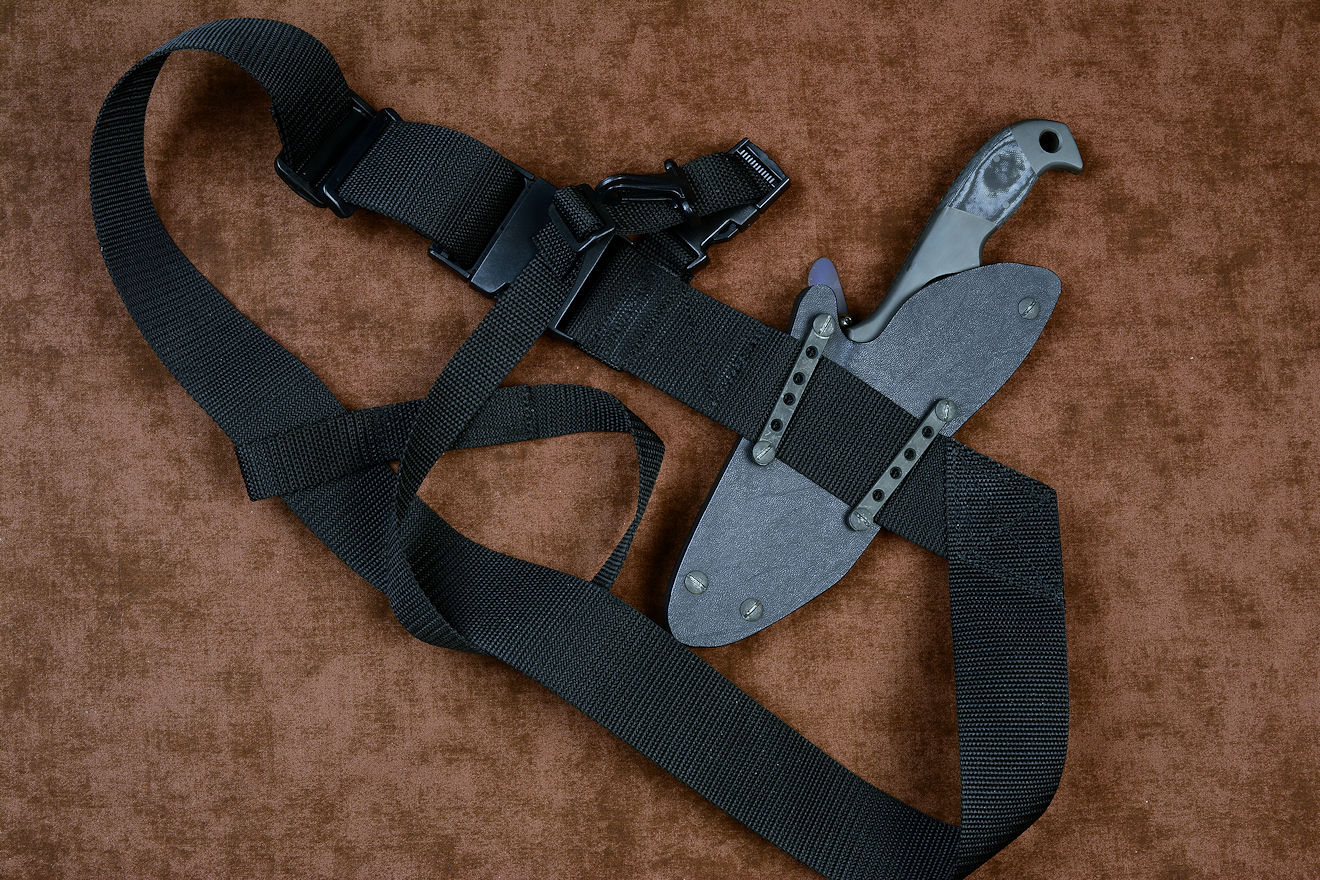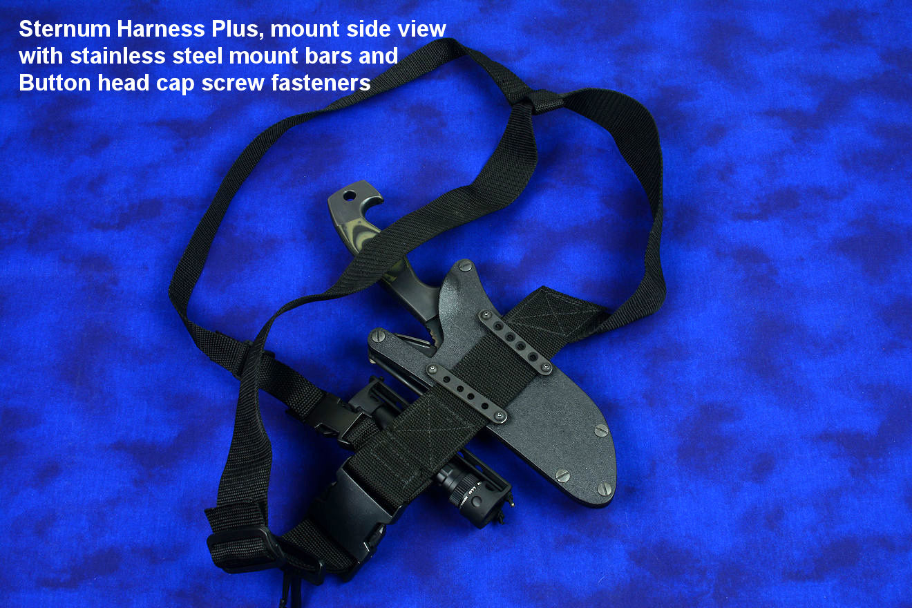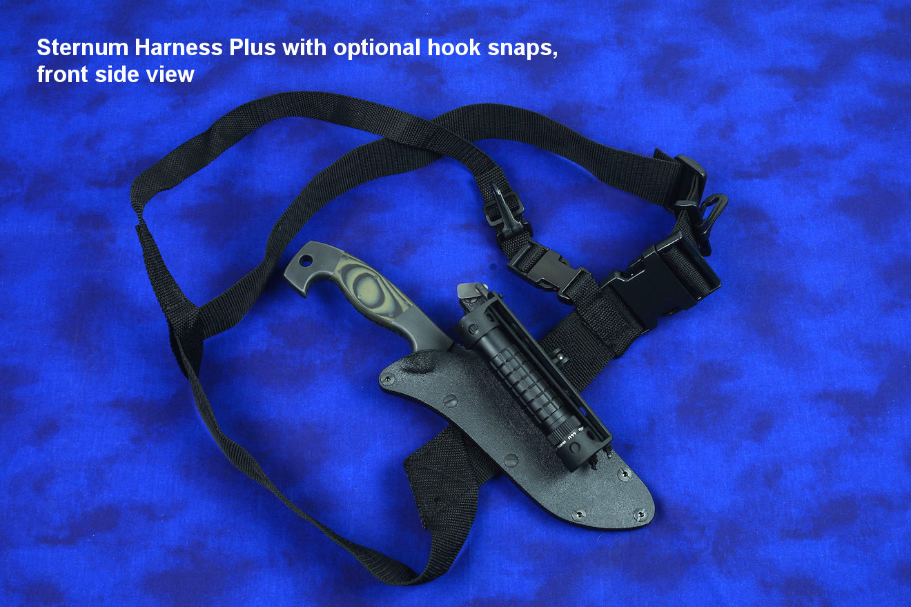 Like all of my accessories, the sternum harness was created because several of my military clients requested a knife rig that could be worn on the outside of their gear, with the knife handle down, at their sternum. Some of the early models were even used in jumps (parachute).