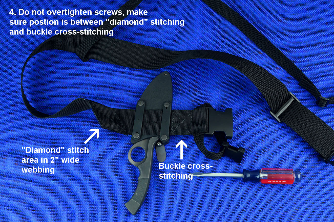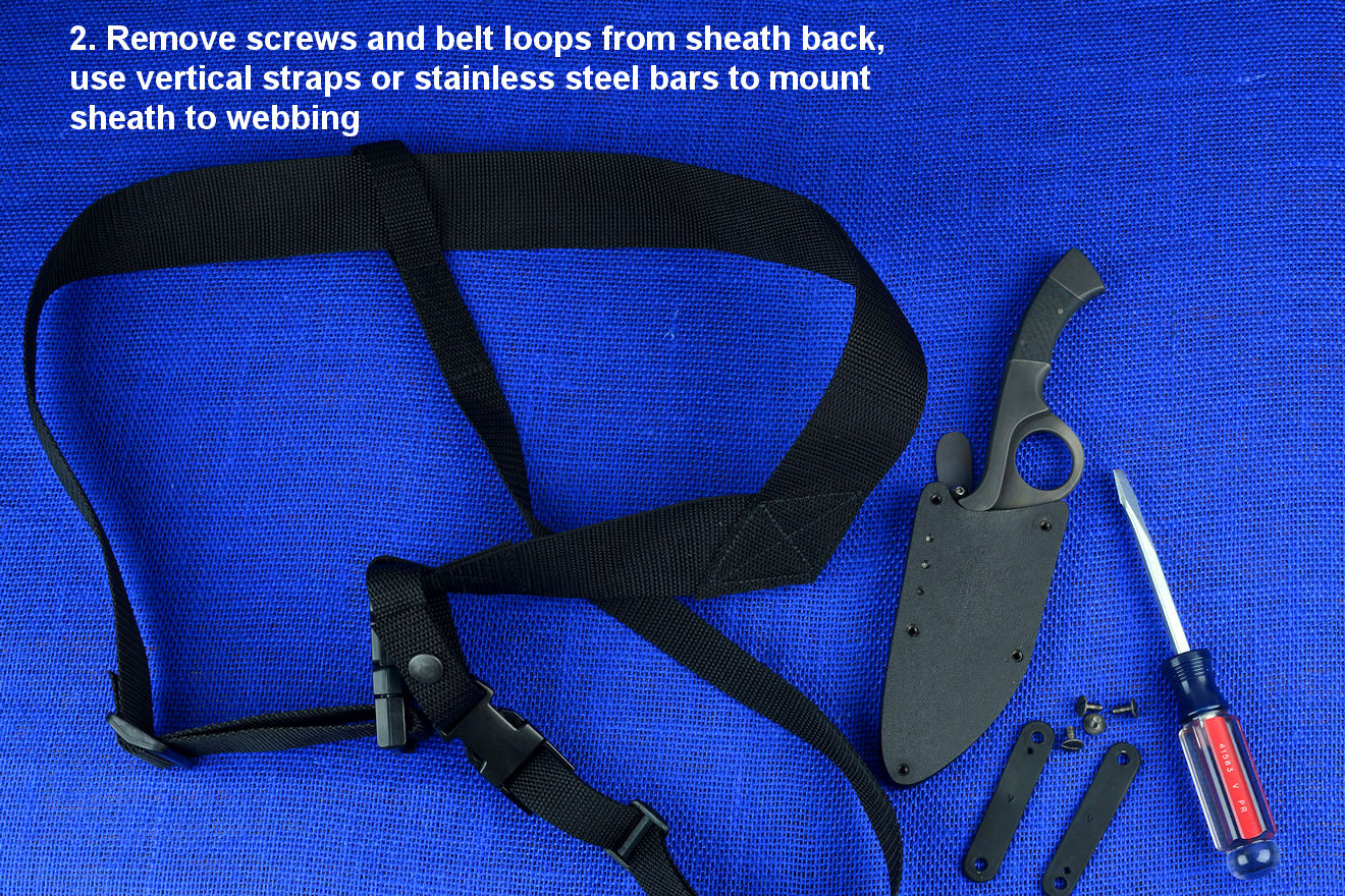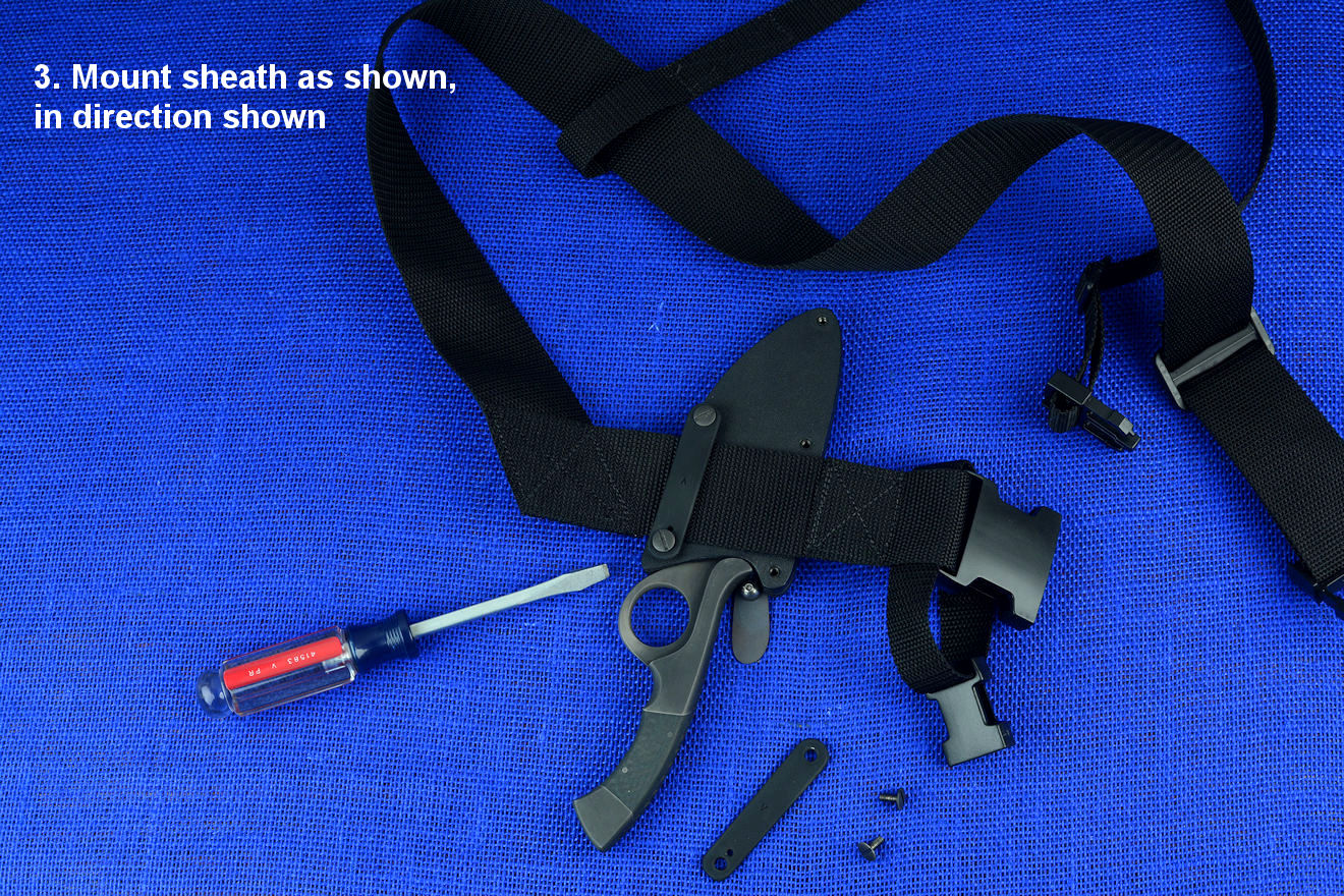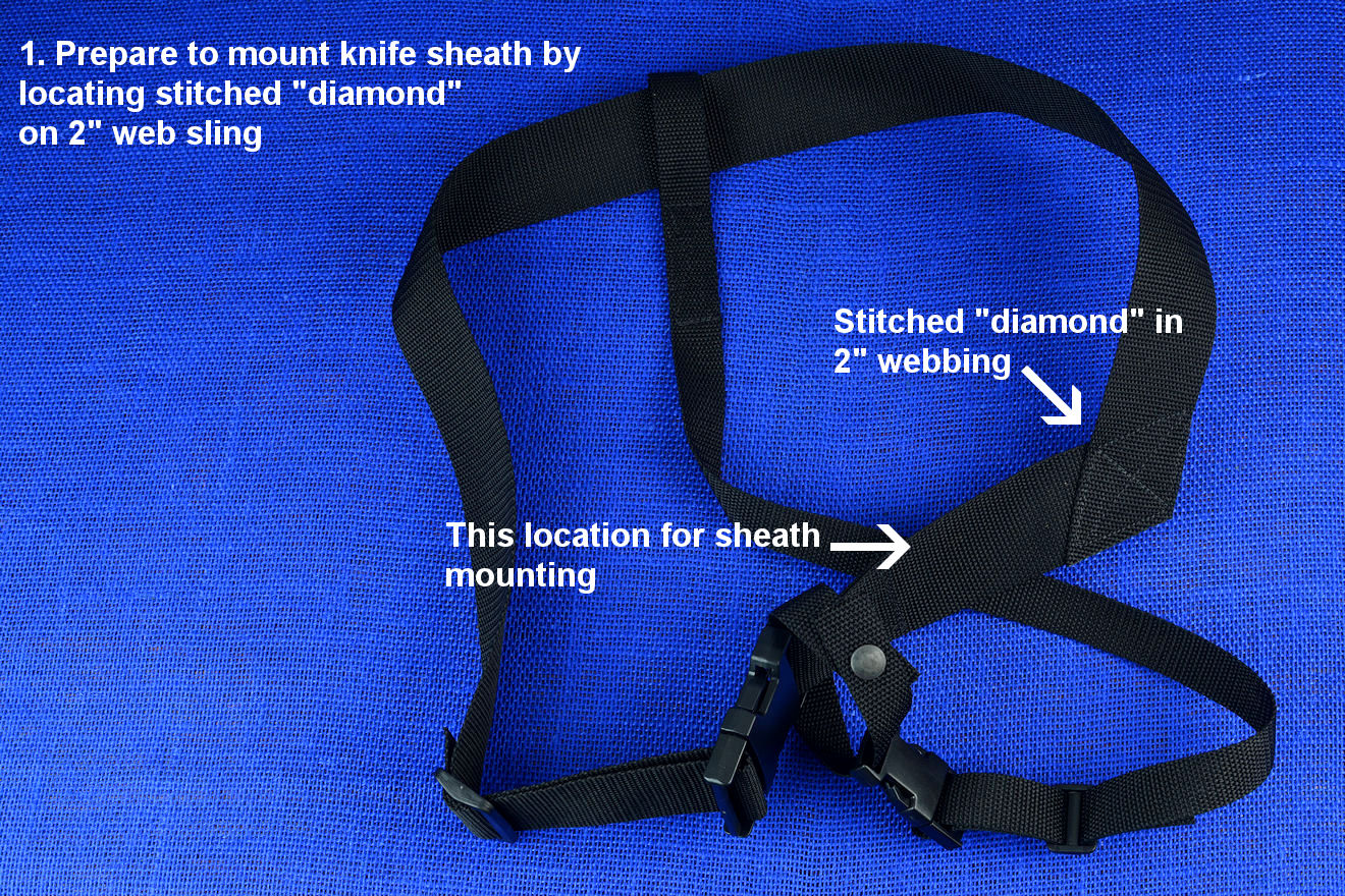 Mounting the knife sheath to the sternum harness plus is a fairly straightforward affair. Just look over the annotated photos below, follow the simple steps, and you're golden.