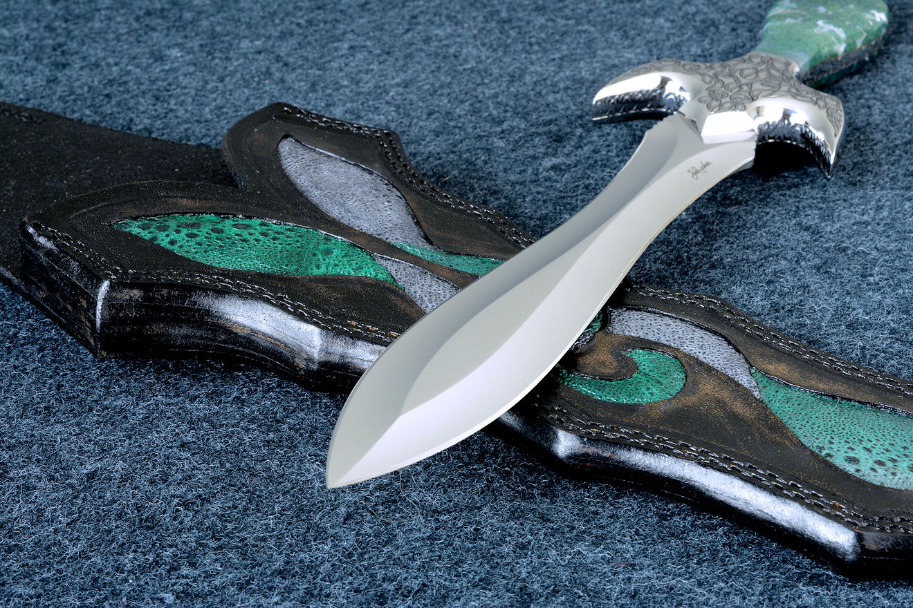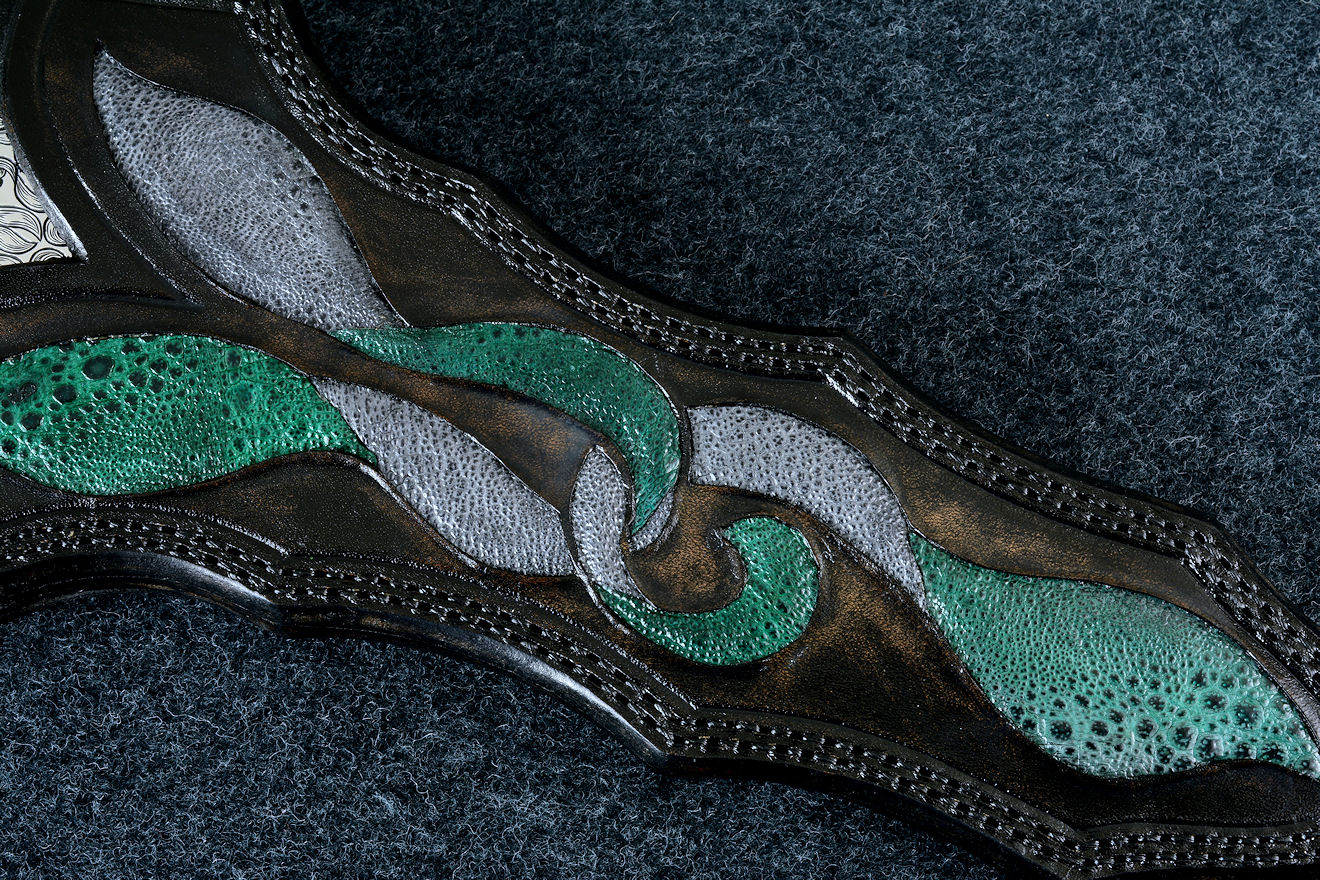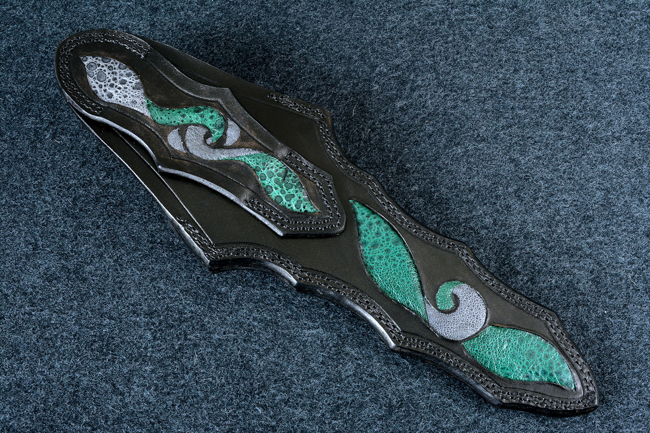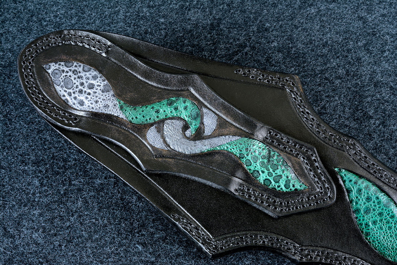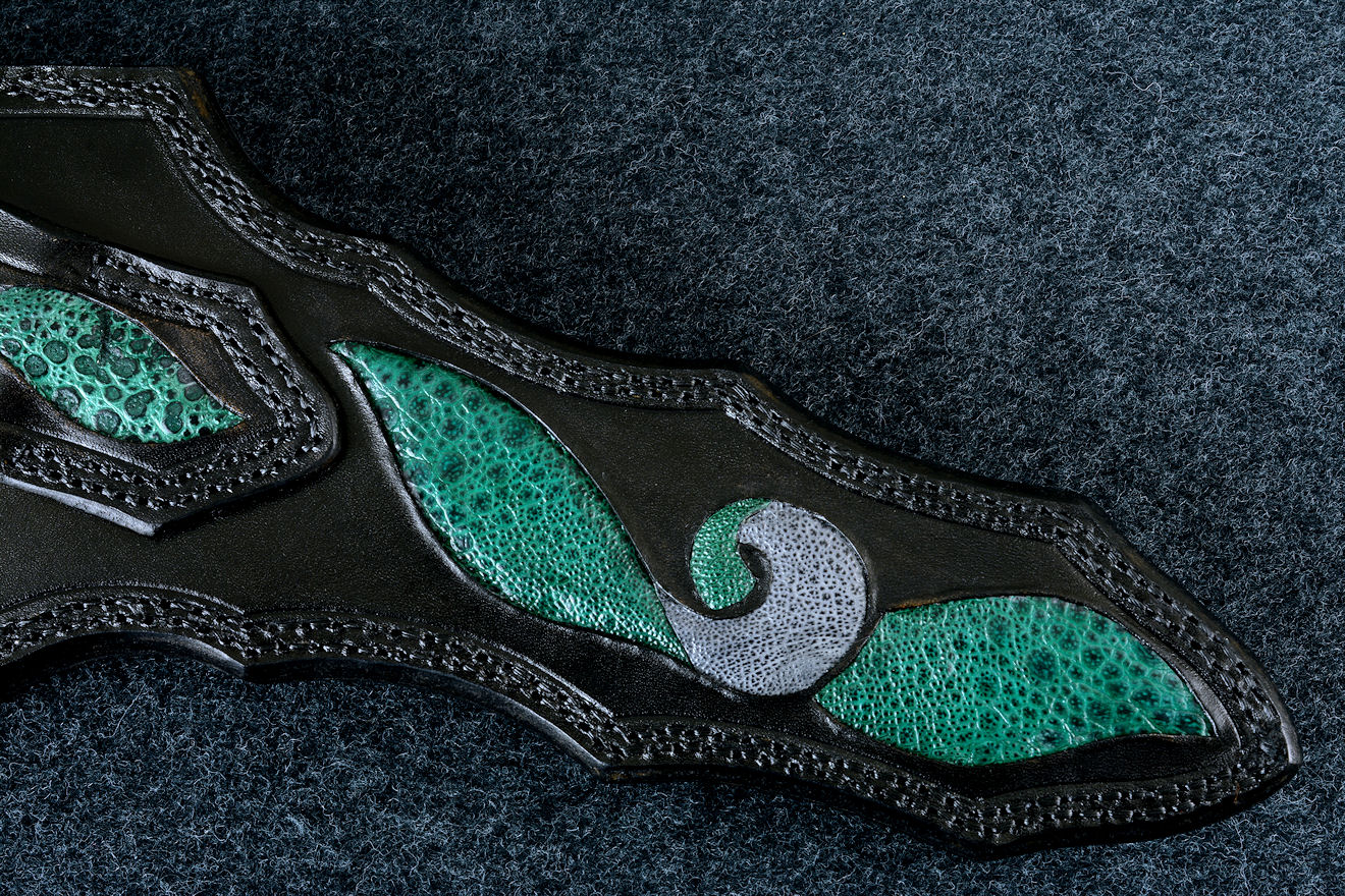 - Sheath: Hand-carved leather shoulder inlaid with bi-colored frog skin