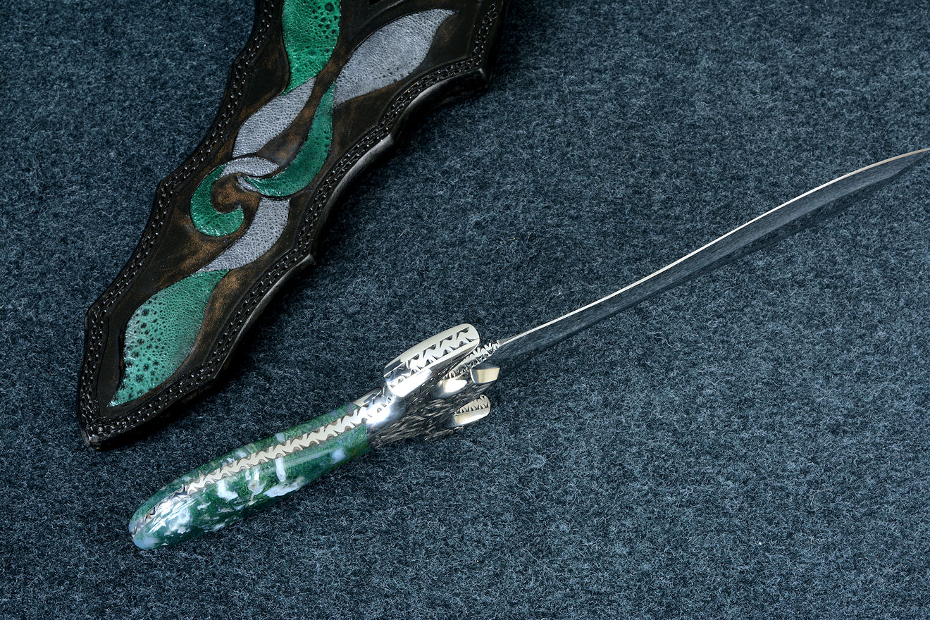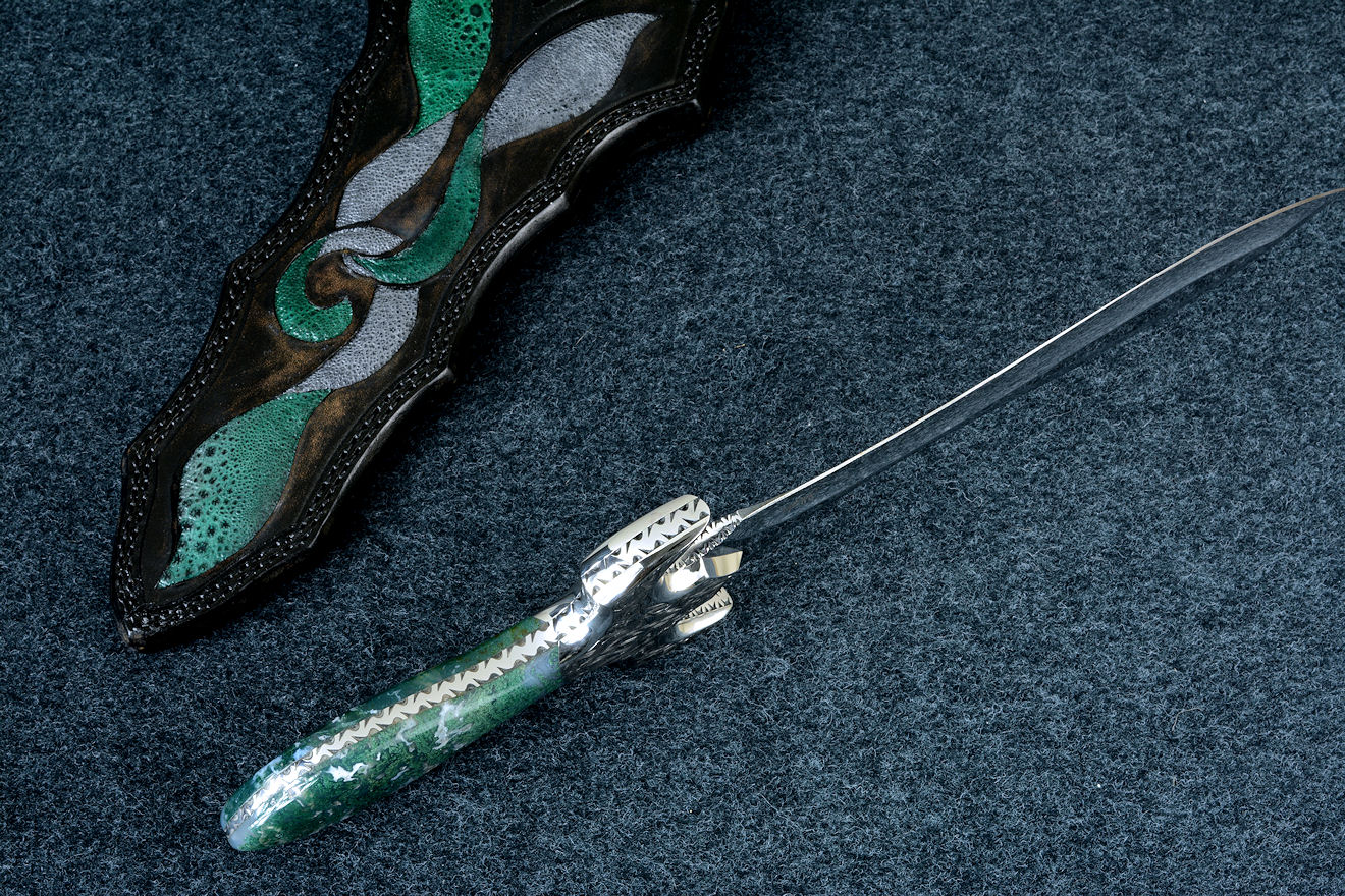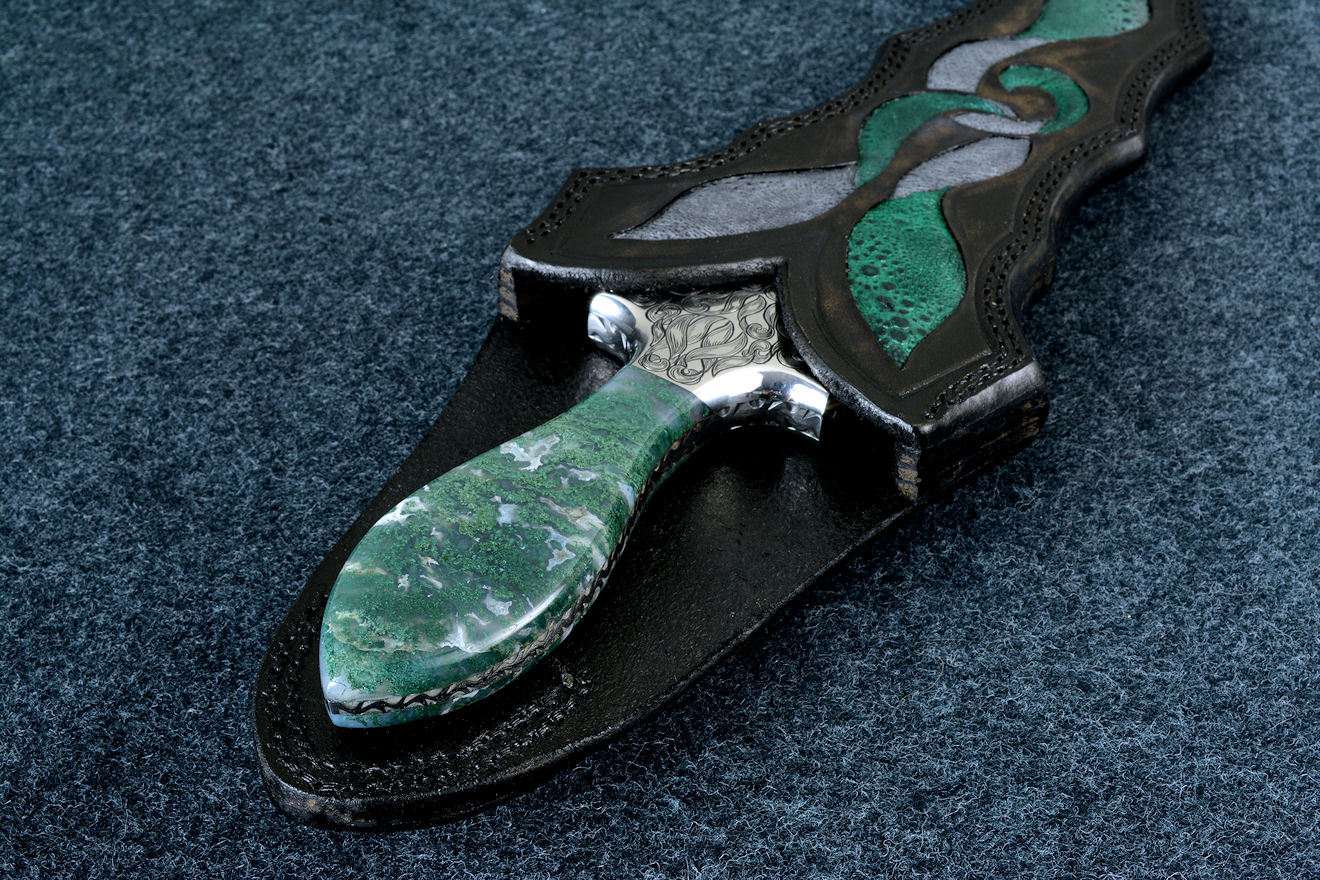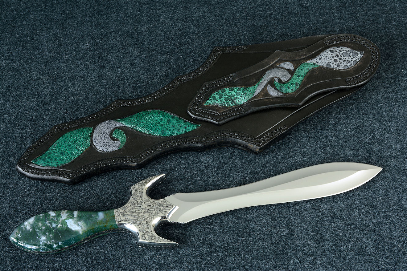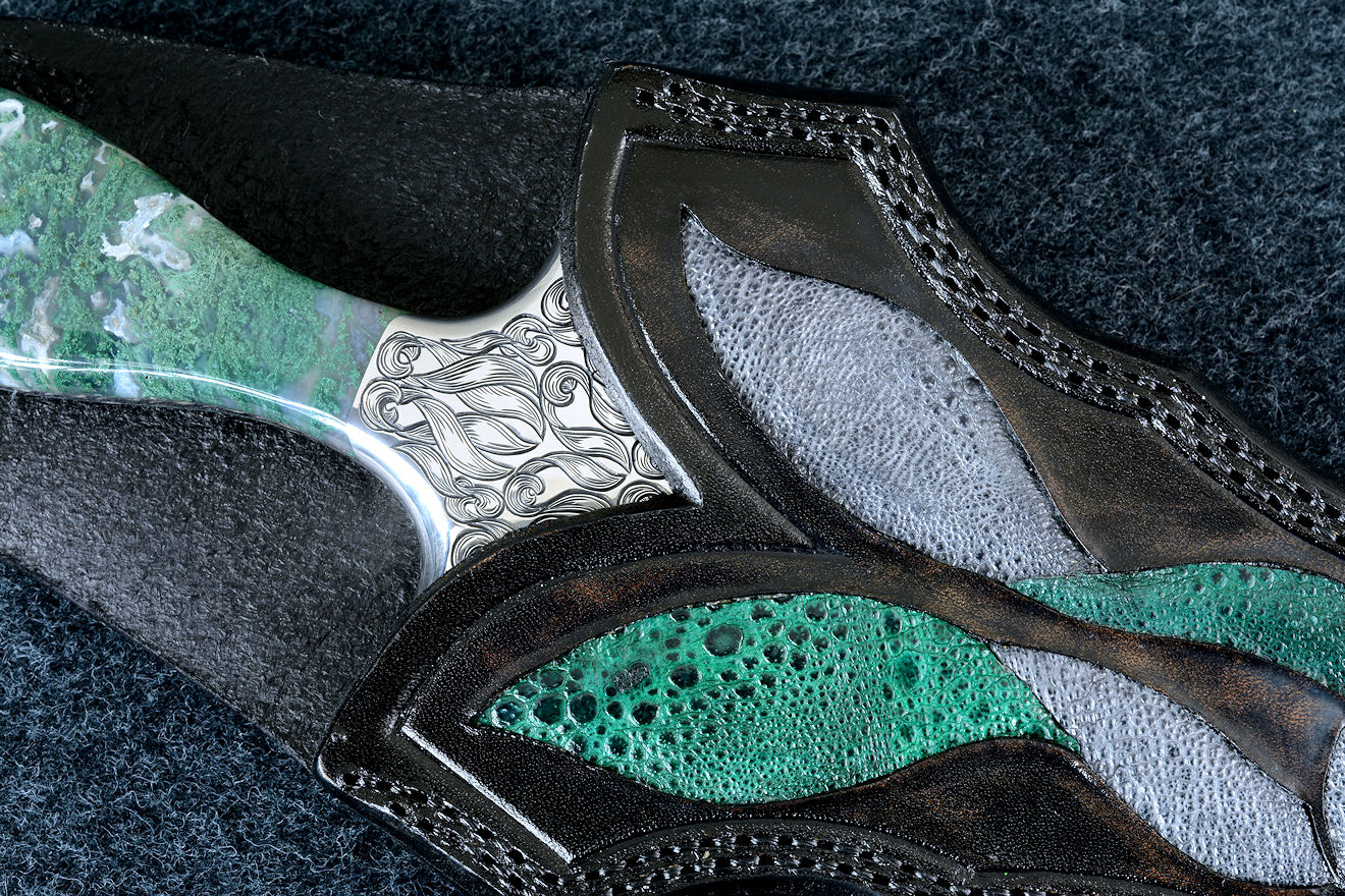 - Sheath: Hand-carved leather shoulder inlaid with bi-colored frog skin