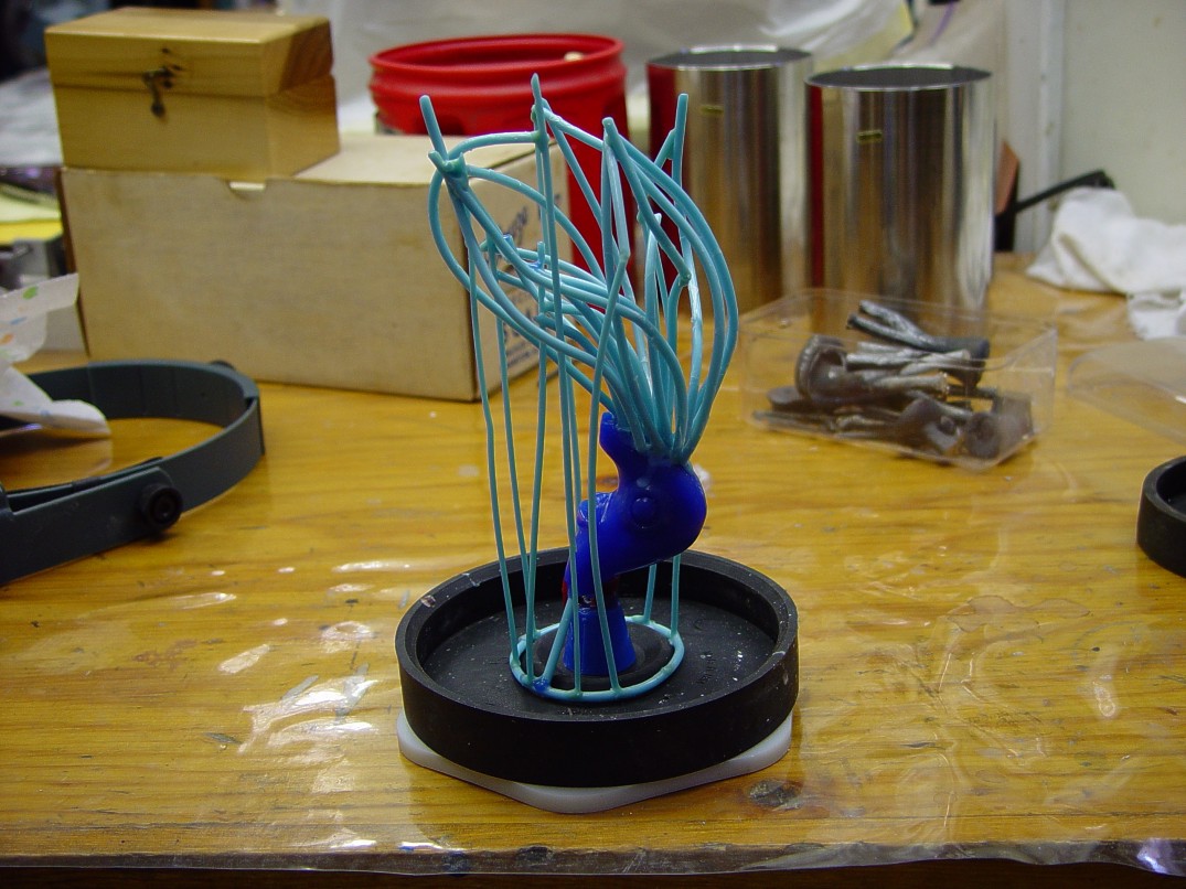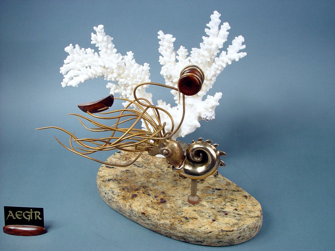 I sculpted the prehistoric nautilus in wax, and then cast the sculpture in bronze. I made no molds, this was to be a singular, lost wax process sculpture, never to be repeated. I took some liberties with the nautilus form and let my imagination create what I needed for the artwork. I added some fins on the shell, (from an illustration of a prehistoric nautilus), and gave my creature an extra length measure of tentacles for its task. Although I created a creature of over 20 tentacles, it was much more manageable than the modern creature which has 94! I also gave my creature large and serious eyes, and a bit of a beaked mouth. I cast the sculpture in bronze, polishing the shell brightly, but gave a coarser, living texture to the animal within. The creature embraces a windlass spool and a boat of carved Honduras Rosewood, on which Aegir solidly rests.
