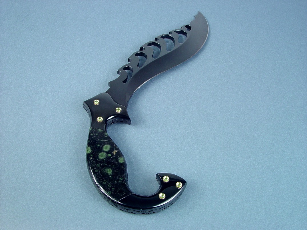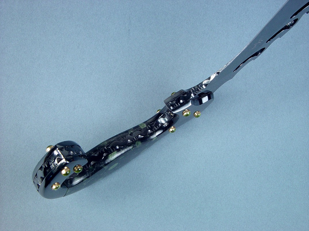 The wild curves of the handle required some very special treatment, as I wanted the bolsters as well as all metal parts of the knife to have the same, deep penetrating mirror black finish. The blade would have to be made and pre-finished, The bolsters attached, the gemstone attached temporarily, the entire blade, bolsters, and handle finished, the entire assembly taken apart, the blade heat treated, polished and finished, the components all polished and finished, hot blued where needed, and then accurate reassembly of the entire piece would top it off. Consequently, this is one of the hardest knives to build. The bolsters are contoured, polished, finished and attached with stainless steel machine screws, and capped with 14 kt. gold cup bezels that hold 12 solid Peridot gemstone cabochons. The Peridots (Olivine) have the light sea-green color I wanted to accent the black base, while echoing the rounded forms of the fascinating green patterns of the Nebula Stone. This Peridot comes from an island in the Red Sea, and is also called evening emerald because it darkens at night. How fitting these gemstones are for Aegir and I couldn't help but think of green eyes of a creature of the sea staring from the abyss.