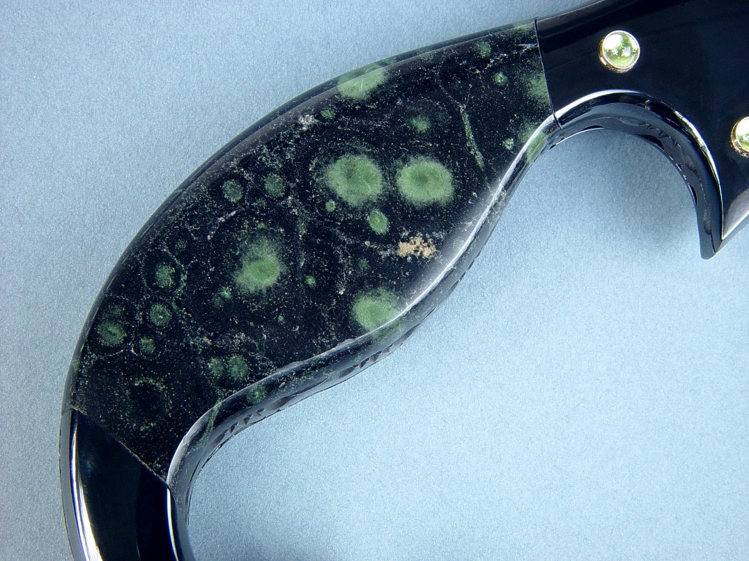 The handle of Aegir is very unique indeed. I can comfortably claim that this is the first knife in history to have a Nebula Stone gemstone handle, since the discovery of this new gem is very recent. There is only one source and he has not supplied Nebula Stone material to any other knife maker or knife artist. This is the main reason I created Aegir, to preview this rare discovery. The Nebula Stone handle scales are a fascinating gem, composed of quartz, zircon, anorthoclase, riebeckite, and, of course, aegirine (acmite). This mysterious stone lacks a defining classification; some call it a jade, but scientists generally agree that it is a new, exciting find. The discoverer of the gem named it Nebula Stone, because the green orbs floating in black space appear to be nebula like, with scatterings of star-like mist circling the nebulas. The gem is hard, tough, and takes a bright, smooth and lustrous polish, and will outlast us all! I could imagine a Norse god of the sea taking a special liking to this unique material. (References and links to more information about Nebula Stone below).