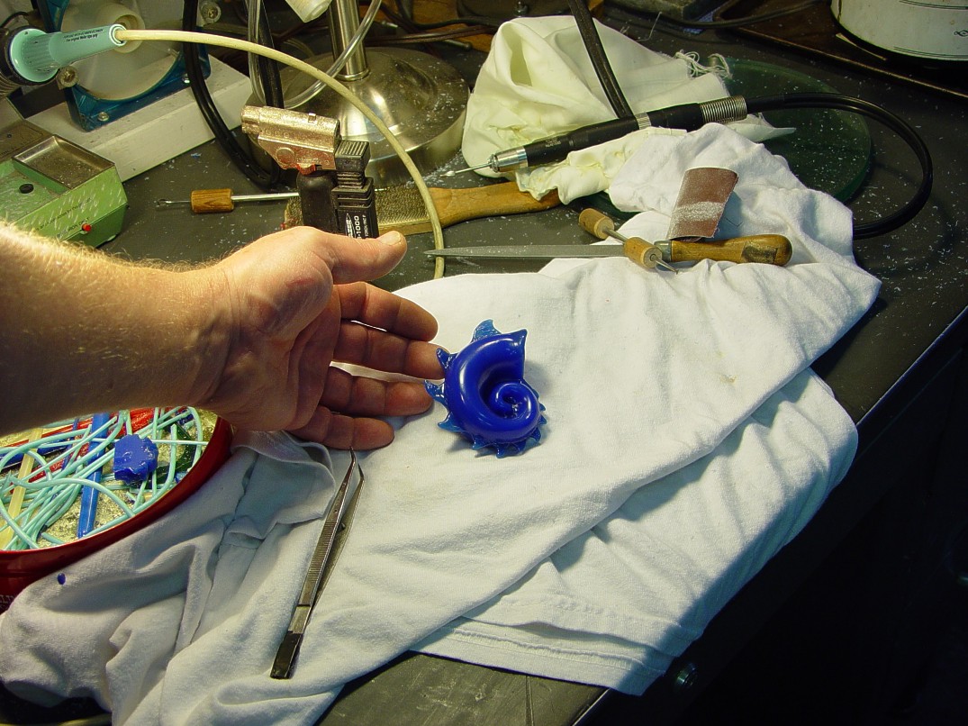 With full and detailed contouring and radiusing, the knife feels comfortable and easy in the hand. The shape of the handle is inviting, and the thumb is naturally drawn over the front bolster at the rise. The angle of the blade to handle places the wrist at ease, and the weight of the knife reminds you that it is a substantial work of art. It is one of the most striking forms I've ever created, and so to complete it, I let the knife and theme guide the effort.