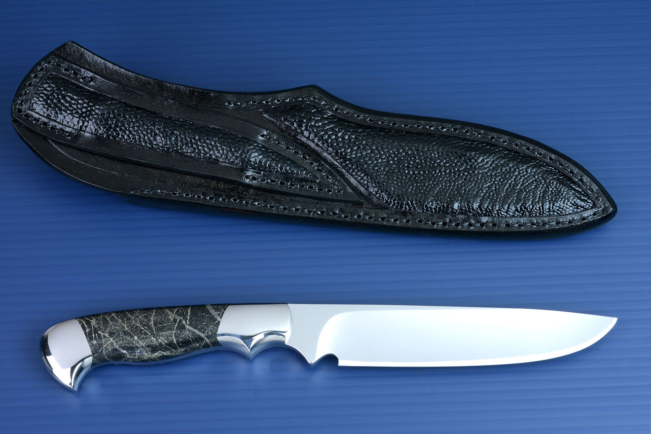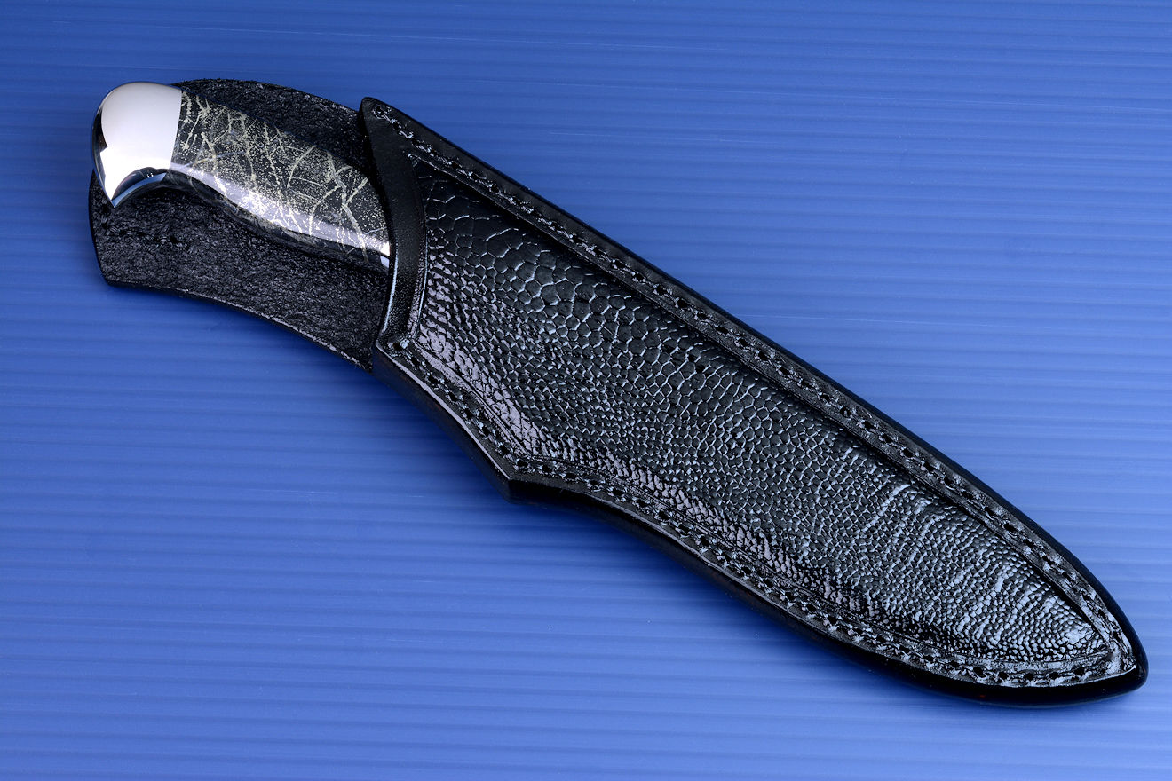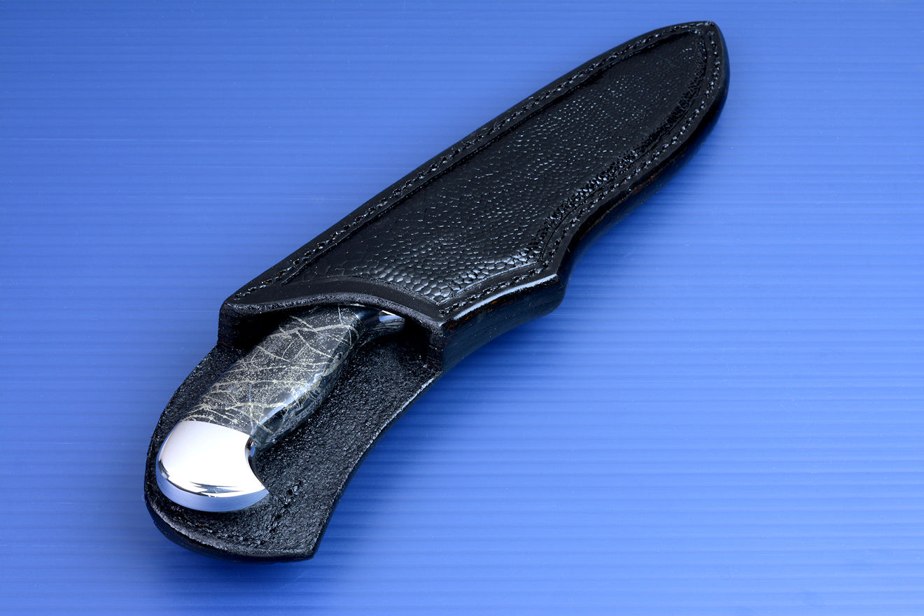 sheath in 9-10 oz. leather shoulder, and hand-carved large inlay