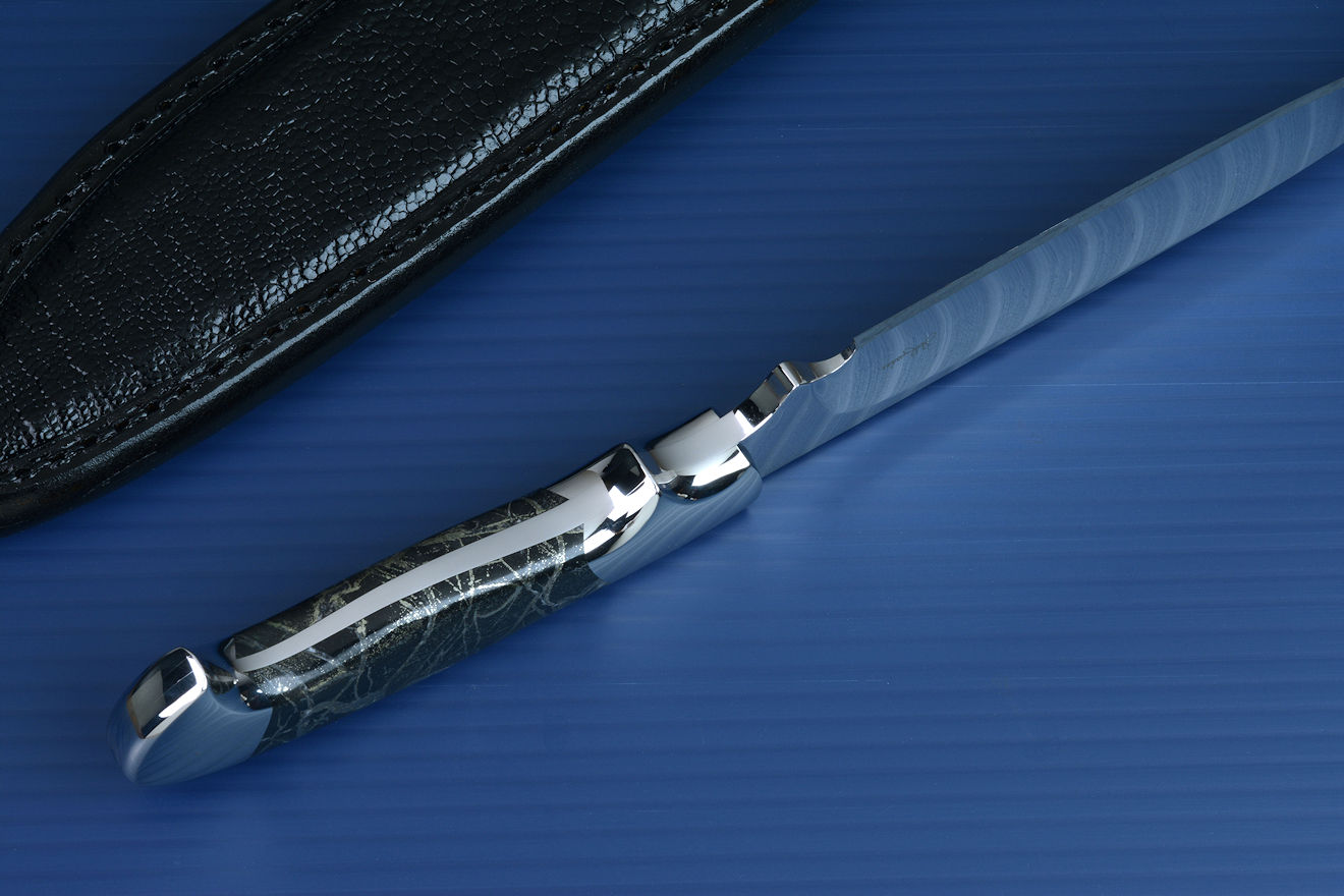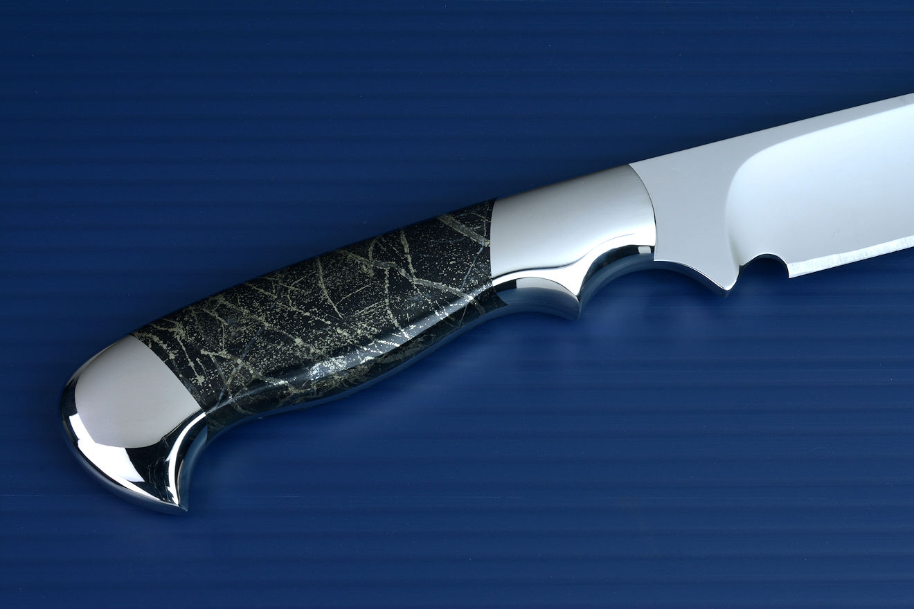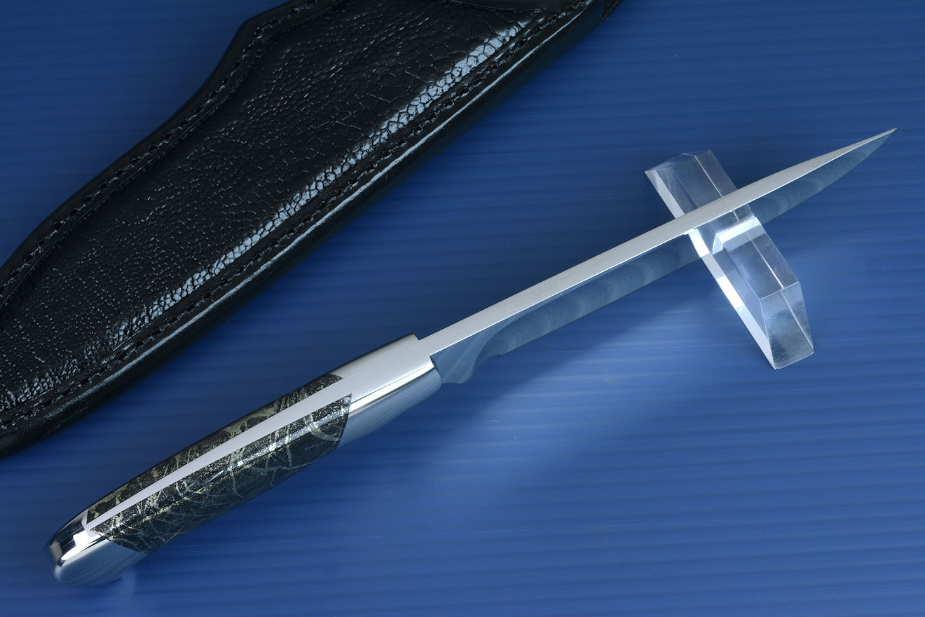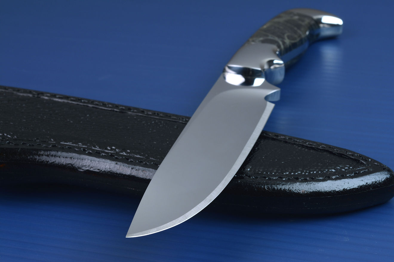 sheath in 9-10 oz. leather shoulder, and hand-carved large inlay