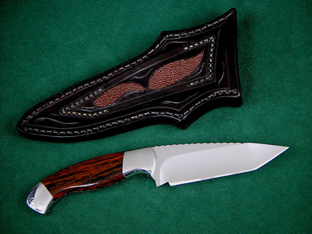 Sheath: The sheath had to match the knife, so I made one of my beautiful black pocket sheaths, with seven perfectly matched inlays of tough brown rayskin