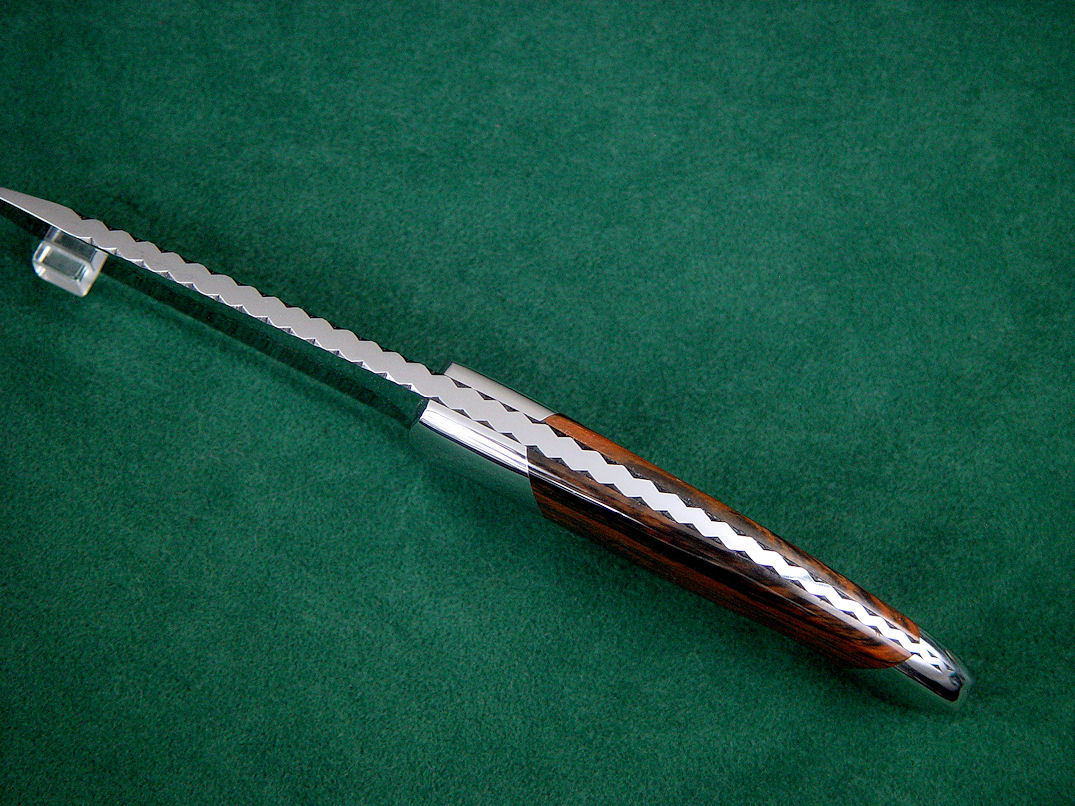filework, a light zig-zag pattern that extends completely around the fully tapered tang. The knife has a matching angular choil for good edge definition