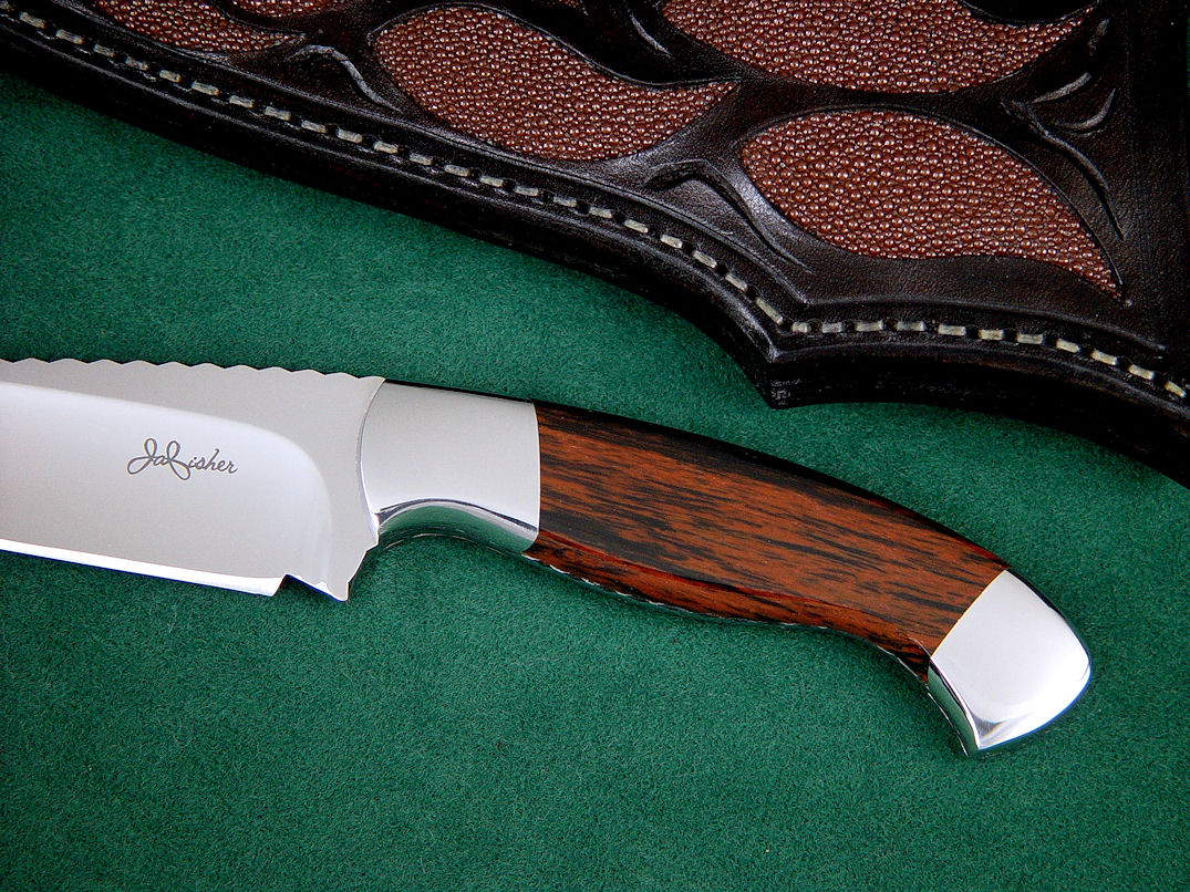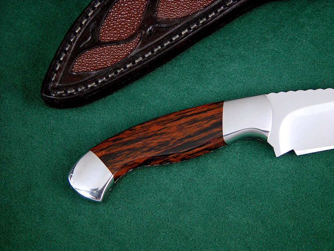 sheath is hand-stitched with polyester sinew, the toughest binder on the market, lacquered, and sealed. The knife sits deep and protected in the sheath,