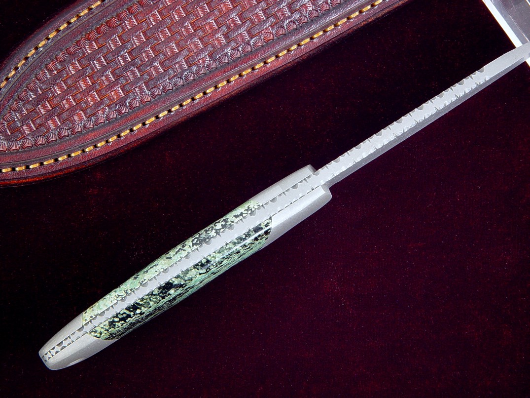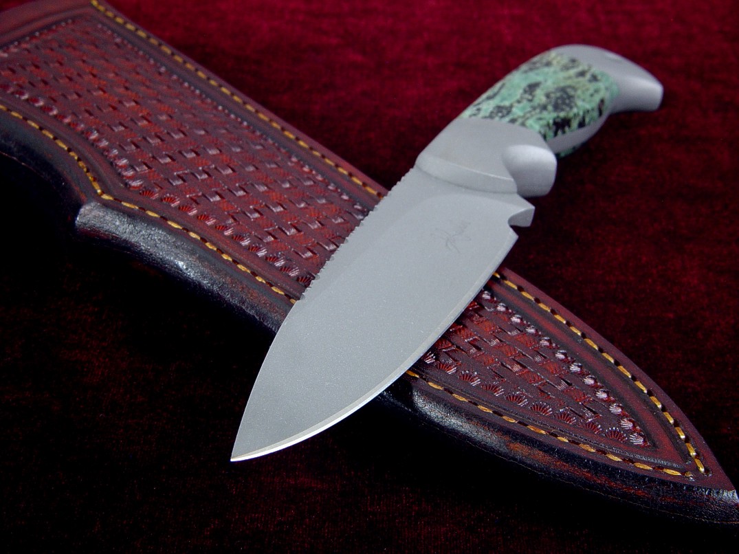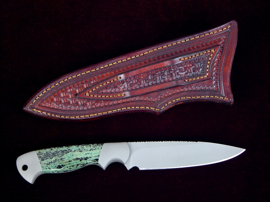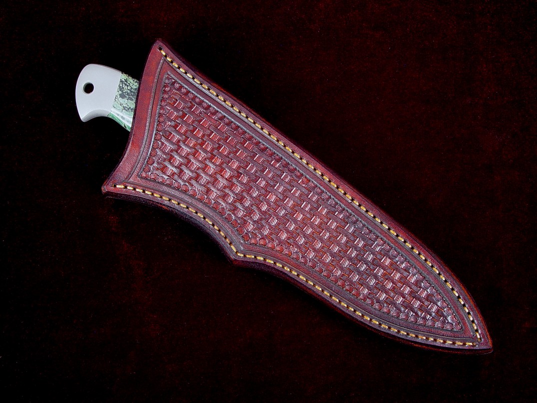 - Sheath: Hand-Stamped Basketweave 9-10 oz. Leather Shoulder