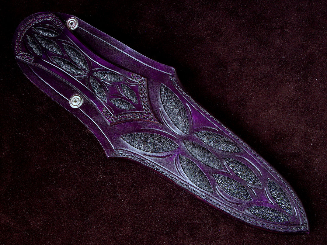 - Sheath: Black Rayskin inlaid in hand-carved leather shoulder
