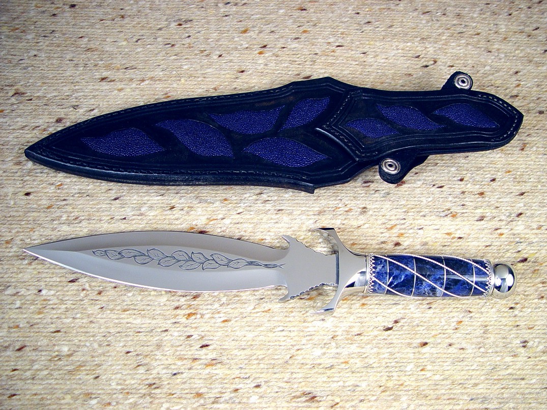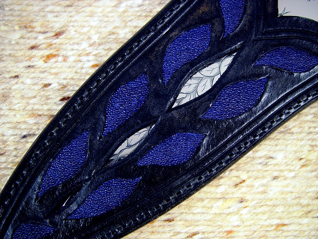 Sheath: Blue Stingray Skin inlaid in hand-carved leather shoulder, nickel plated steel snaps