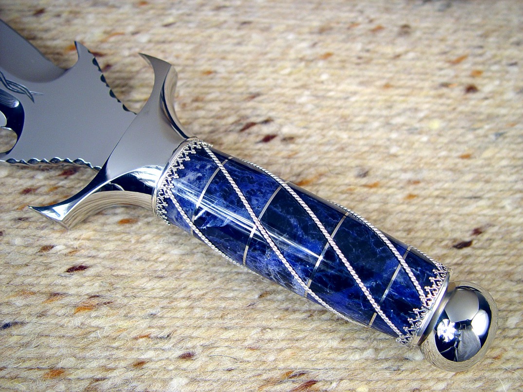 clear, oval and solid mirror finished pommel threaded on to the hidden tang. The handle is made of black matrix Sodalite