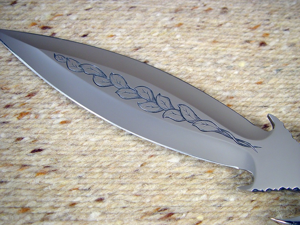hand-engraved intertwining leaves in a simple, clean design at the client's request. The dagger grinds are terminated at