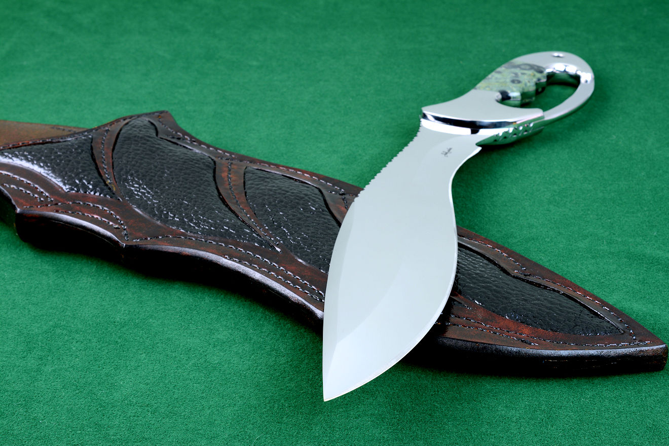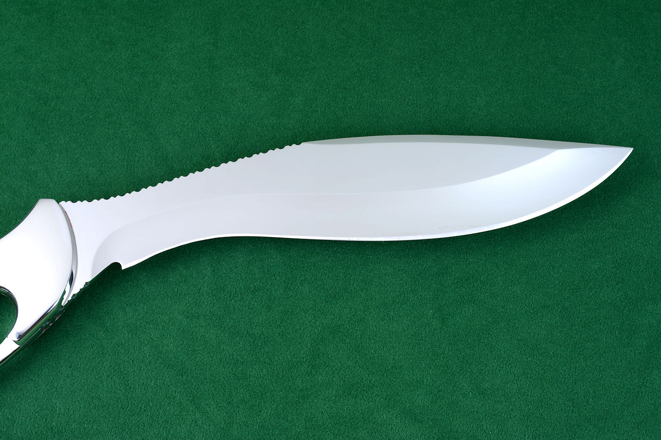 For the blade, I chose ATS-34 high molybdenum stainless steel, and sub-zero processing in the heat treating with triple tempering for maximum toughness of the blade. The high molybdenum in this blade contributes greatly to the toughness, and the alloy is very wear resistant as well. I hollow ground the blade accurately, while leaving adequate thickness at the edge to support the weight of the blade during a cut. This is not a chopping tool or an axe, it's a very large and razor-keen knife. The point is strong yet reduced in profile with the top swage, and the recurve area is double-convex in geometry for an incredibly thin cutting edge, something fine khukris are known for. The massive spine flat supports the entire blade, which is finished to a mirror polish for corrosion resistance, easy cleaning, and beauty.