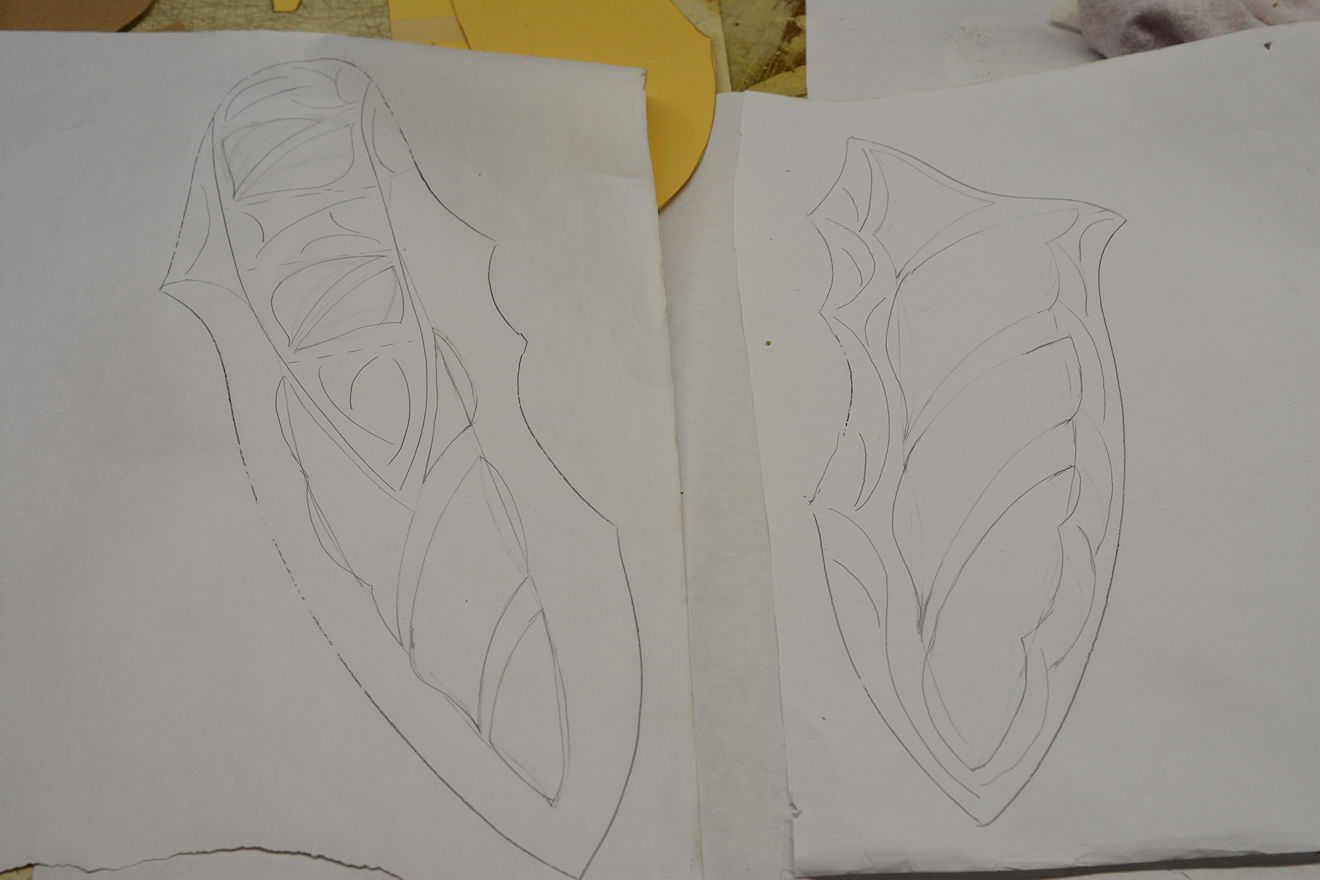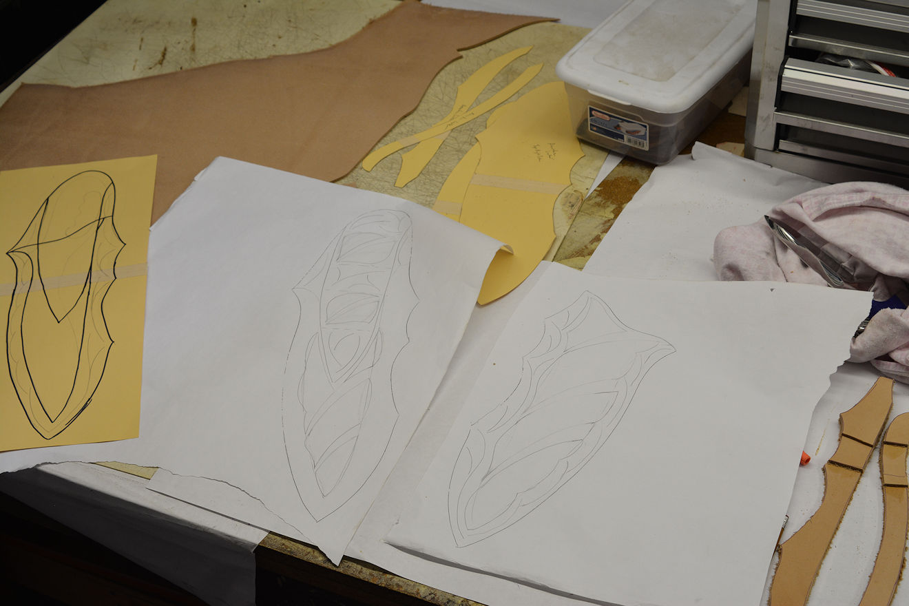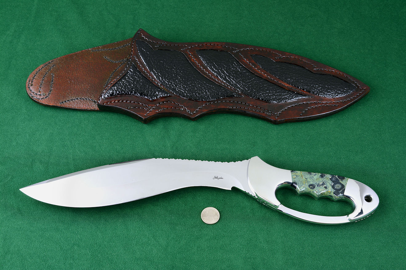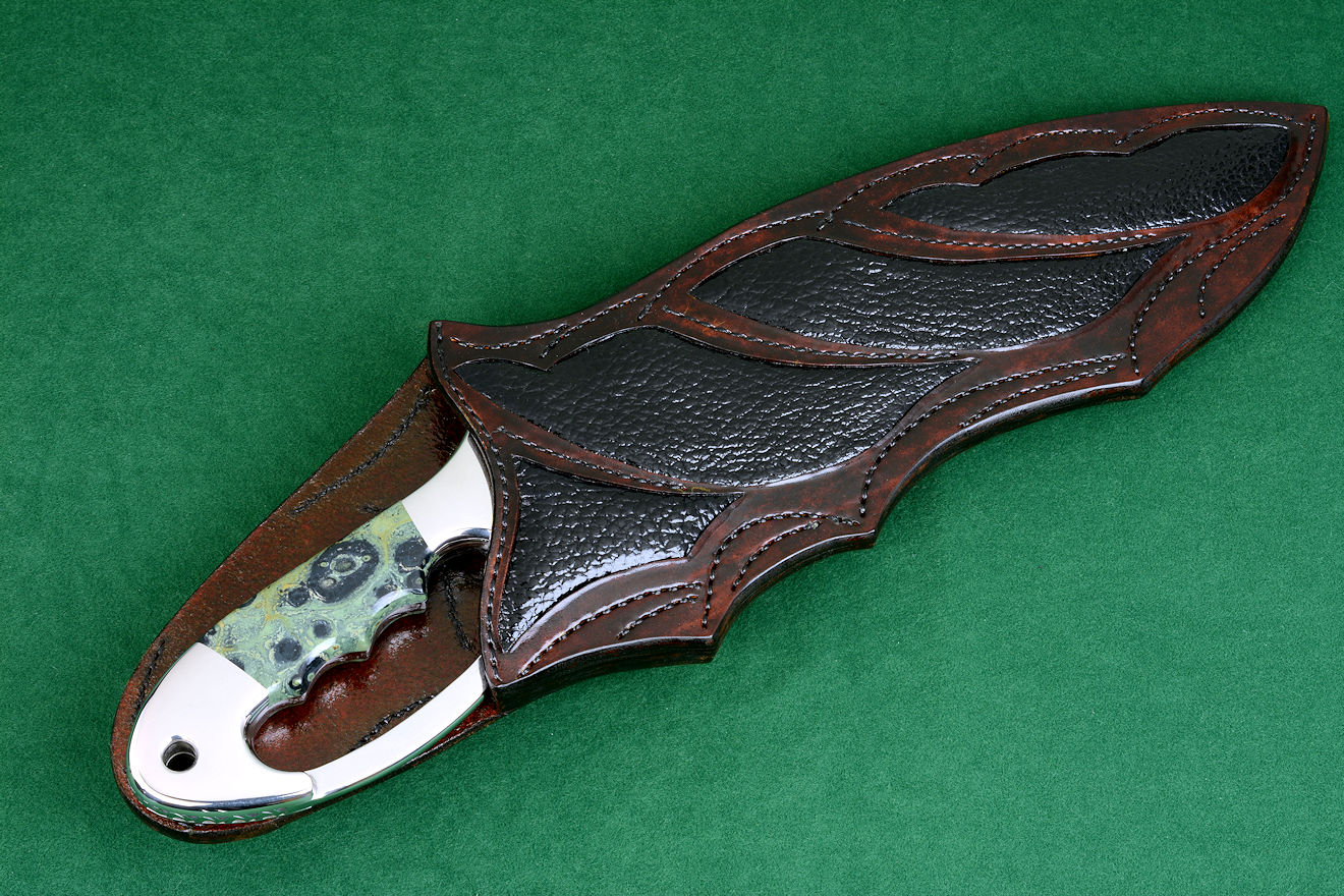 Looking at the Ananke sheathed in meticulously hand-carved leather shoulder demonstrates the very fine work of knifemaking art that I've been blessed to do for the last four decades. My client wanted a refined sheath to accompany this knife in traditional fashion, one not too overstated, but commensurate with the knife. I hand-carved the large sheath in 10 oz. leather shoulder with a dozen sizeable inlays, into which I mounted black glazed buffalo skin panels. The sheath is intensively hand-stitched with black polyester in a curvaceous, artistic fashion, before, during, and after assembly of the sheath. This took some extensive planning, and you can see my drawings of the idea in photos at the bottom of this page.